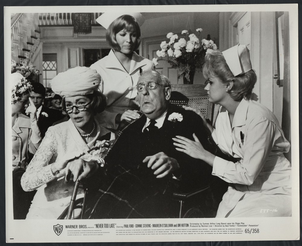 Never Too Late ’65 MAUREEN O’SULLIVAN PAUL FORD NURSES This vintage original still shows a VERY RARE photo of PAUL FORD being steadied by two NURSES and MAUREEN O’SULLIVAN (on the left). Moviephoto from the movie: Never Too Late Year of the photo: 1965 Size of the photo: Approximately 8 x 10 Other members of the cast (not necessarily in the movie still): Jane Wyatt Jim Hutton Connie Stevens Carmen Fara Lloyd Nolan Henry Jones Pamelyn Ferdin Sandra Gregg Ted Blair