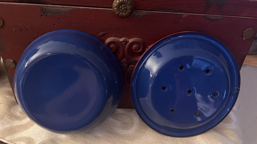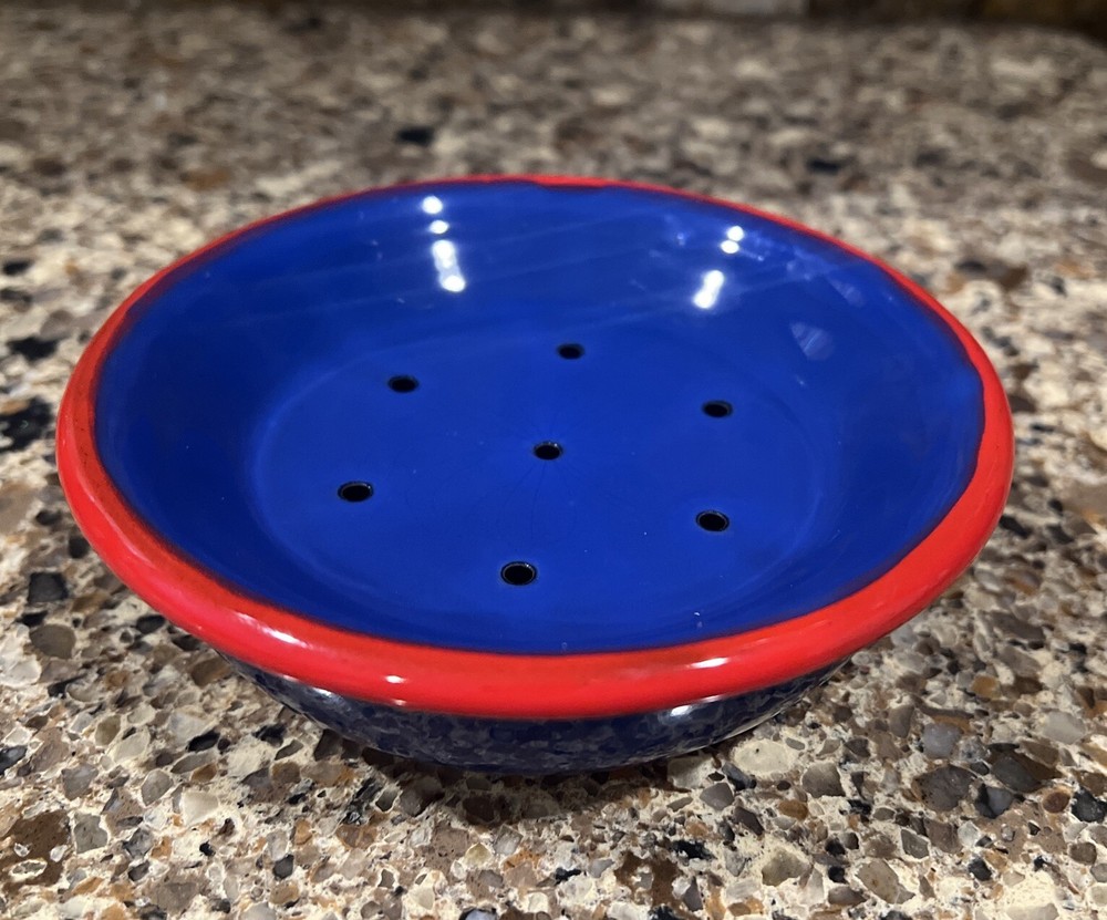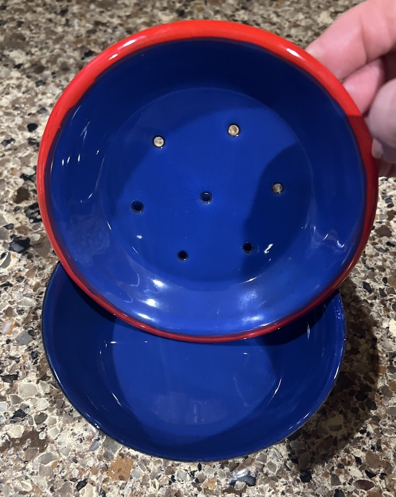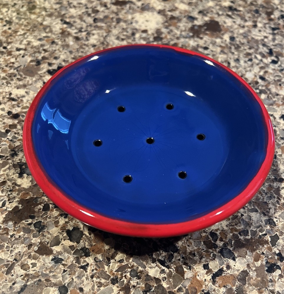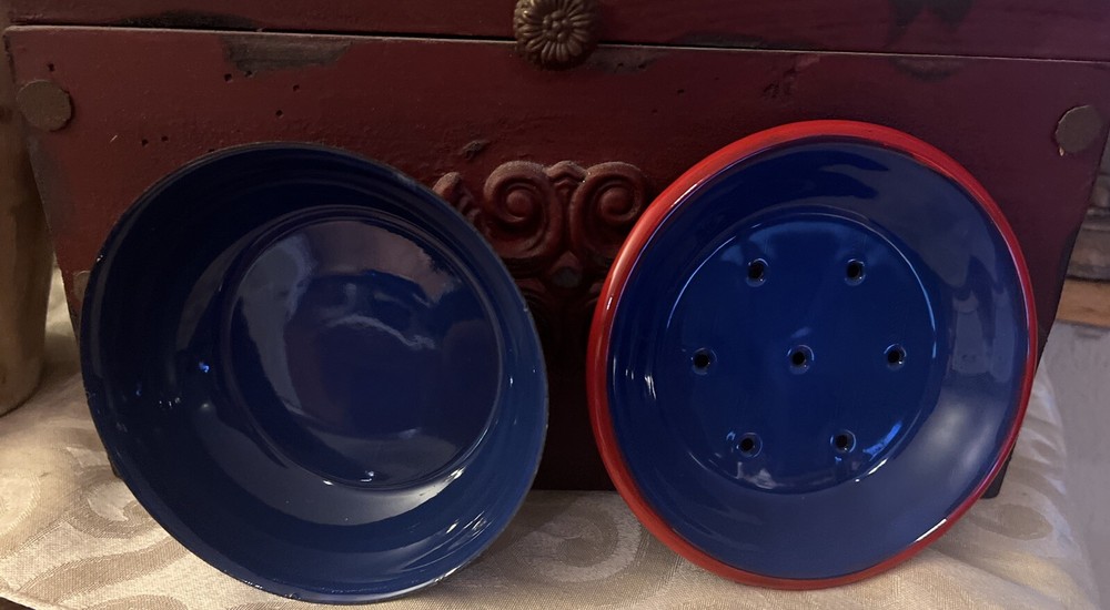 5" Round Enameled Tin Soap Dish w Tray, Blue w Red Rim Two pieces, lid and bowl. From a smoking pet free home Fast shipping...