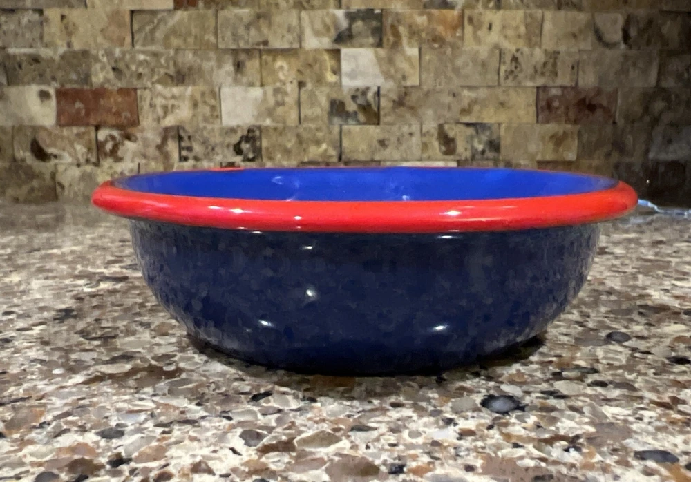 5" Round Enameled Tin Soap Dish w Tray, Blue w Red Rim Two pieces, lid and bowl. From a smoking pet free home Fast shipping