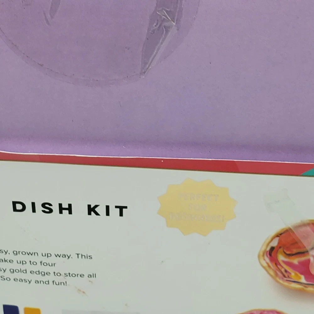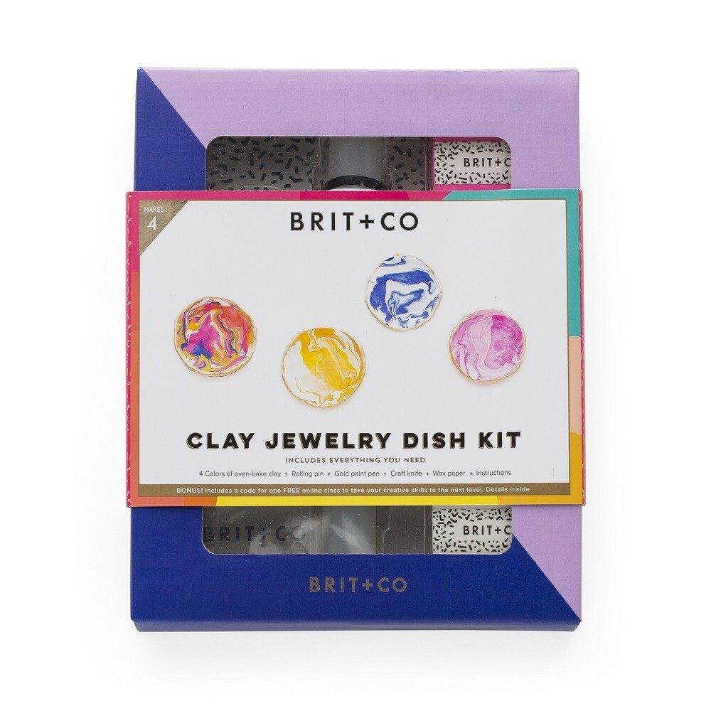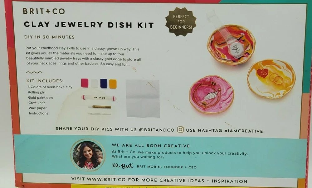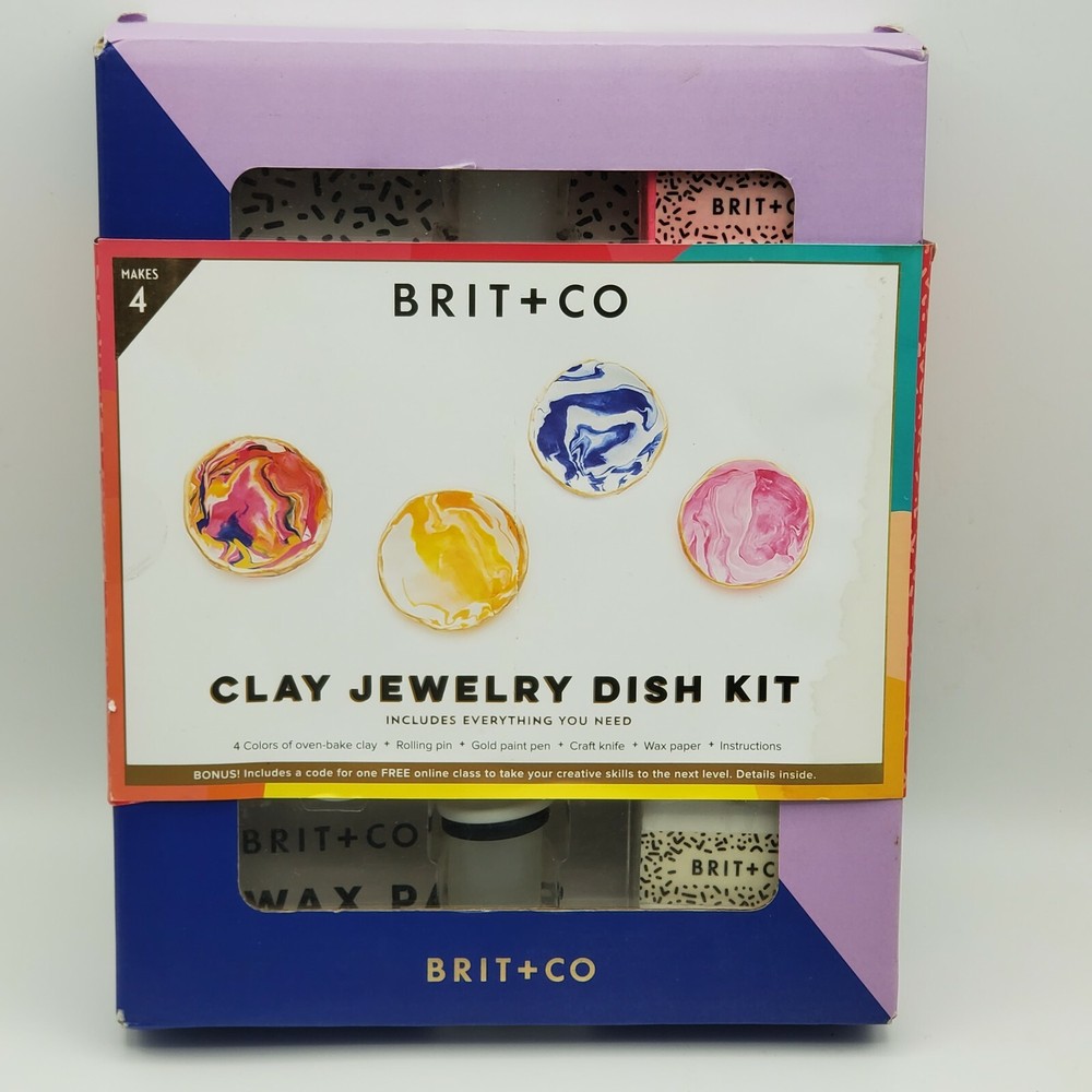 New in package Brit + Co creative clay jewelry dish kit. Makes up to 4 and comes with everything you need. Great gift. There is a small water stain on the removable cardboard label as shown in the last picture.