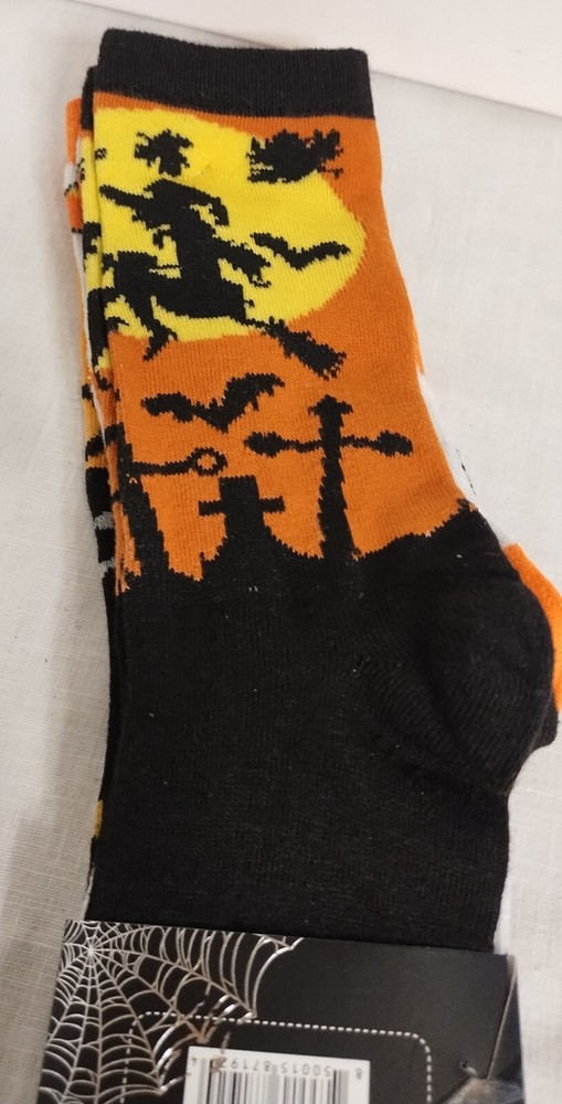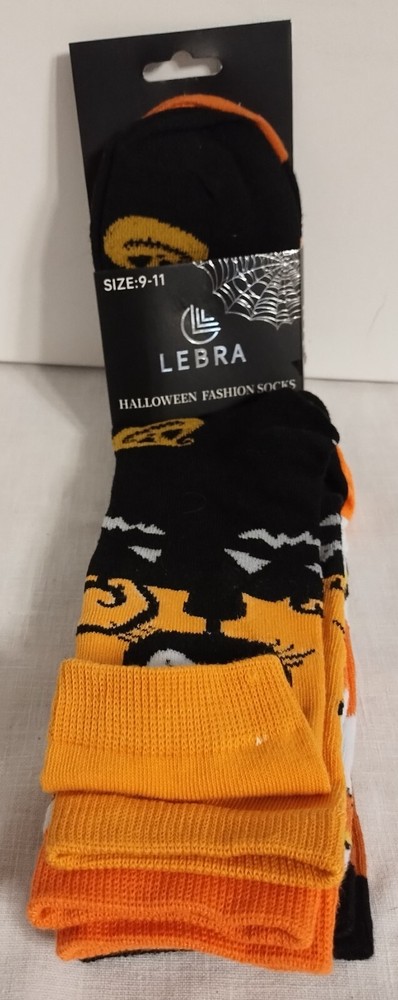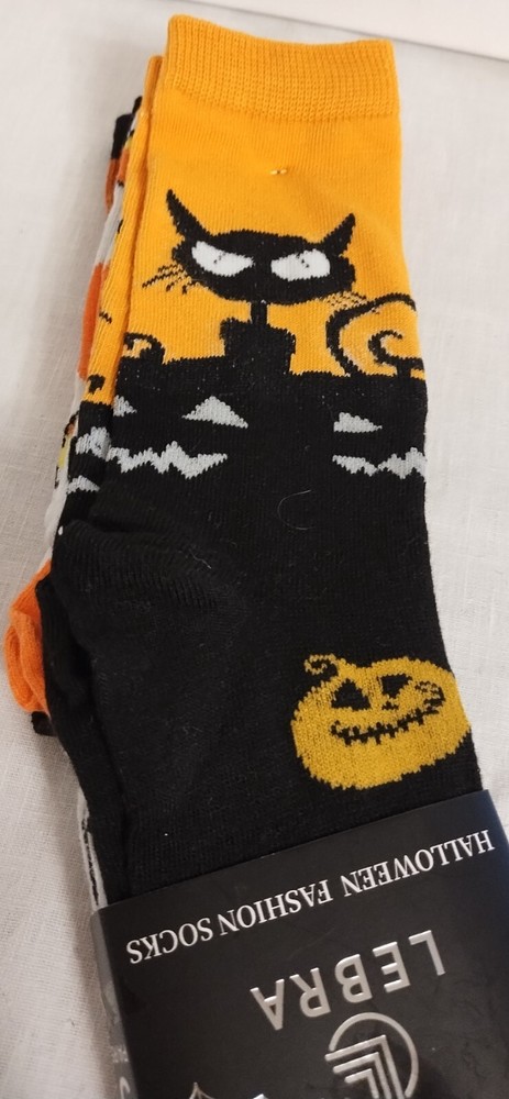 These are New Lebra Halloween Fashion Socks in a size 9-11, designed in a vibrant orange, white and black. The socks are crafted in a crew style with a mid-calf length, making them perfect for adding a fun and festive touch to any Halloween outfit. Made from 100% cotton material, these socks are not only stylish but also comfortable to wear. Perfect for those who want to showcase their Halloween spirit through their fashion choices.