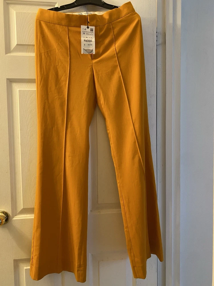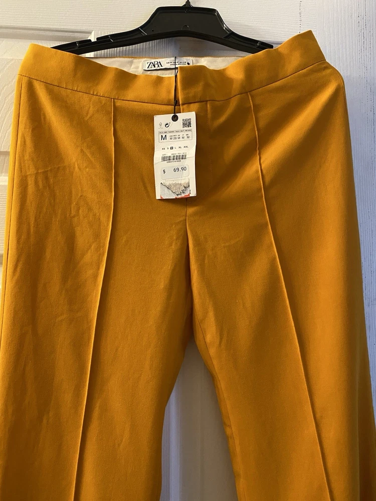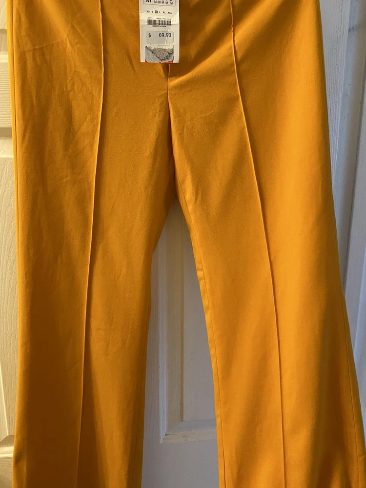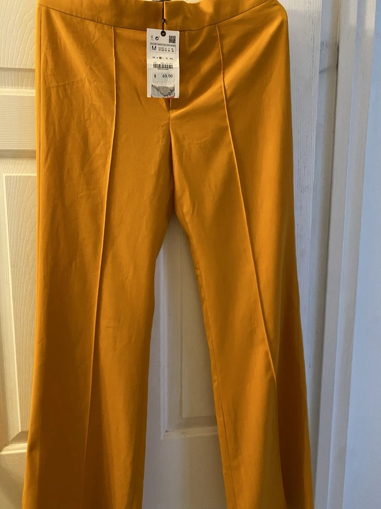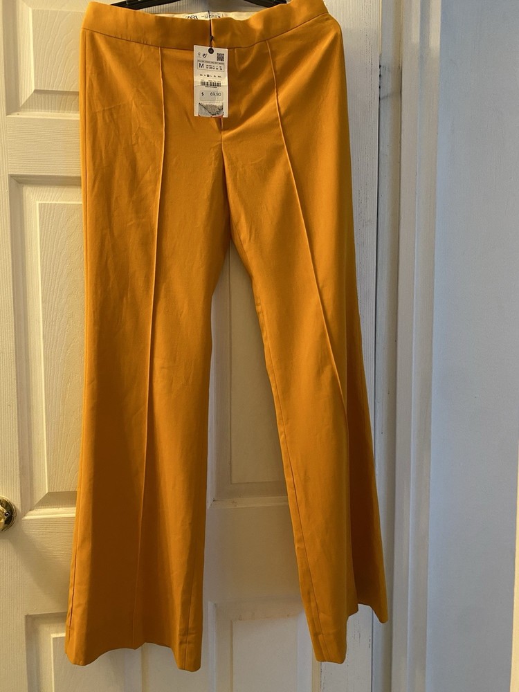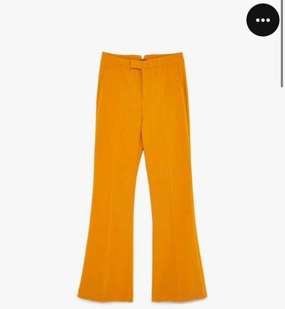 New Zara Mid-waist trousers with a wide-leg design and zip fly, inner button and metal hook fastening at the front. The color is beautiful its orange but on the deep side and hs a flare style giving that chic & sophisticated look perfect for Summer ans Spring. There is a little run at the back (please see photo) Materials Outer shell 68% polyester Viscose 29% Elastane 3% Made in Morocco Waist 32” Length 43” I have a Blazer that matches it and its in a separate listing. Check my profile or message me. This is a no return policy so please let me know if you have any questions or wants more photos. Thank you