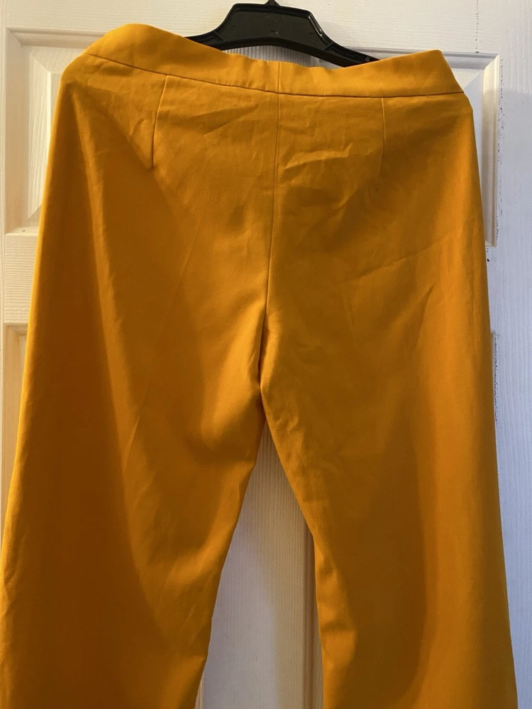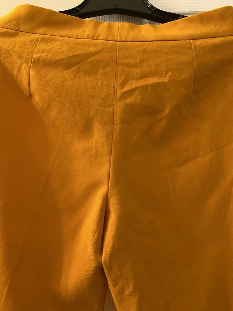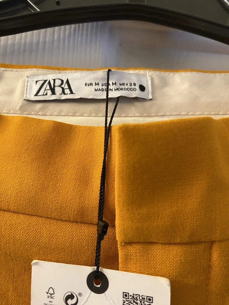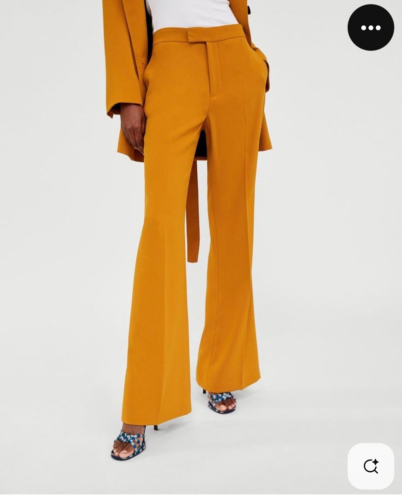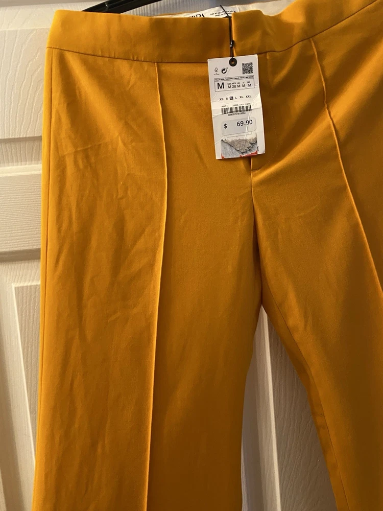 New Zara Mid-waist trousers with a wide-leg design and zip fly, inner button and metal hook fastening at the front. The color is beautiful its orange but on the deep side and hs a flare style giving that chic & sophisticated look perfect for Summer ans Spring. There is a little run at the back (please see photo) Materials Outer shell 68% polyester Viscose 29% Elastane 3% Made in Morocco Waist 32” Length 43” I have a Blazer that matches it and its in a separate listing. Check my profile or message me. This is a no return policy so please let me know if you have any questions or wants more photos. Thank you