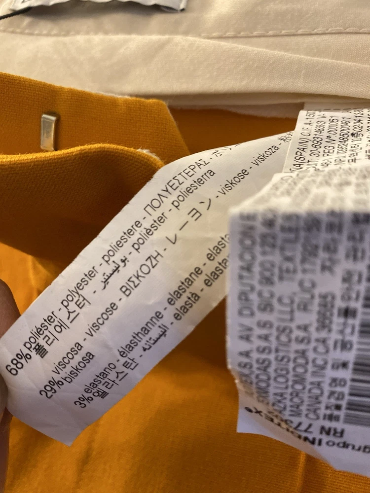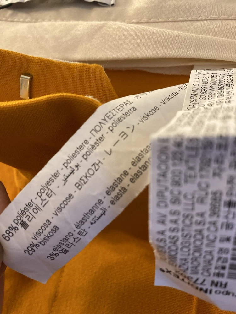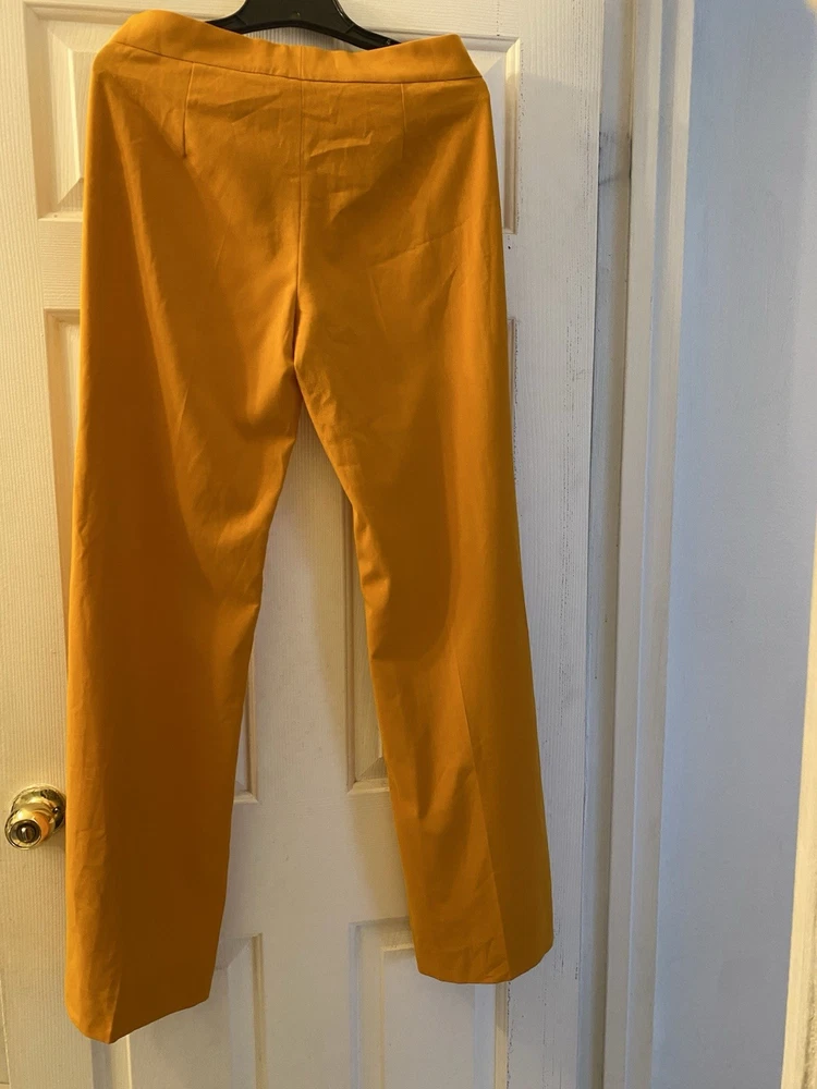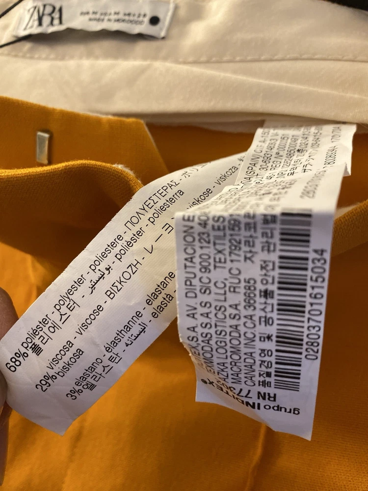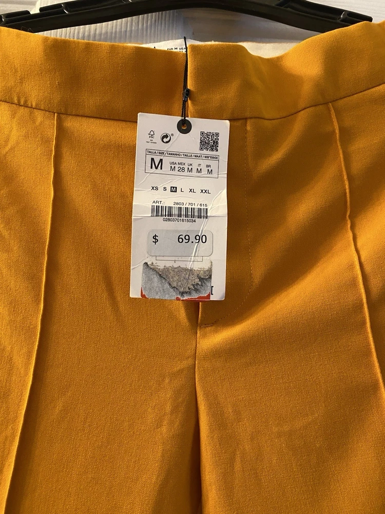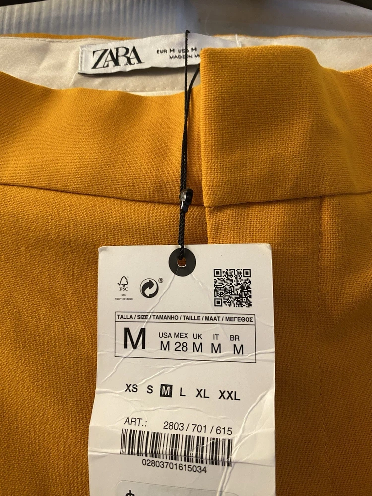 New Zara Mid-waist trousers with a wide-leg design and zip fly, inner button and metal hook fastening at the front. The color is beautiful its orange but on the deep side and hs a flare style giving that chic & sophisticated look perfect for Summer ans Spring. There is a little run at the back (please see photo) Materials Outer shell 68% polyester Viscose 29% Elastane 3% Made in Morocco Waist 32” Length 43” I have a Blazer that matches it and its in a separate listing. Check my profile or message me. This is a no return policy so please let me know if you have any questions or wants more photos. Thank you
