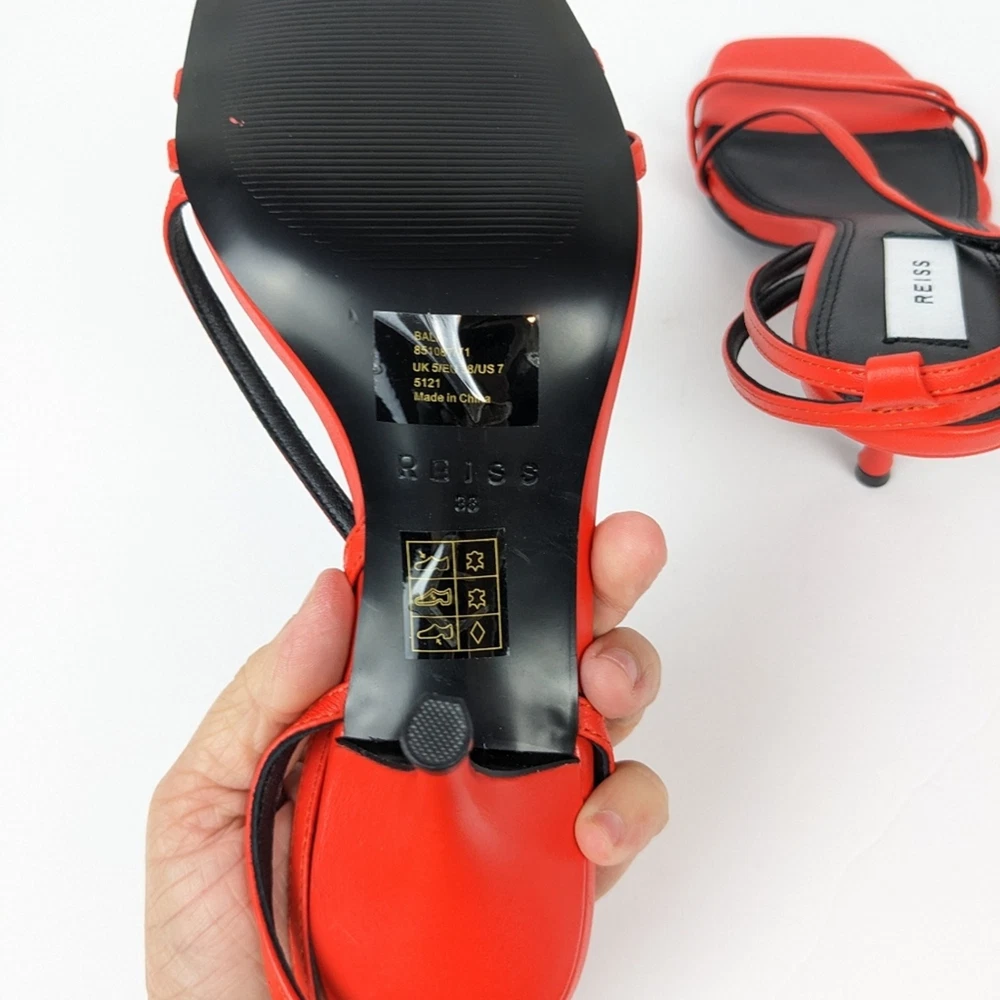 Absolutely love these Reiss heels! The orange Bali leather is stunning, and the strappy mid-heel design is both stylish and comfortable. The double toe straps and buckle closure give them a chic, secure fit, while the square toe adds a modern touch. Perfect for dressing up any outfit—they feel luxurious and look high-end. True to size, and the leather is buttery soft. A fantastic investment piece!