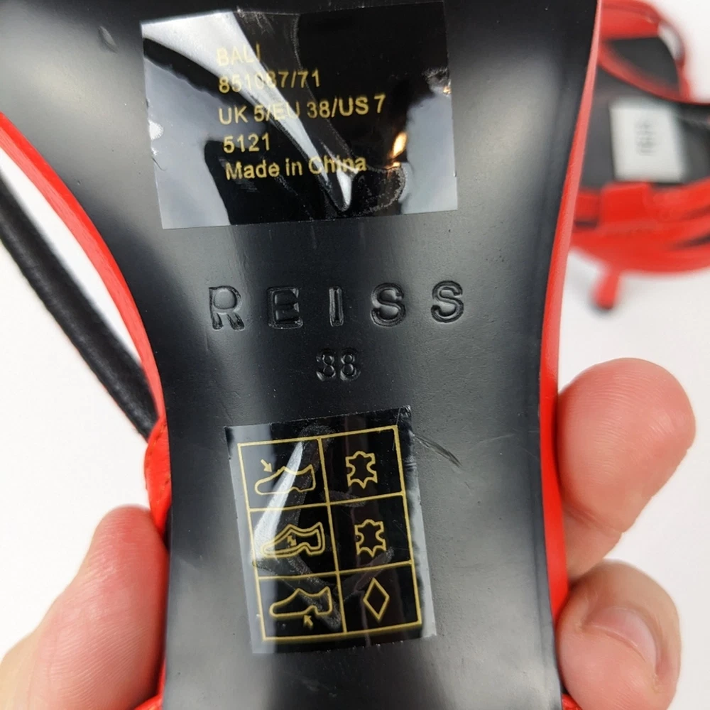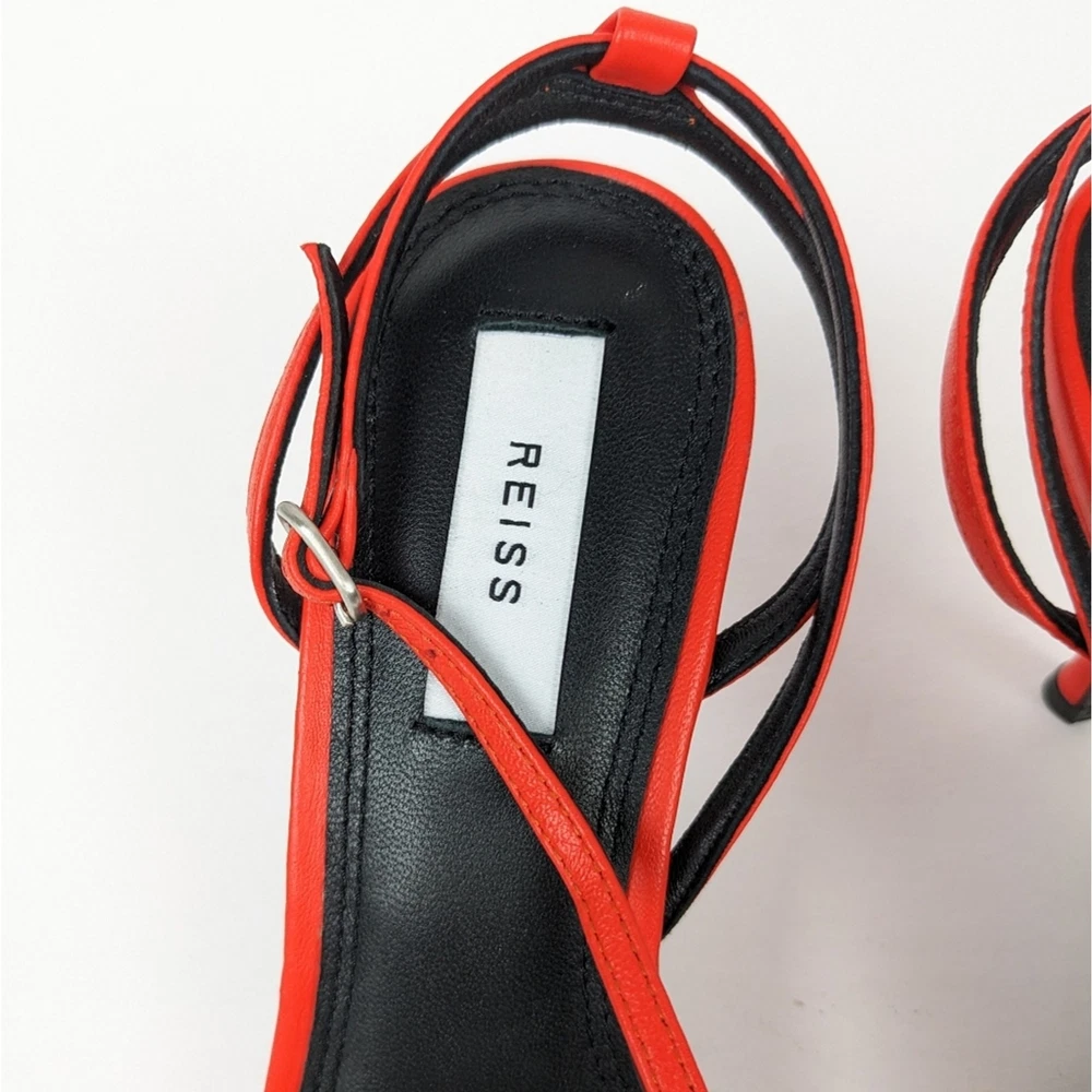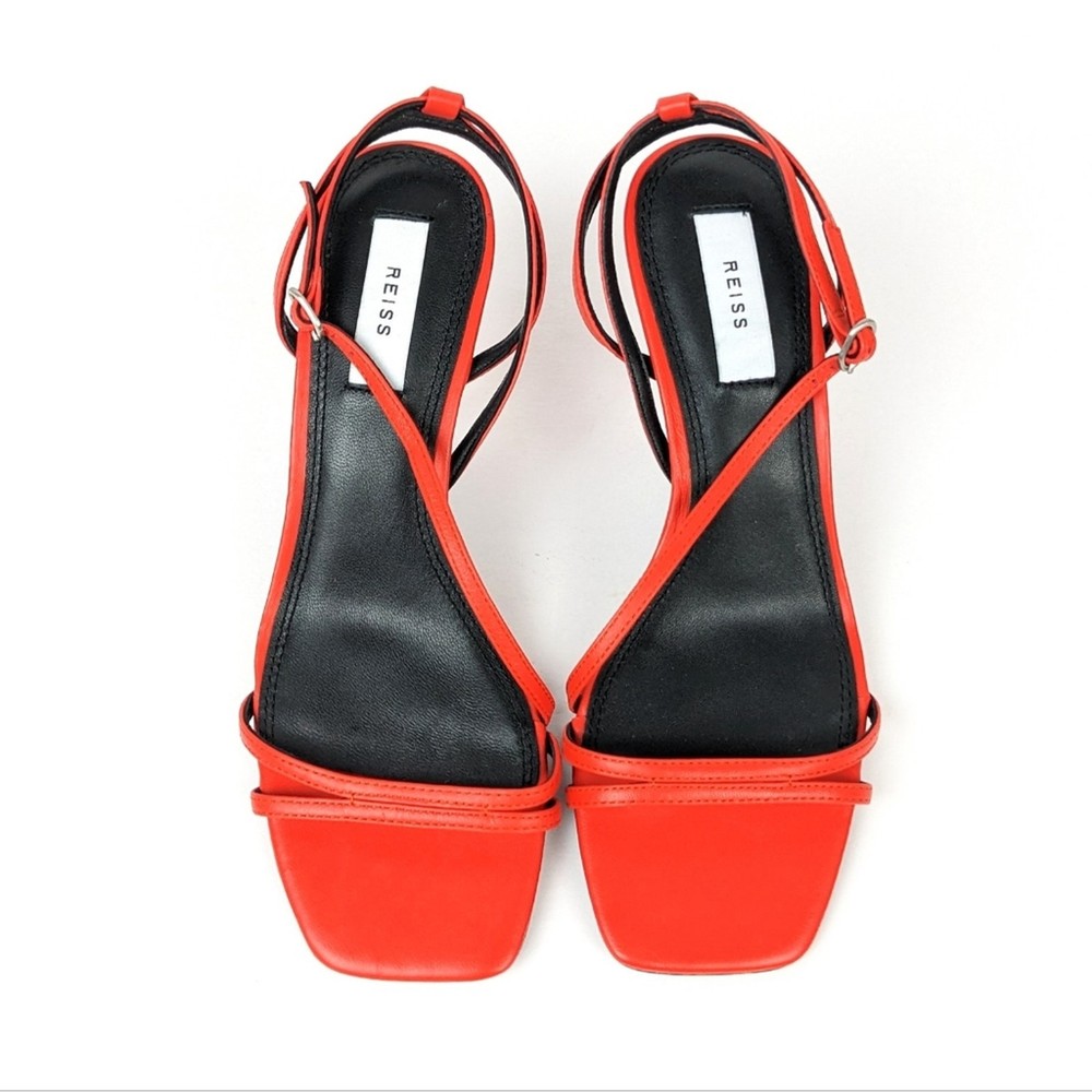 <![CDATA[<div>Reiss Orange Bali Leather Strappy Mid Heels. Crafted from leather with a mid-heel and intricate stitch detailing, the double toe straps and cross-over design ensure this pair are as comfortable as they are stylish. Wear with tailored ensembles for the ultimate chic look. 100% leather. Double toe strap. Cross-over fastening design. Buckle close. Mid-heel. Square toe finish. NWT ($240.) Size 38 (US 7.5.)