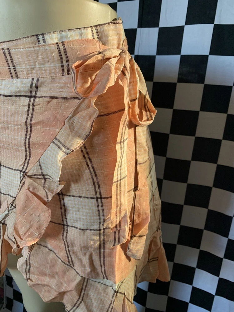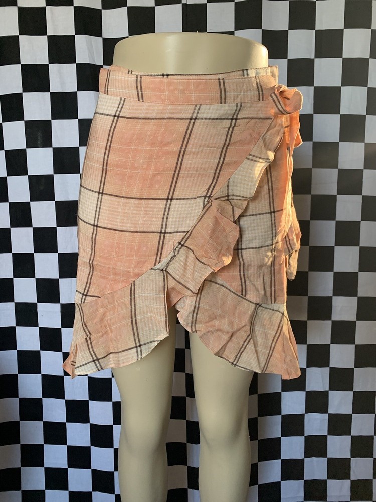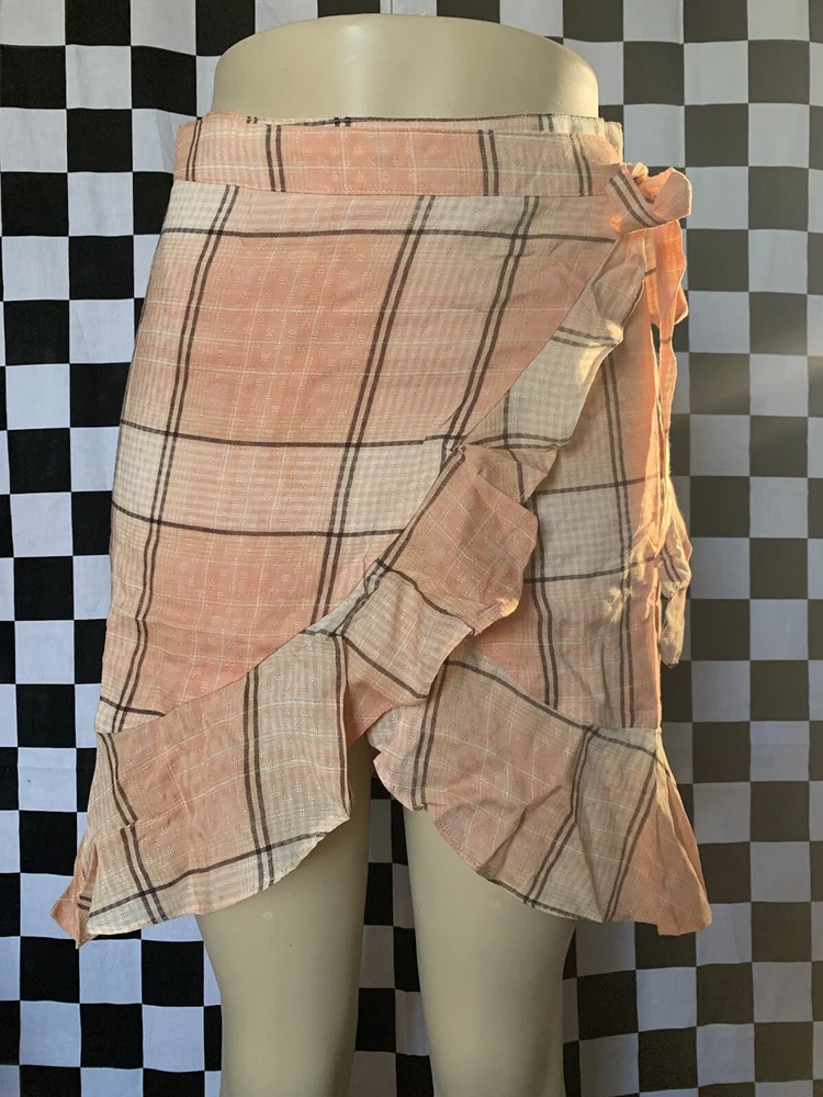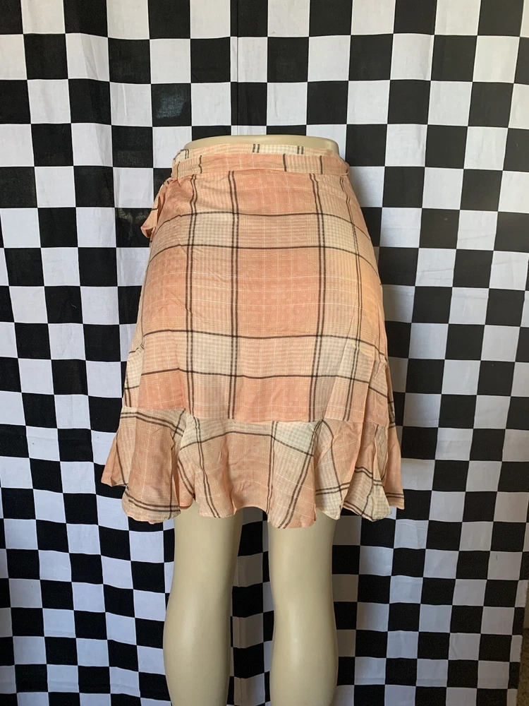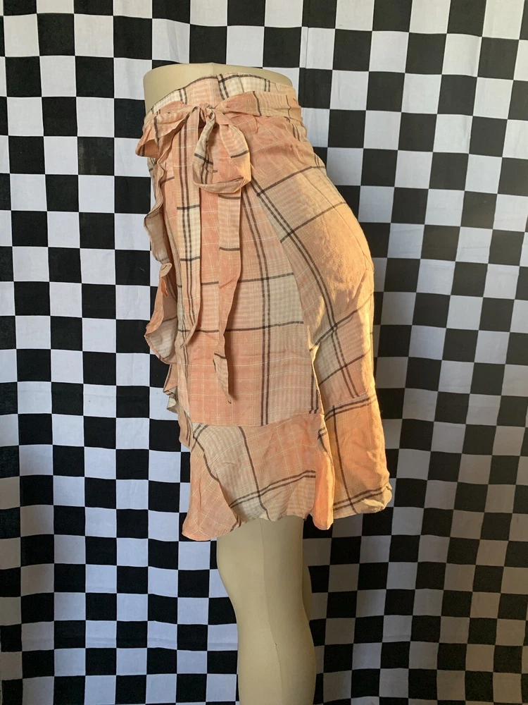 MEASUREMENTS: LYING FLAT UNSTRETCHED WAIST: 16.5” - 22”… ADJUSTABLE LENGTH: Front 16” … back 21” This is for an AWESOME PLAID Wrap skirt size LARGE !! It’s a PRETTY PEACH PLAID color Skirt with BLACK & WHITE Lines that make up the plaid!! It’s a WRAP AROUND skirt with a Side tie closure!! It has a RUFFKE that runs all the way around the skirt, CUTE!!! It’s made out of 100% RAYON , so it’s LIGHTWEIGHT and flowy! It’s BRAND NEW without tags!!
