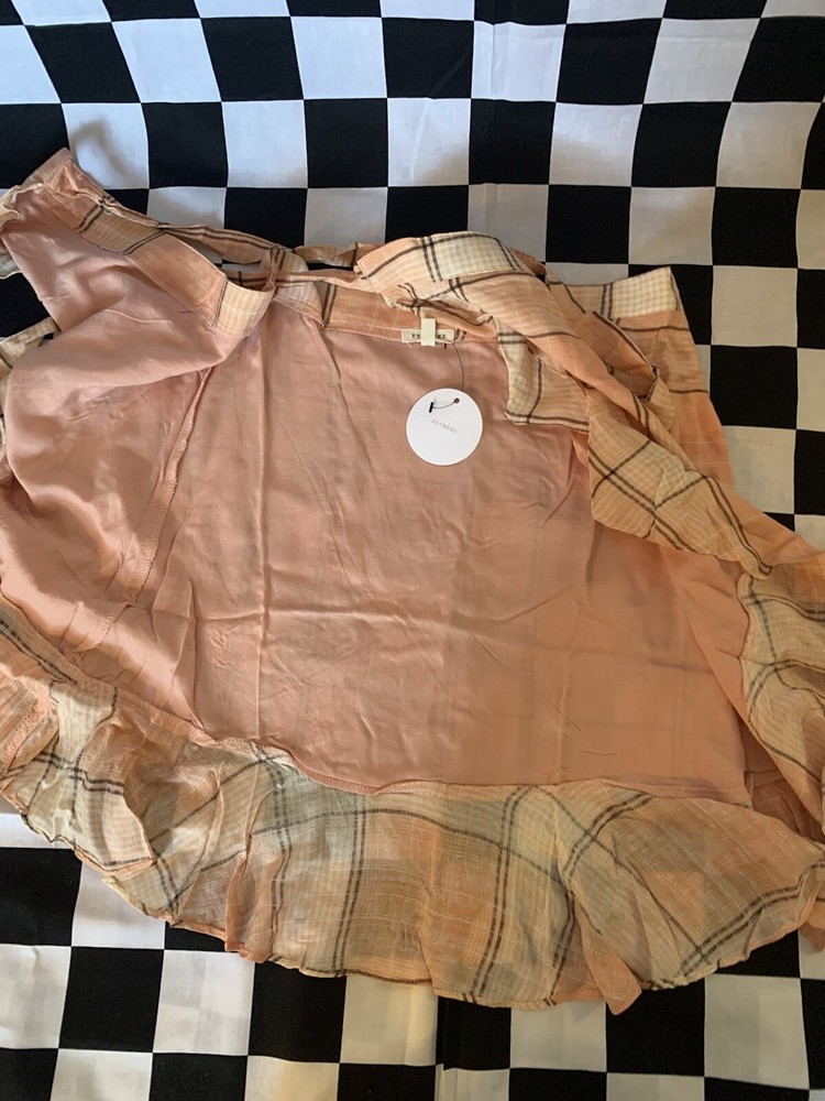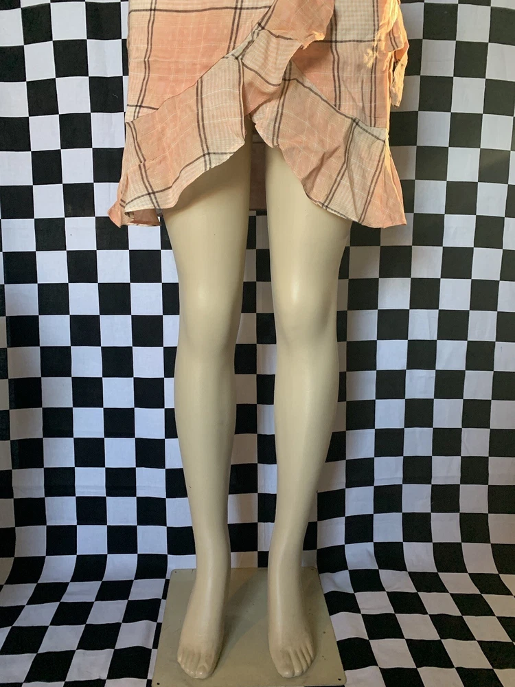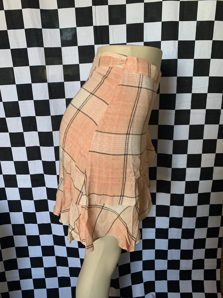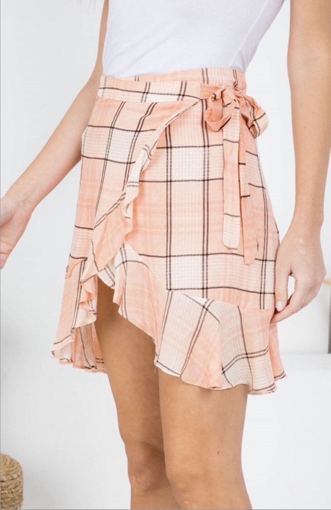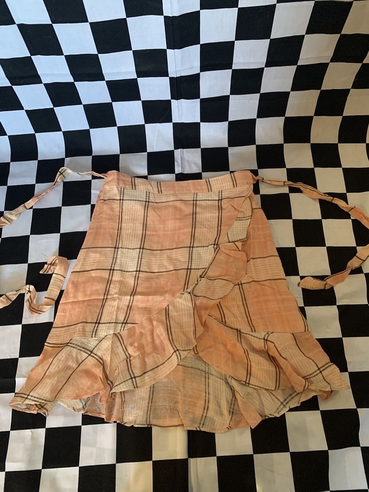 MEASUREMENTS: LYING FLAT UNSTRETCHED WAIST: 16.5” - 22”… ADJUSTABLE LENGTH: Front 16” … back 21” This is for an AWESOME PLAID Wrap skirt size LARGE !! It’s a PRETTY PEACH PLAID color Skirt with BLACK & WHITE Lines that make up the plaid!! It’s a WRAP AROUND skirt with a Side tie closure!! It has a RUFFKE that runs all the way around the skirt, CUTE!!! It’s made out of 100% RAYON , so it’s LIGHTWEIGHT and flowy! It’s BRAND NEW without tags!!
