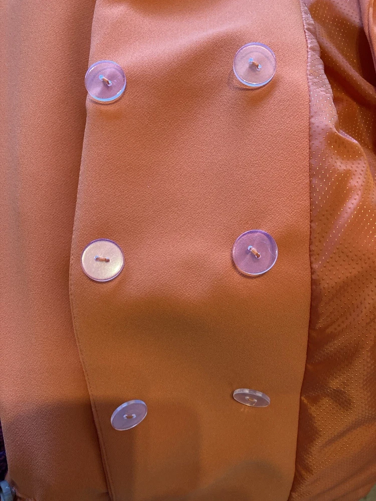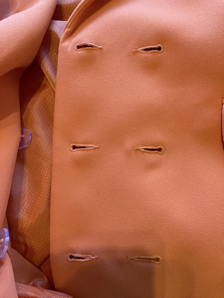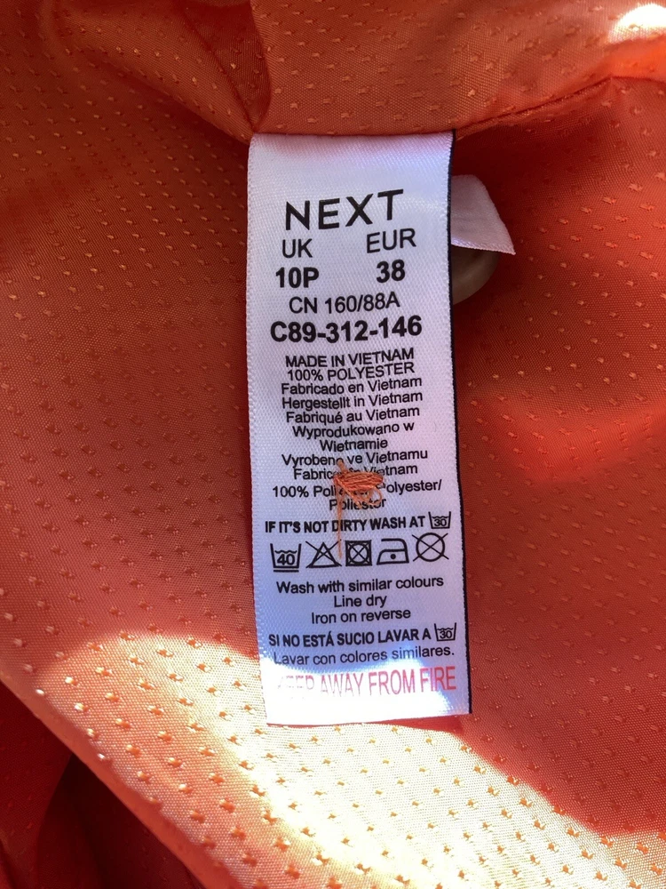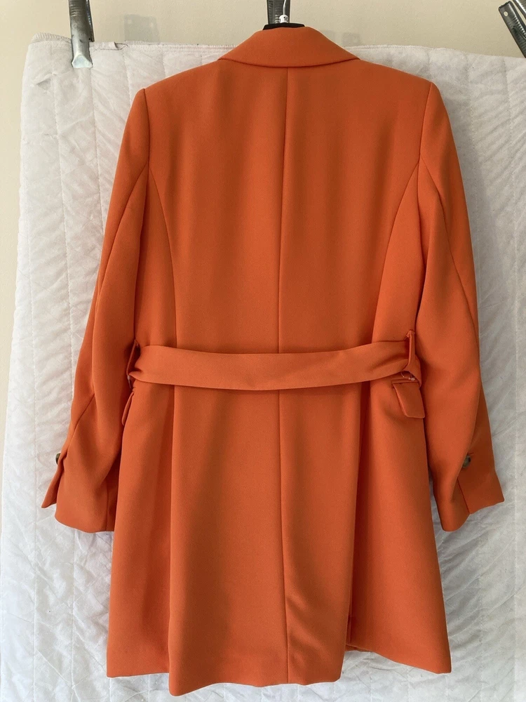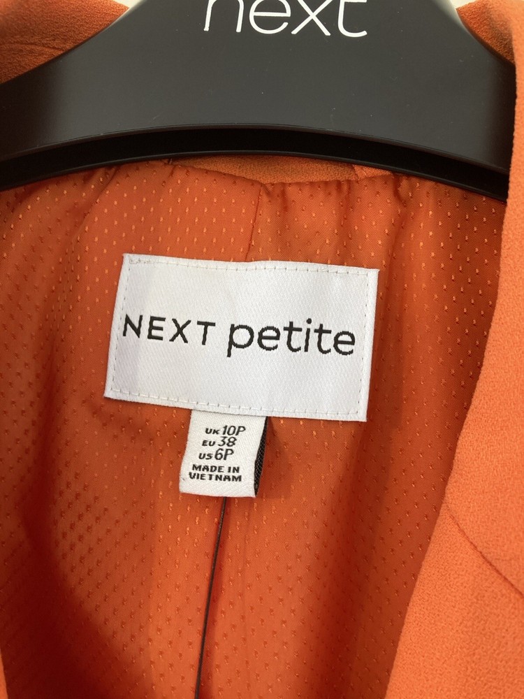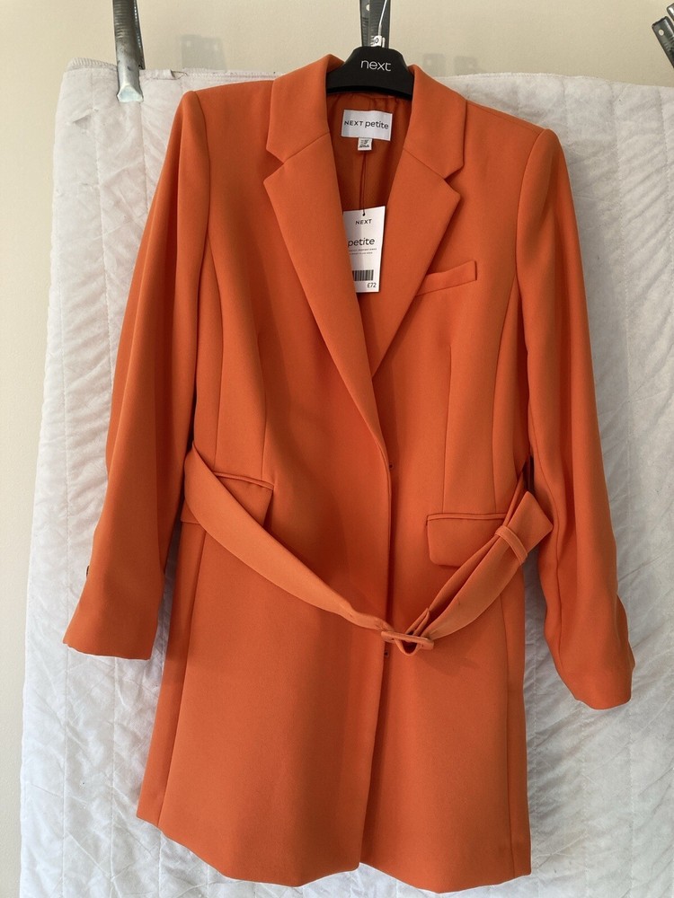 Introducing this stylish Next belted jacket in a striking orange colour, perfect for any formal or business occasion. The jacket is made from high-quality polyester material with a mid-length coat design, long sleeves and six-button closure. It features polyester lining, a collared neck, and belt accents to give a sophisticated look. This jacket is machine washable and has pockets for added convenience. It is available in size 10 Petite with fit suitable for all smaller body types. The Next Belted 6 Button Orange Jacket is perfect for all seasons, making it a great addition to any wardrobe. It was made in Vietnam and is now available at an affordable price.Bust 34”Pit to Pit 36”Length 32” BNWT RRP £72
