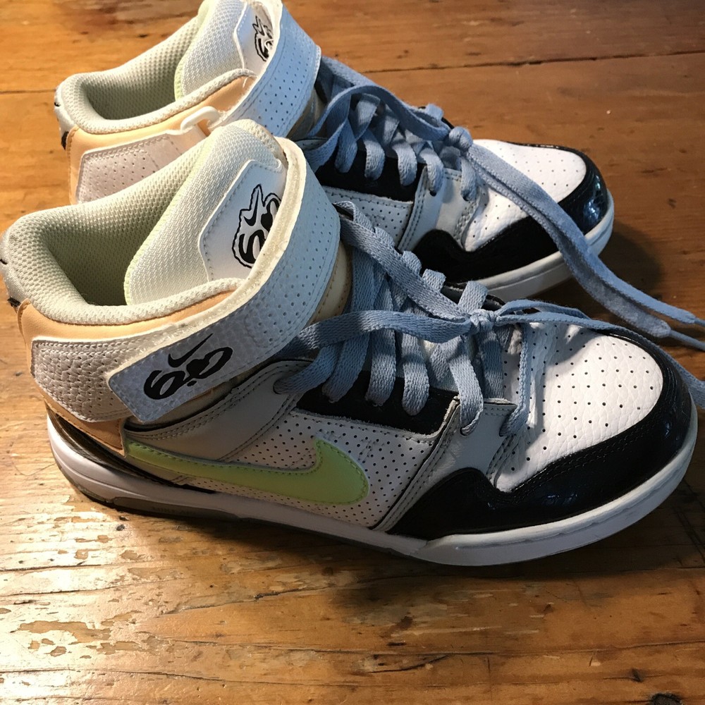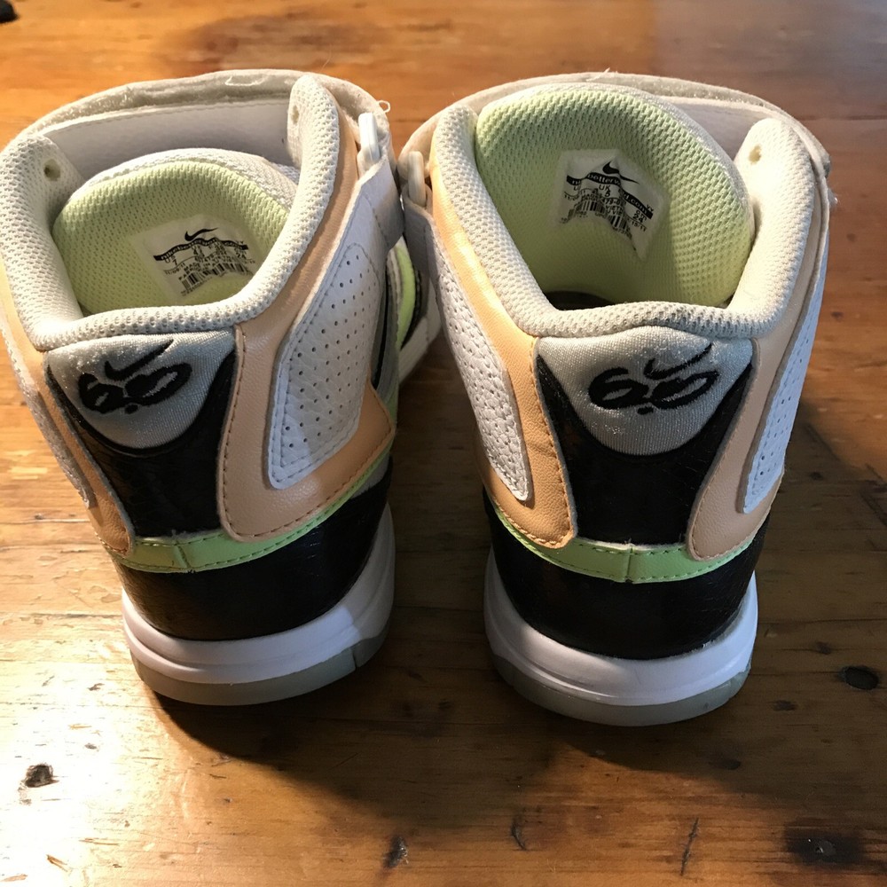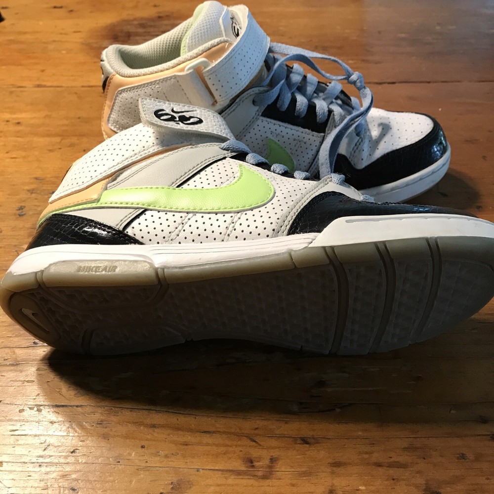 Nike 6.0 Air Morgan (without insoles) Mid 3/4 height Sz. 7 Women (4.5 UK/38 EUR) Product # 407479-034 Colors White/Black/peach/lime green and blue laces Velcro strap **NO INSOLES*** bring them back to life with your own insoles!! Preowned but Good condition No visible cracks or tears - show basic wear See photos for details Super fun shoe!!
