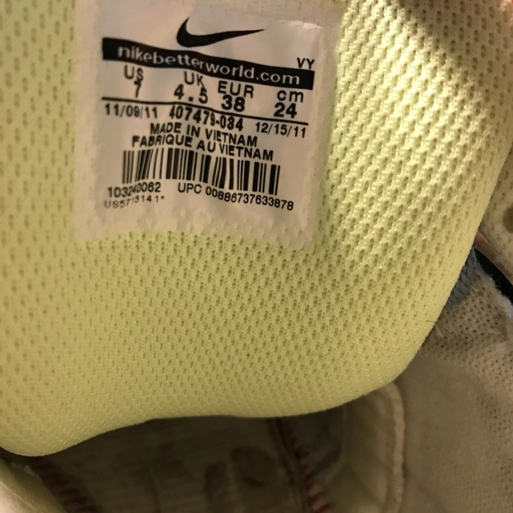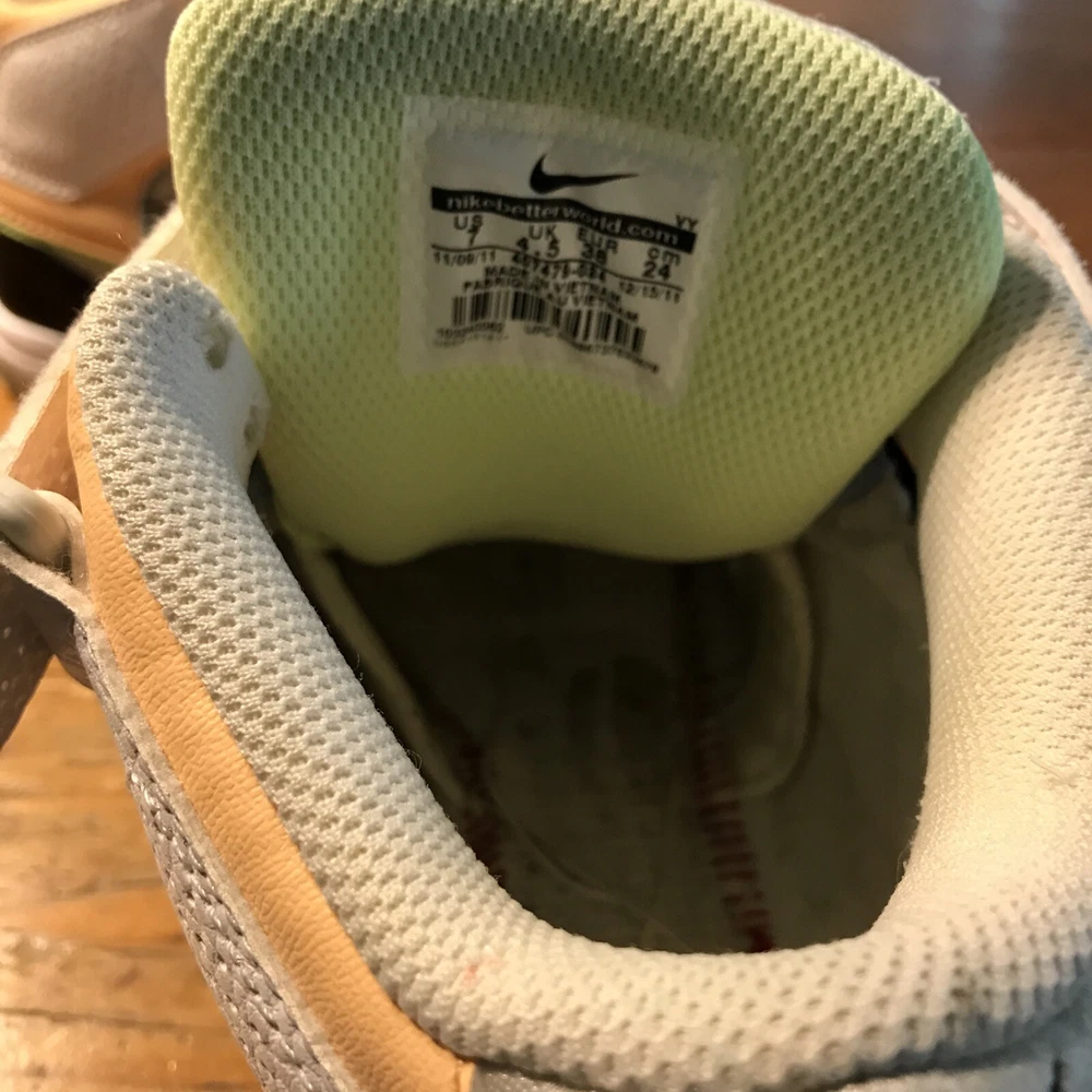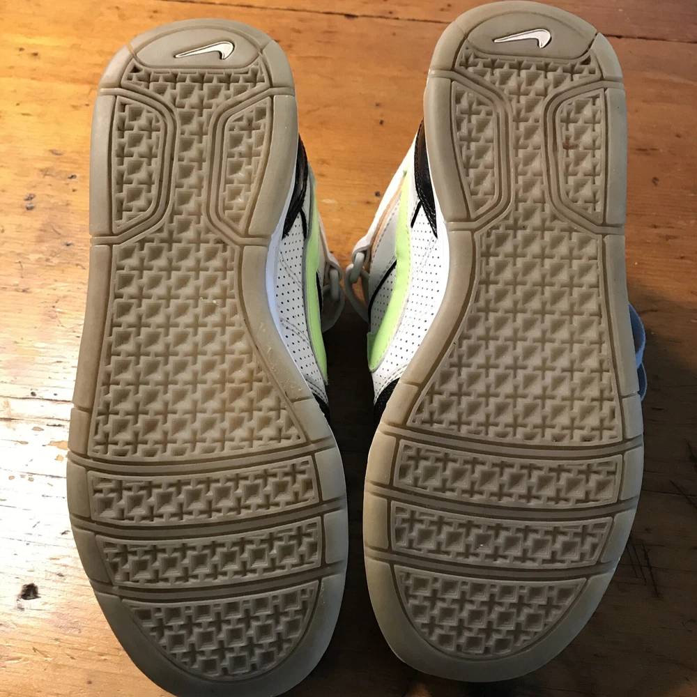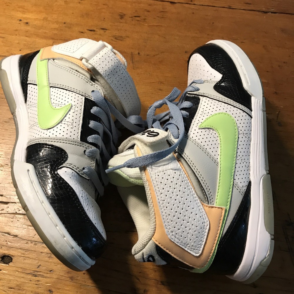 Nike 6.0 Air Morgan (without insoles) Mid 3/4 height Sz. 7 Women (4.5 UK/38 EUR) Product # 407479-034 Colors White/Black/peach/lime green and blue laces Velcro strap **NO INSOLES*** bring them back to life with your own insoles!! Preowned but Good condition No visible cracks or tears - show basic wear See photos for details Super fun shoe!!