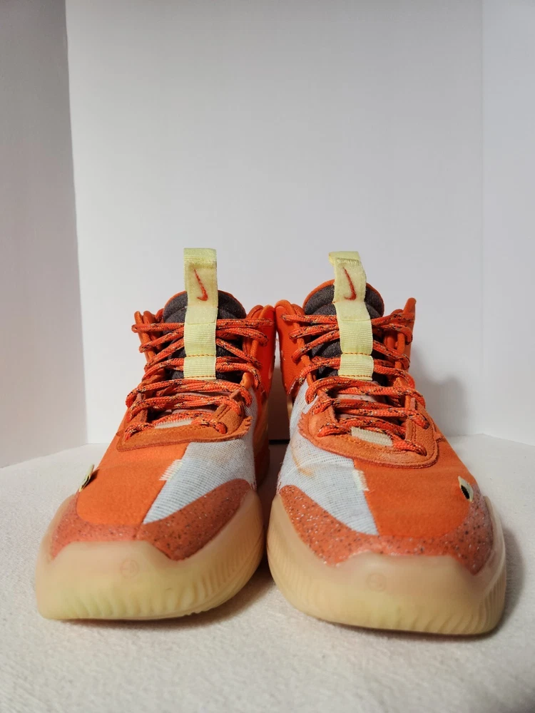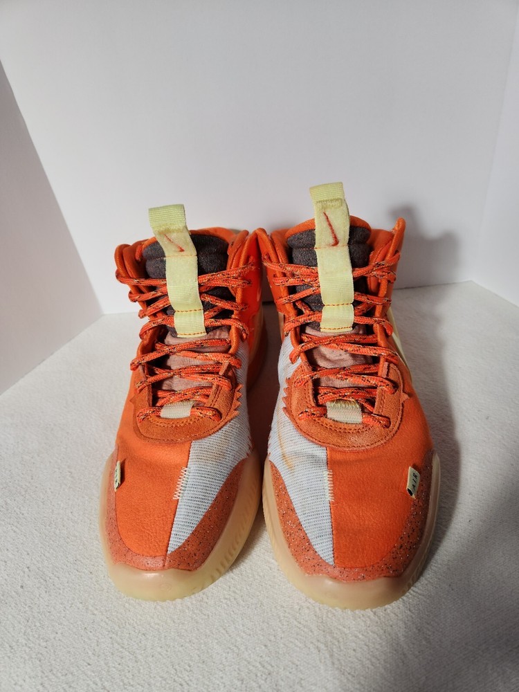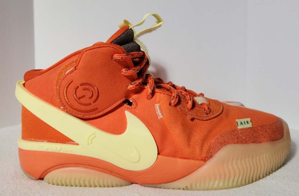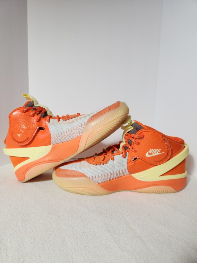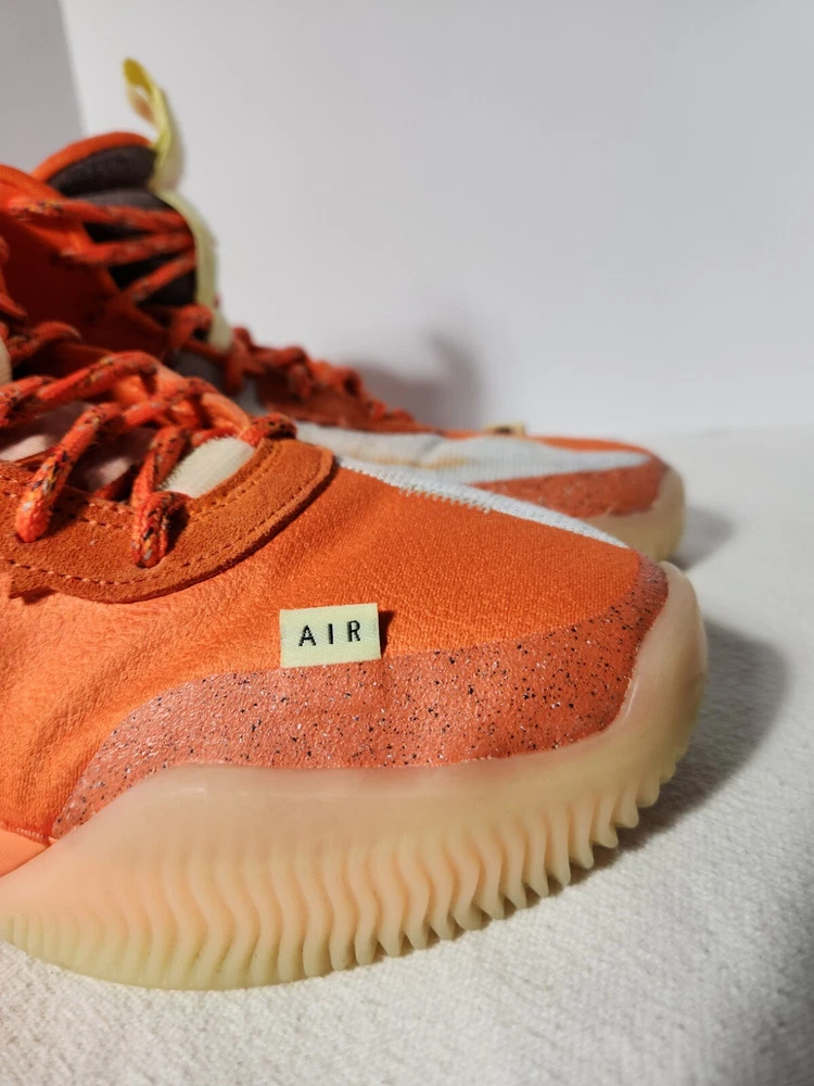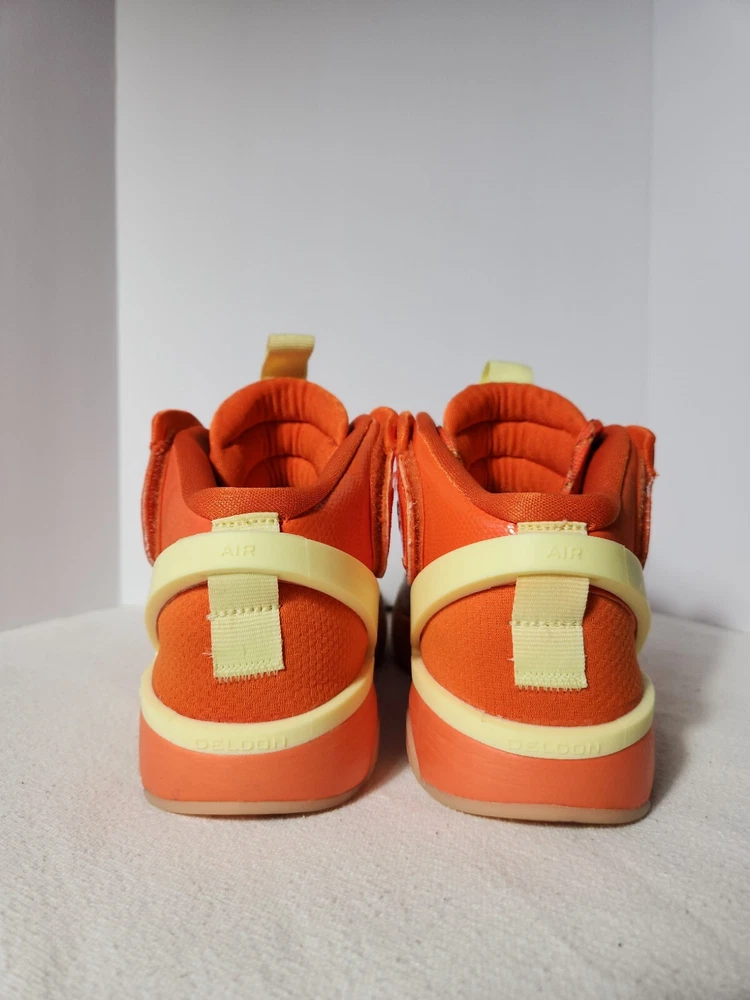 Elevate your activewear with these stylish Nike Air Deldon sneakers. These unisex mid-top shoes feature a solid orange color and a breathable mesh upper material, making them perfect for all-day wear. The lace-up and pull-on closure options provide a secure fit, while the cushioned foam insole and rubber outsole offer both comfort and performance. These athletic shoes are the perfect addition to any sneaker collection and are ideal for basketball or any other physical activity. The Nike Air product line ensures high-quality shoes that are built to last. The shoes are pre-owned but are in excellent condition, with no signs of wear and tear.