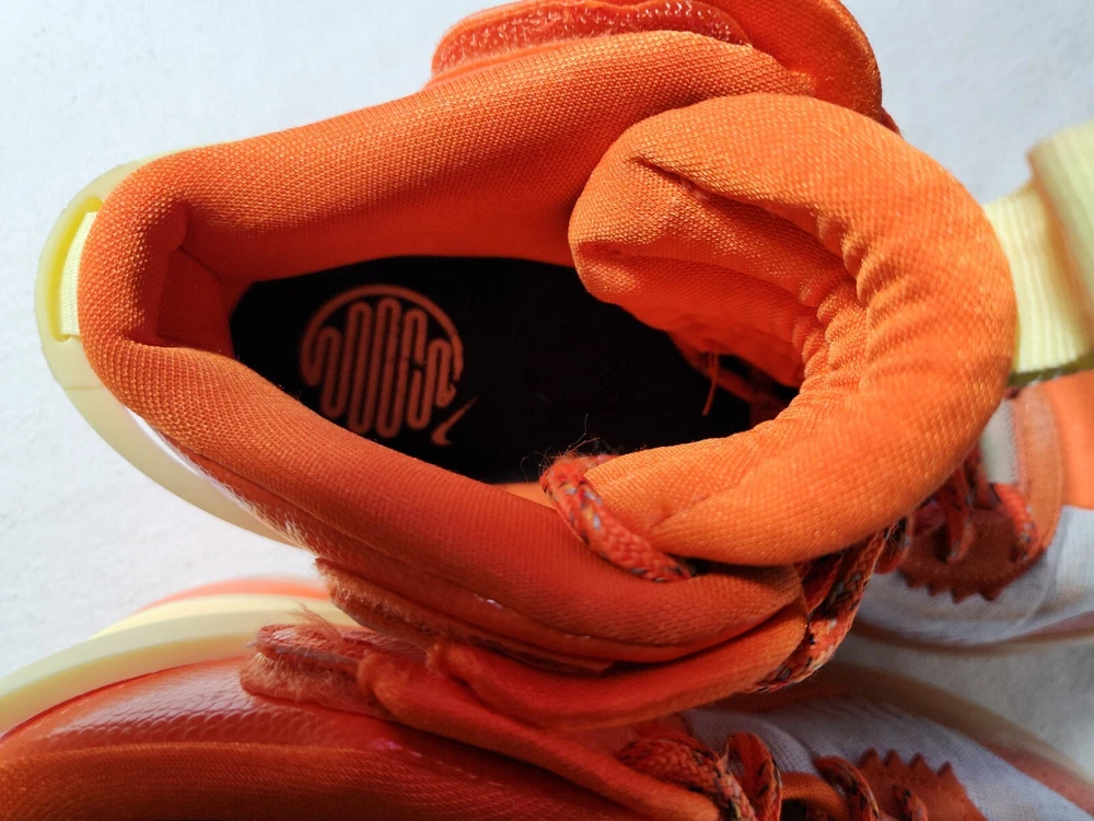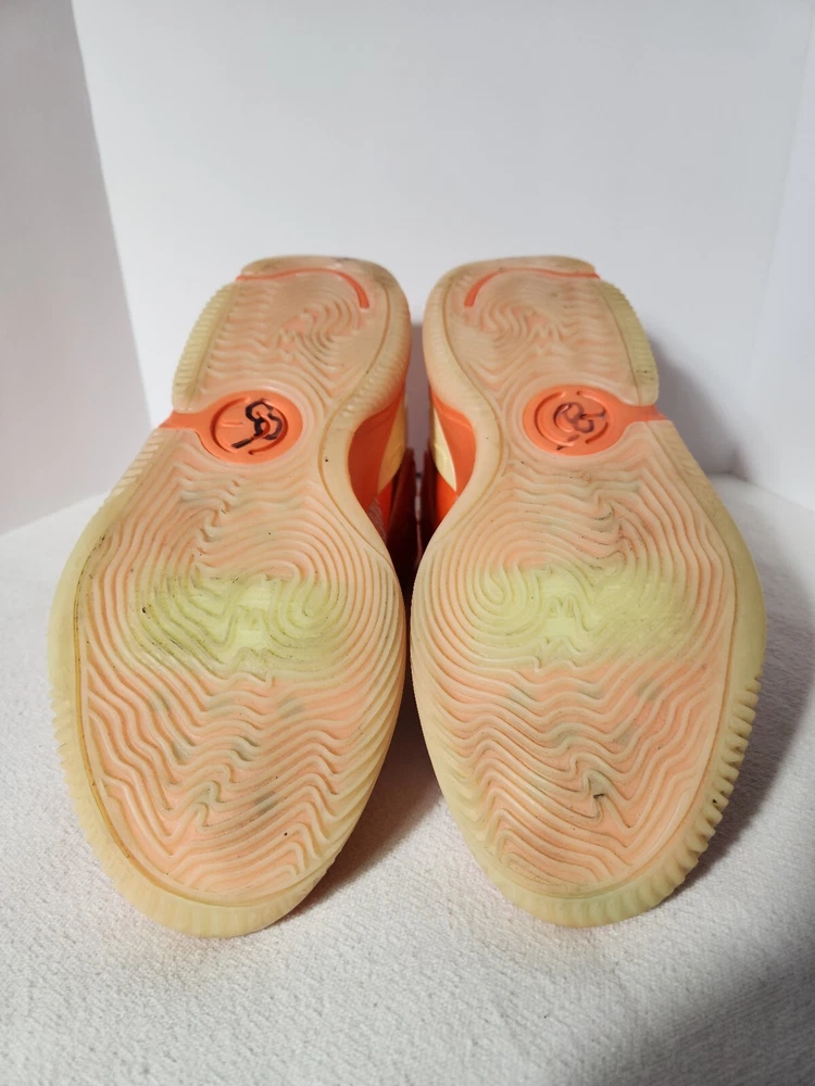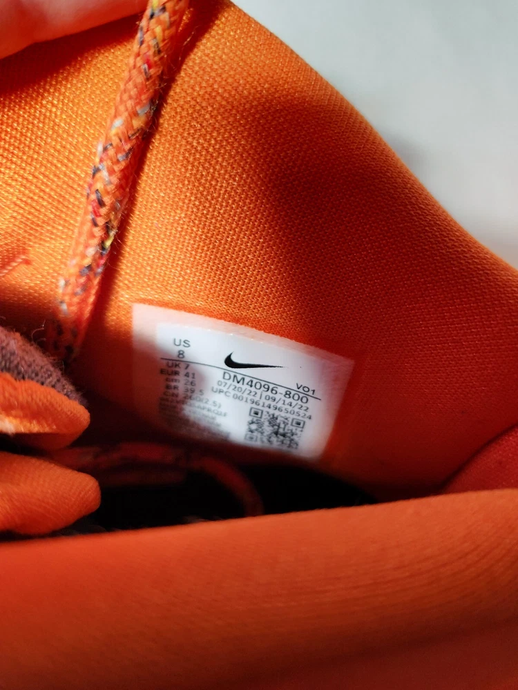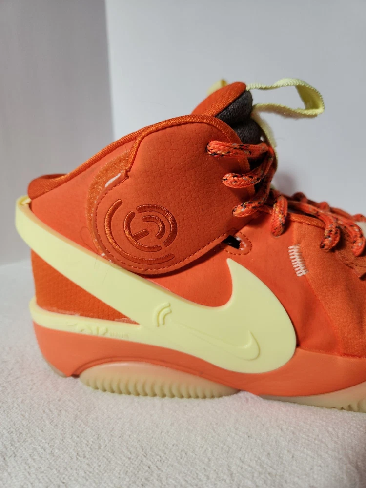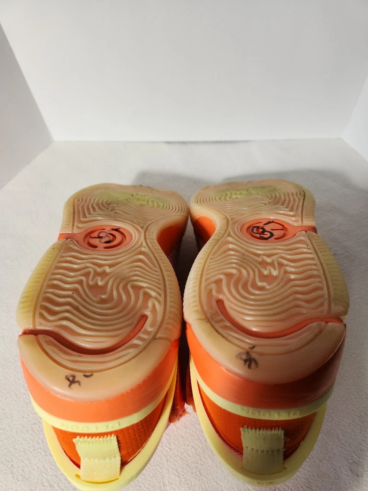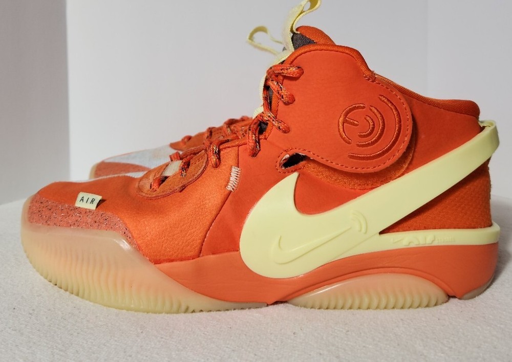 Elevate your activewear with these stylish Nike Air Deldon sneakers. These unisex mid-top shoes feature a solid orange color and a breathable mesh upper material, making them perfect for all-day wear. The lace-up and pull-on closure options provide a secure fit, while the cushioned foam insole and rubber outsole offer both comfort and performance. These athletic shoes are the perfect addition to any sneaker collection and are ideal for basketball or any other physical activity. The Nike Air product line ensures high-quality shoes that are built to last. The shoes are pre-owned but are in excellent condition, with no signs of wear and tear.