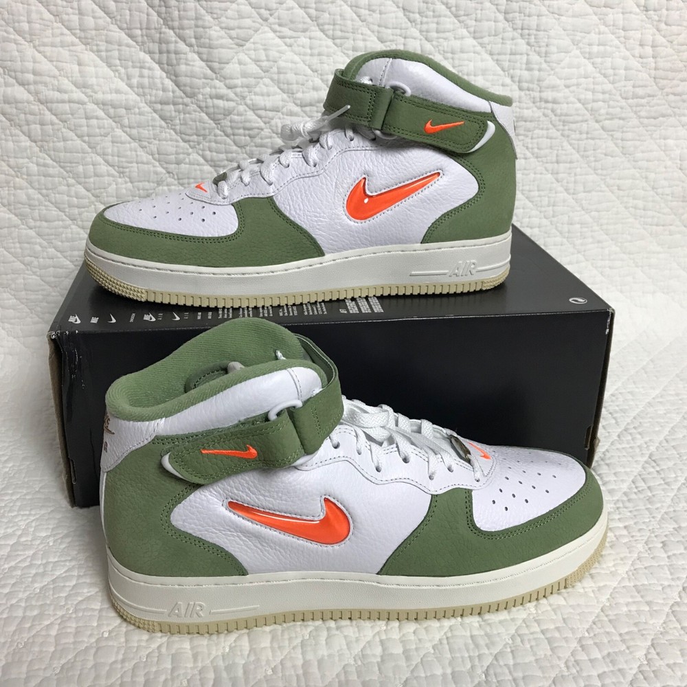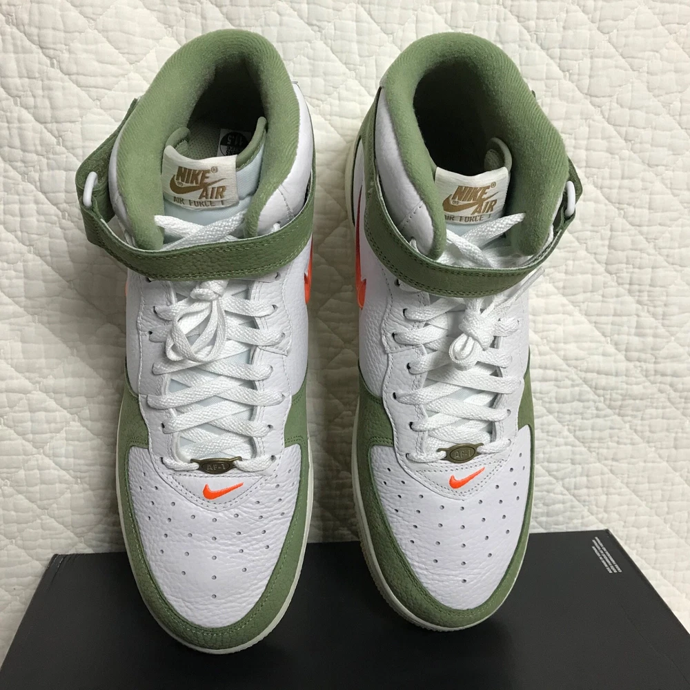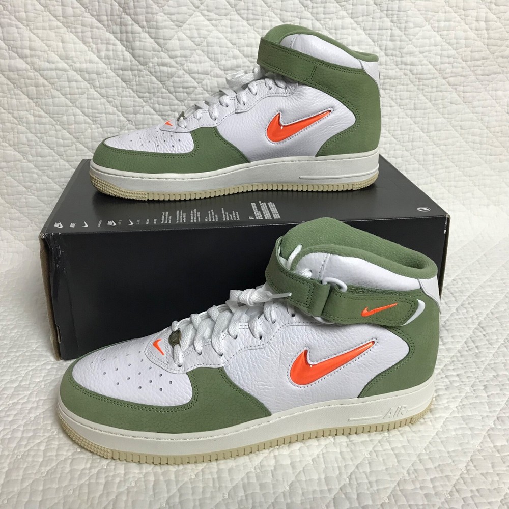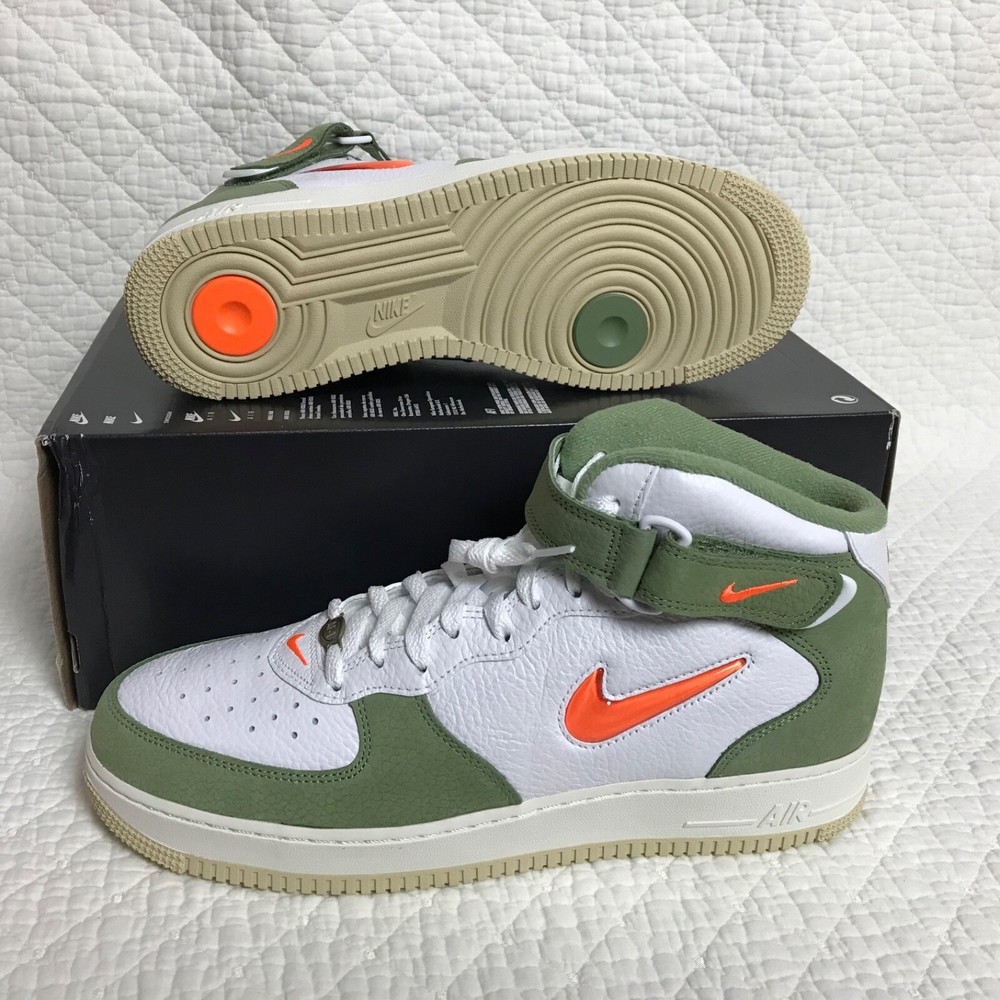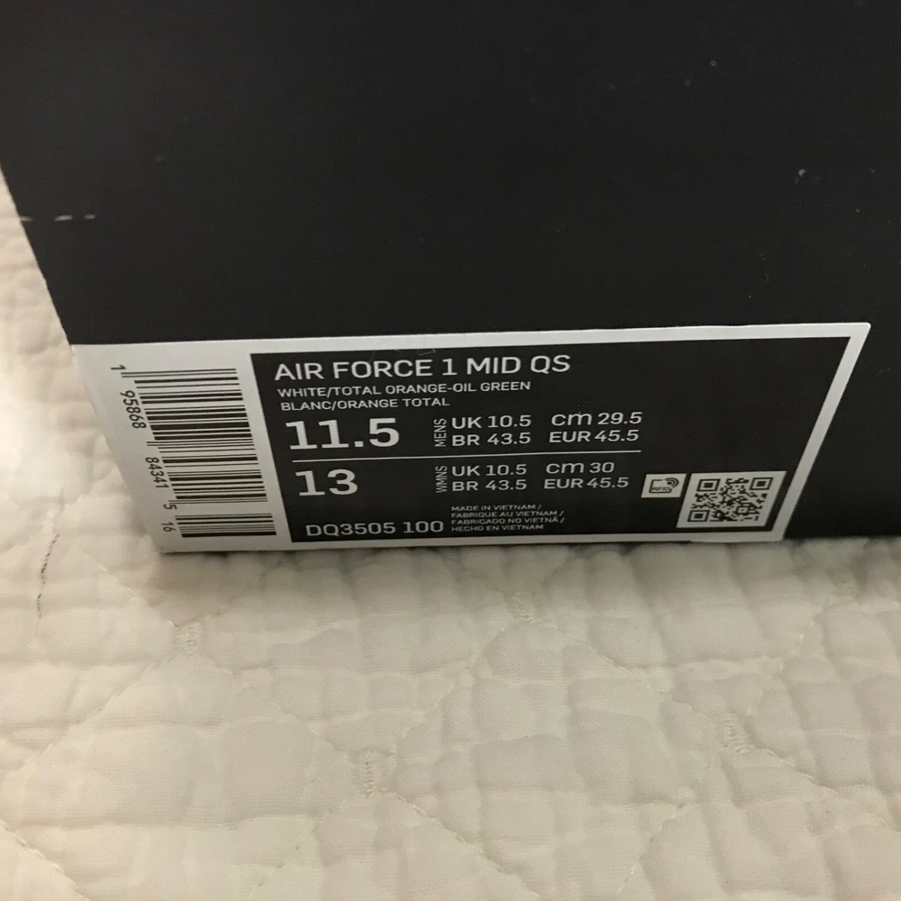 Nike Air Force 1 Mid QS Shoes Men’s SZ 11.5 Women’s SZ 13 White Total Orange DQ3505-100 NWOB The shoes are new without box.Take a look at the pictures for details. Taking on a full tumbled leather construction all throughout the upper, this Nike Air Force 1 Mid starts off with White on the side panels, toe, and ankle collar. For contrast we see olive landing on the overlays on the midfoot and ankle as well as on the inner liner. For more color we see the addition of orange on the jewel Swooshes on the side panels, the embroidered Swooshes on the ankle strap and toe, and brown on the branding that appears on the tongues and heels. An off-white rubber midsole and a beige rubber outsole finish off this Nike Air Force 1 Mid