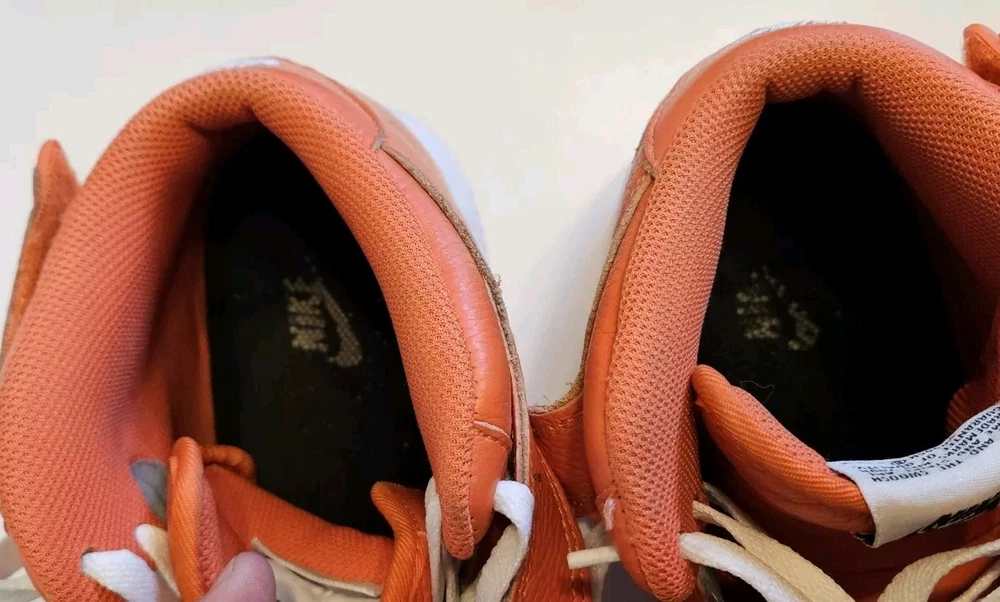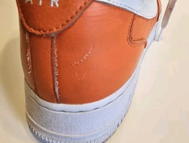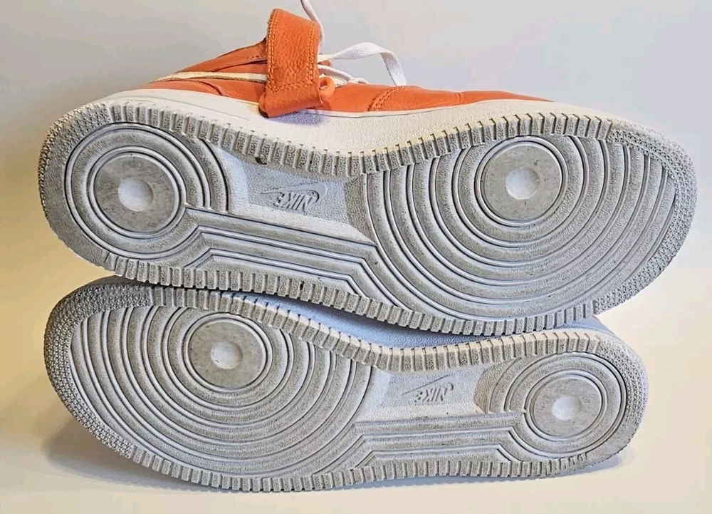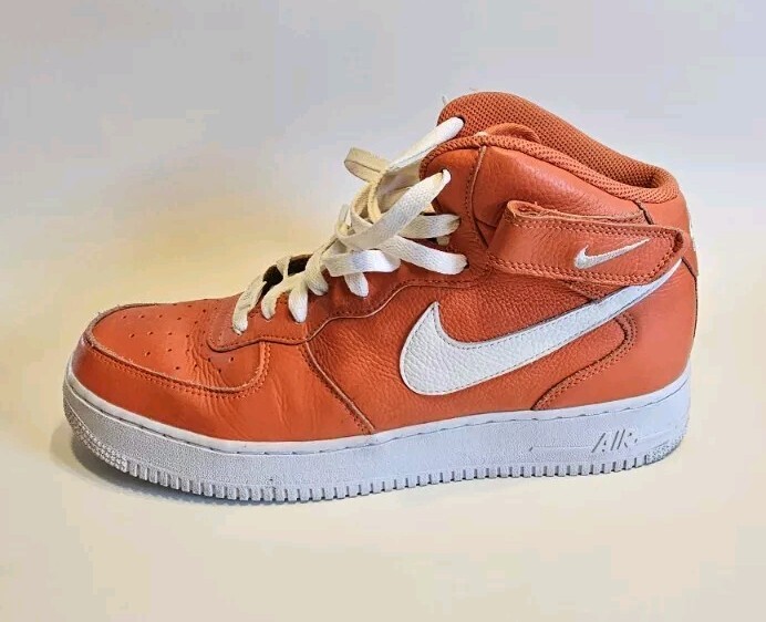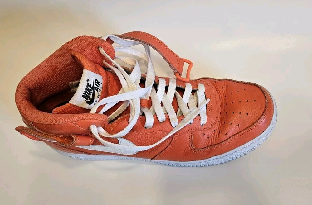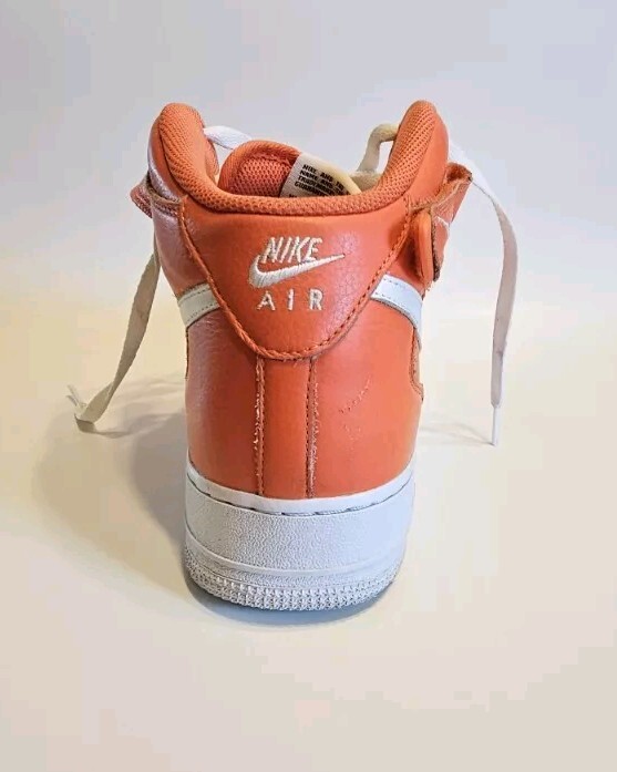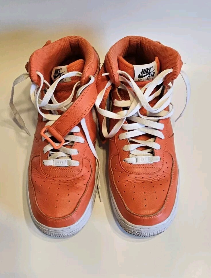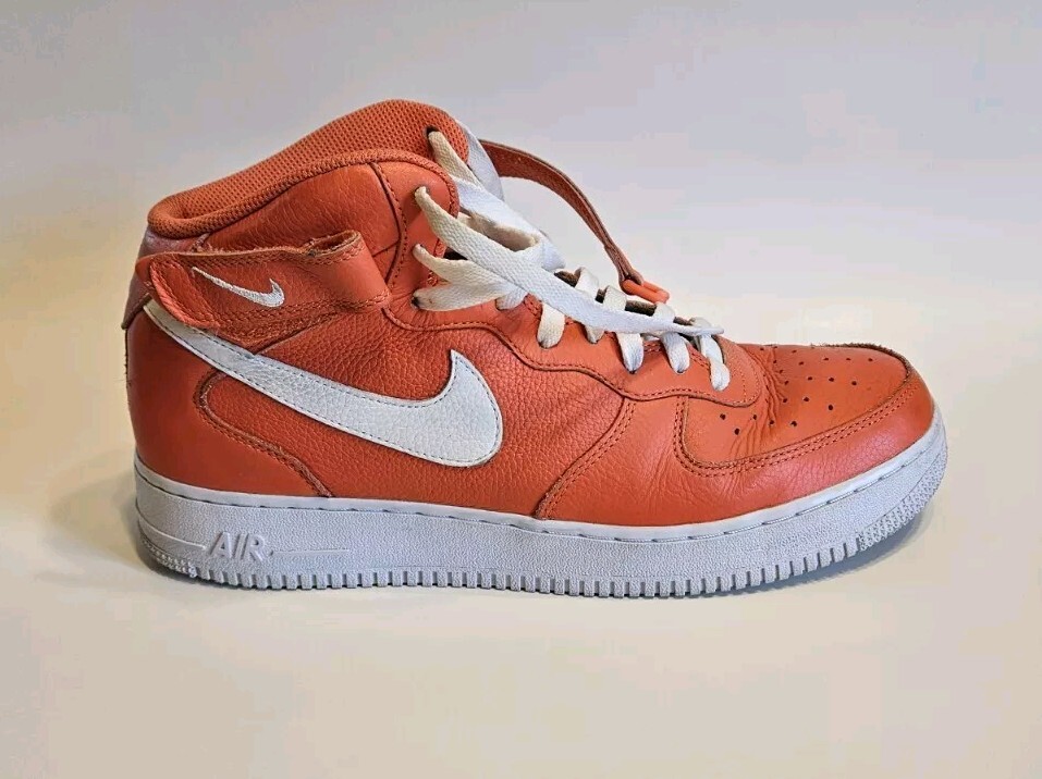 Nike Air Force 1 mids size 10.5. Orange with white sole, laces, and Swoosh. Right shoe has a "scuff" on the back of the shoe. Otherwise, both shoes are in excellent condition (please see photos.)