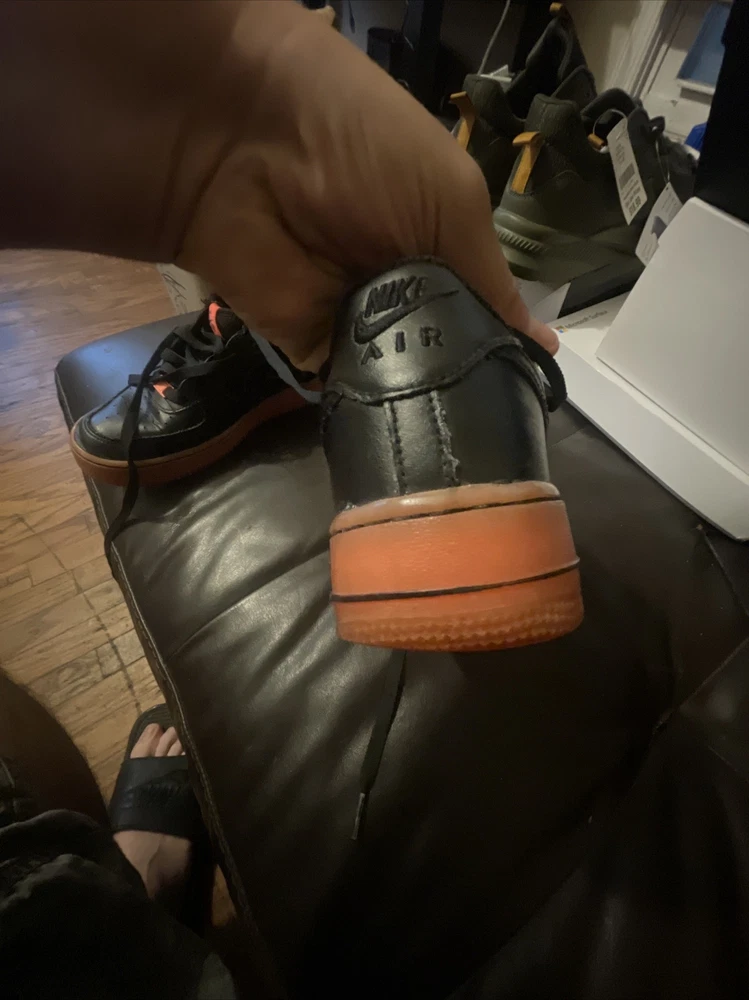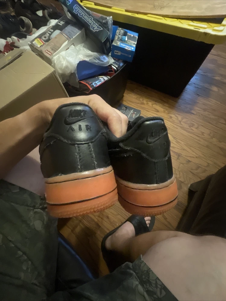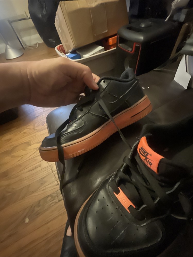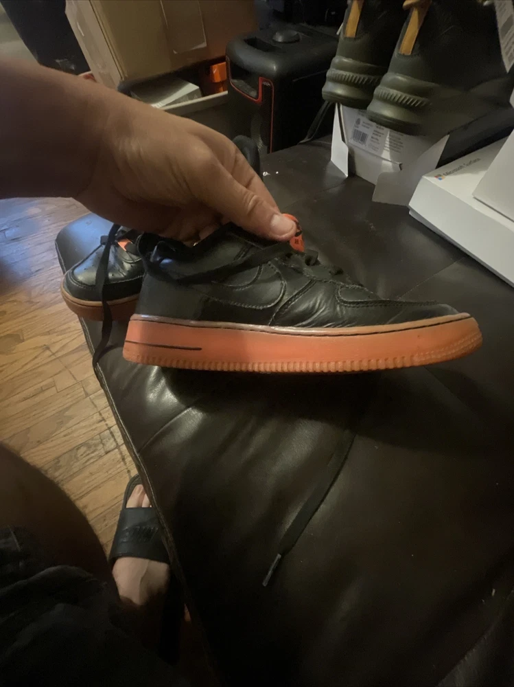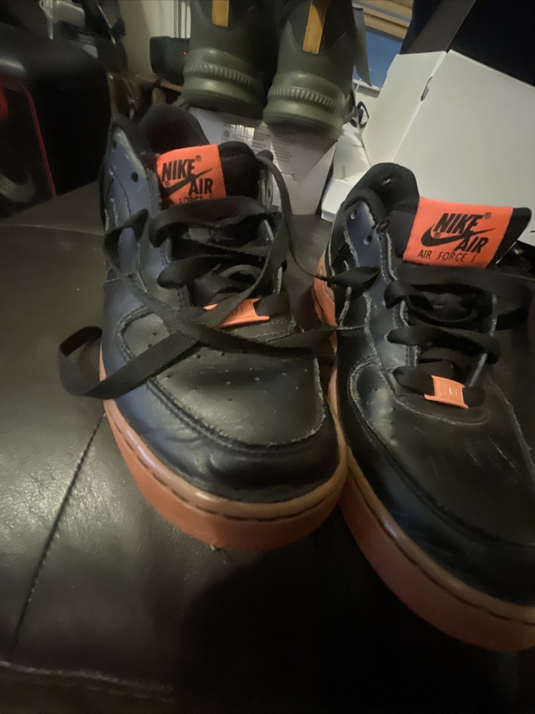 Size 6.5Y Great condition with some small scuffs on the front tongue as pictured in 2nd or 3rd pic, Smoke and pet free home Thanks again for the support & god bless Bin 64 Elevate your kid's sneaker game with these Nike Air Force 1 Premium sneakers in bold black, orange, and hot lava colorway. The sneakers feature round toe shape, lace-up closure, and a flat heel style. The cushioning level is moderate, making them perfect for walking, school, skateboarding, or basketball. These unisex kids' shoes come in US size 6.5 and UK size 6, with a shoe shaft style of low top. The upper material is leather with the Nike logo as an accent. The outsole material is also leather, making it a durable pair of sneakers. These sneakers are perfect for activewear, casual, and athleisure styles.