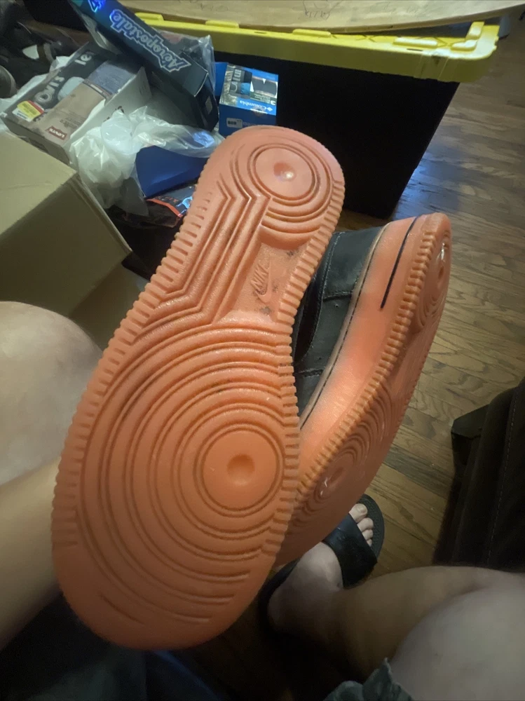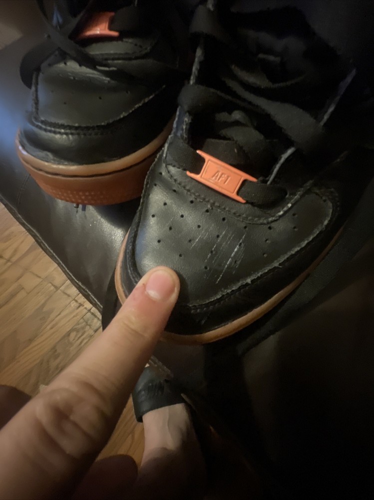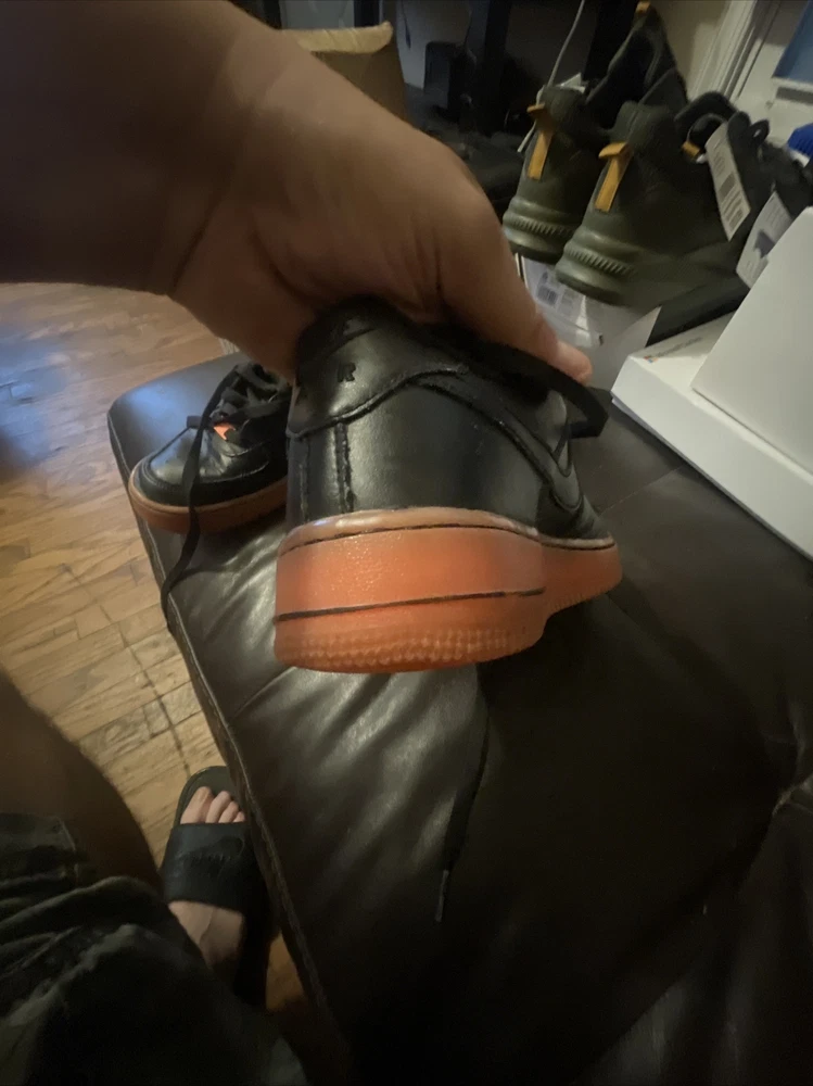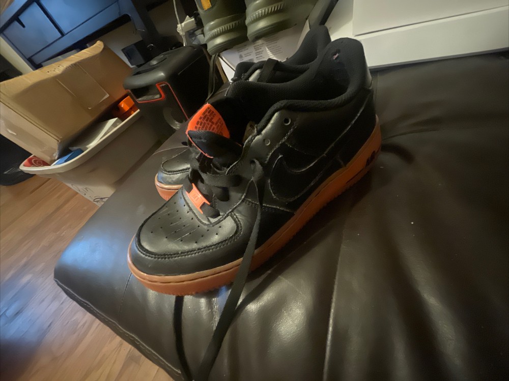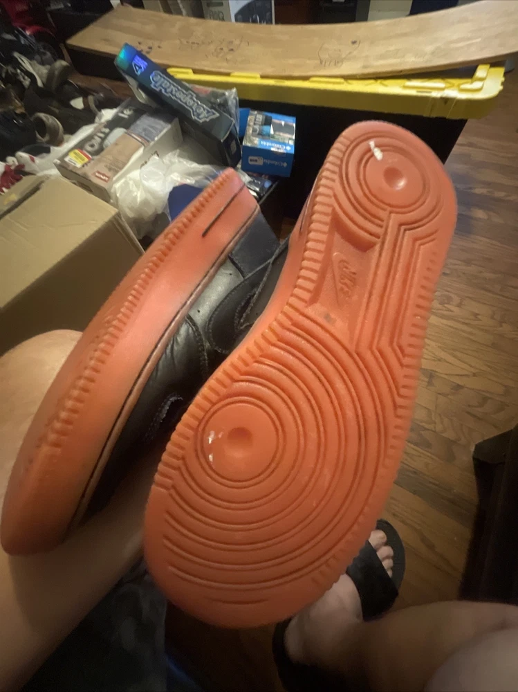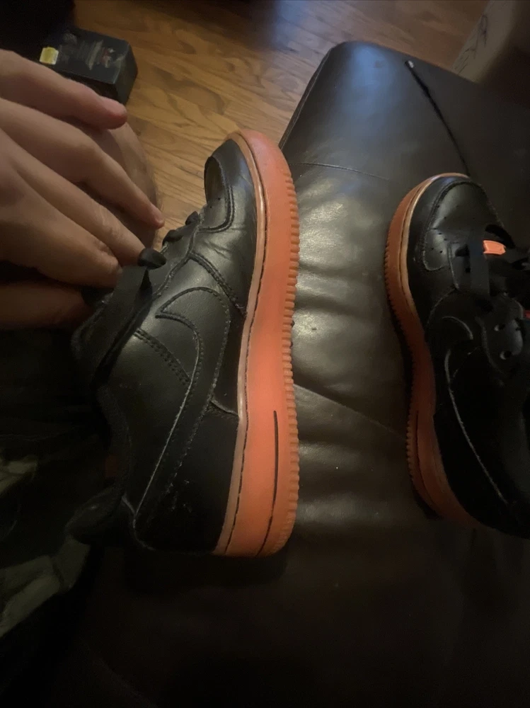 Size 6.5Y Great condition with some small scuffs on the front tongue as pictured in 2nd or 3rd pic, Smoke and pet free home Thanks again for the support & god bless Bin 64 Elevate your kid's sneaker game with these Nike Air Force 1 Premium sneakers in bold black, orange, and hot lava colorway. The sneakers feature round toe shape, lace-up closure, and a flat heel style. The cushioning level is moderate, making them perfect for walking, school, skateboarding, or basketball. These unisex kids' shoes come in US size 6.5 and UK size 6, with a shoe shaft style of low top. The upper material is leather with the Nike logo as an accent. The outsole material is also leather, making it a durable pair of sneakers. These sneakers are perfect for activewear, casual, and athleisure styles.