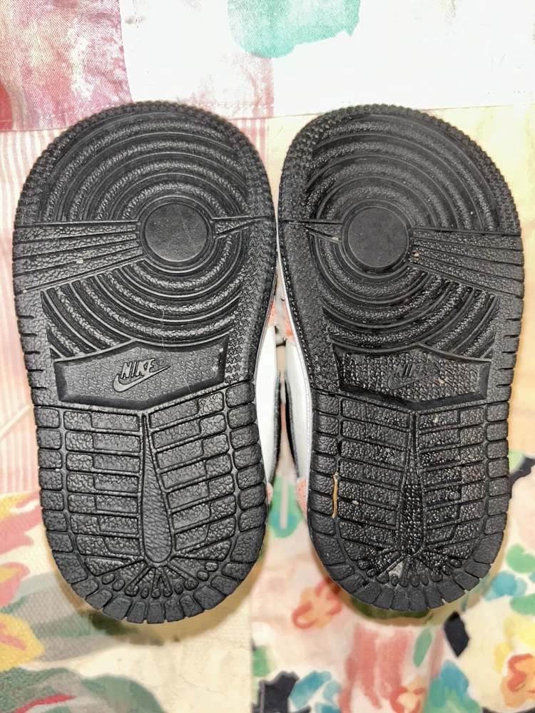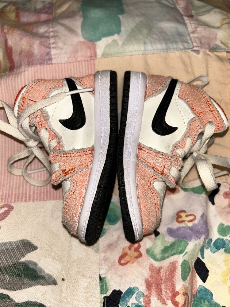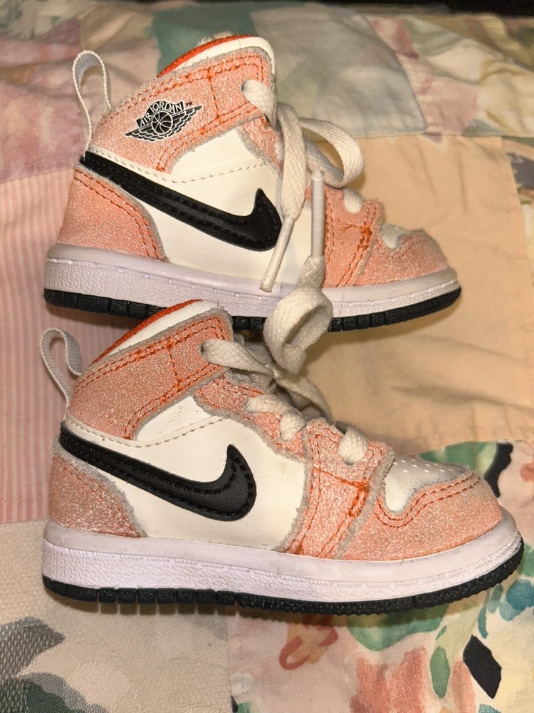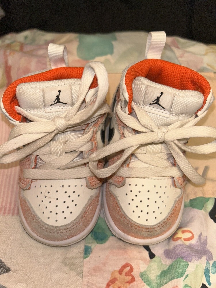 The Nike Air Jordan 1 MID SE Team Orange Suede DV1340-800 is a toddler/baby sneaker in size 4C. It features a vibrant orange colorway with a suede upper, perfect for little ones engaged in walking or basketball activities. The shoe belongs to the Air Jordan product line, showcasing the iconic Jordan brand and style.