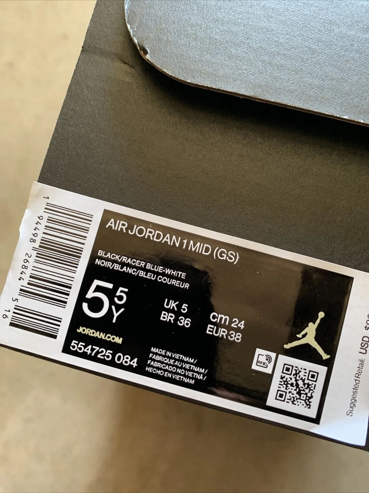 Please read all our policies below prior to making any purchases. All items are 100% authentic, guaranteed, or your money back! Again, all items are 100% authentic. Please do NOT email us asking about authenticity, you will be wasting both of our time as again, we only sell authentic items. This is a business we do not provide receipts as once a product is purchased; the receipt is logged for tax purposes. PRODUCT DETAILS : Item: Nike Air Jordan 1 Mid GS Black/Racer Blue Style Code : 554725-084 Sizing: US Size 5.5Y/ US Womens 7 Condition : New in Box PAYMENT METHOD : We Currently Accept only Paypal Payment with the correct shipping address. Payment must be received within 3 days of auction closing and or ‘buy it now’ listings. RETURN POLICY: Returns are subjected to a 20% restocking fee. Shipping is non-refundable. The item must be in unworn/unused condition or it will not be accepted. Buyer must notify seller of a return within 14 days upon delivery of their package. EXCHANGES: Buyer is responsible for all shipping costs. Buyer must notify the seller of an exchange within 14 days upon delivery of their package. CANCELLATIONS: Cancellation of all processed orders will be subjected to a 20% restocking fee. If a buyer receives a defective or wrong style/size sneaker then the restocking fee will be waived and shipping costs will be covered. Shipping : All items are in stock unless noted otherwise and ship within one business day. Most times, depending on the time of the sale, we will ship same day. As listed above under payment, your item(s) MUST have the correct shipping address at time of payment. We WILL NOT update or edit a shipping address in any way after the payment is made. Please make sure you have your address entered correctly as we are not allowed per eBay and PayPal policy to edit an address after an order has been submitted. International customers you are responsible for all duties and customs. We the seller are not responsible in any way for them. Thank you for shopping with us and if you have any questions at all that are not addressed here please feel free to email us anytime.