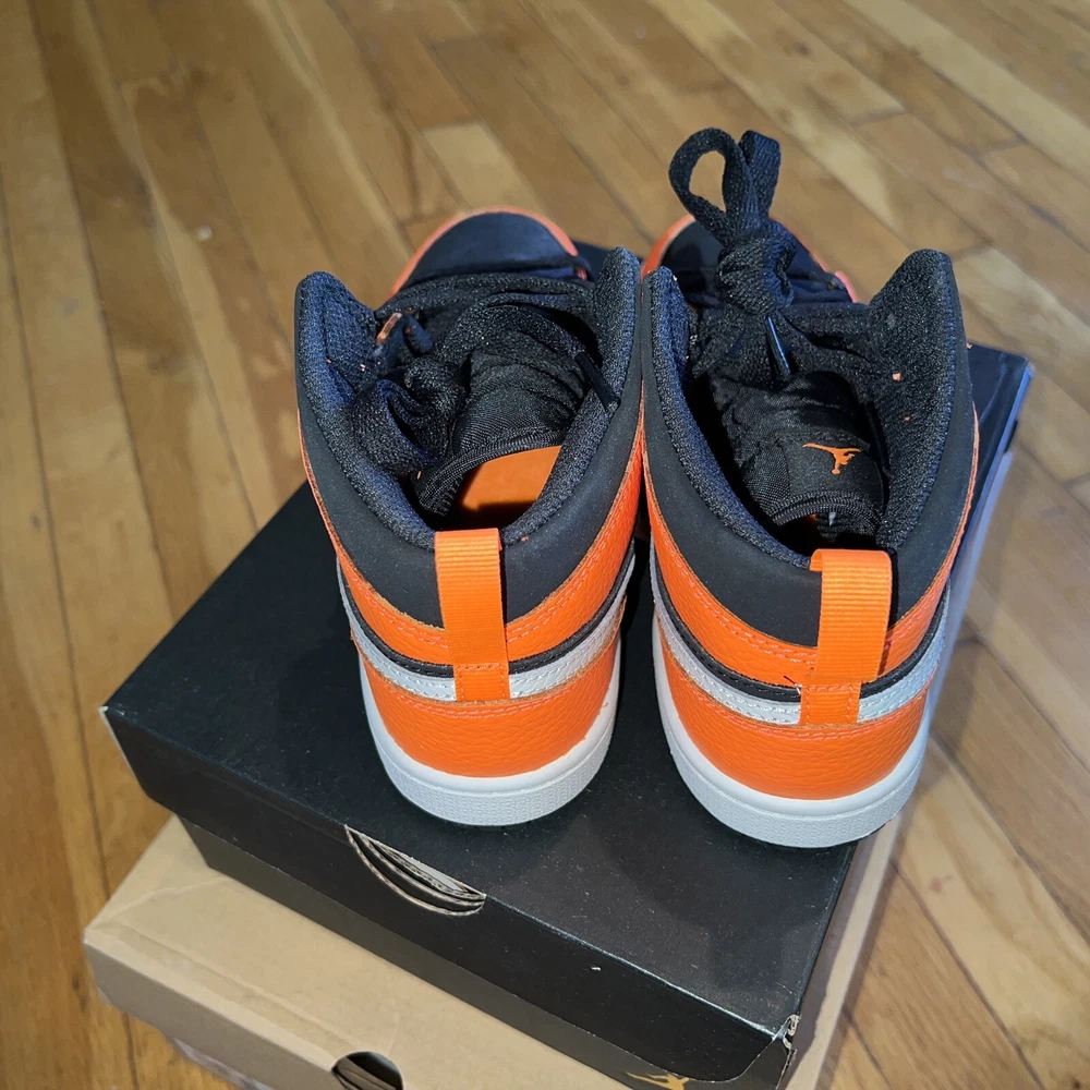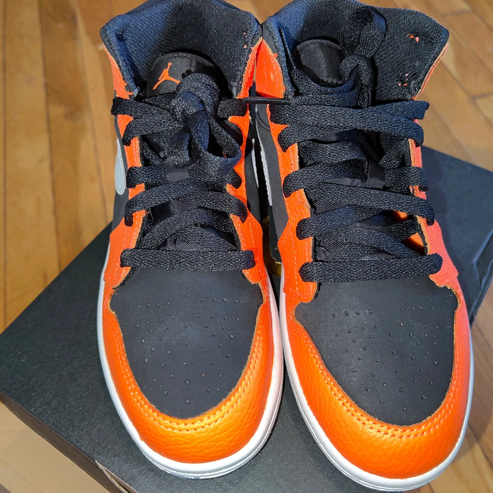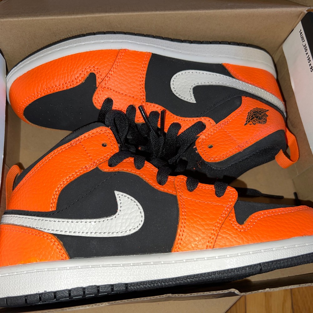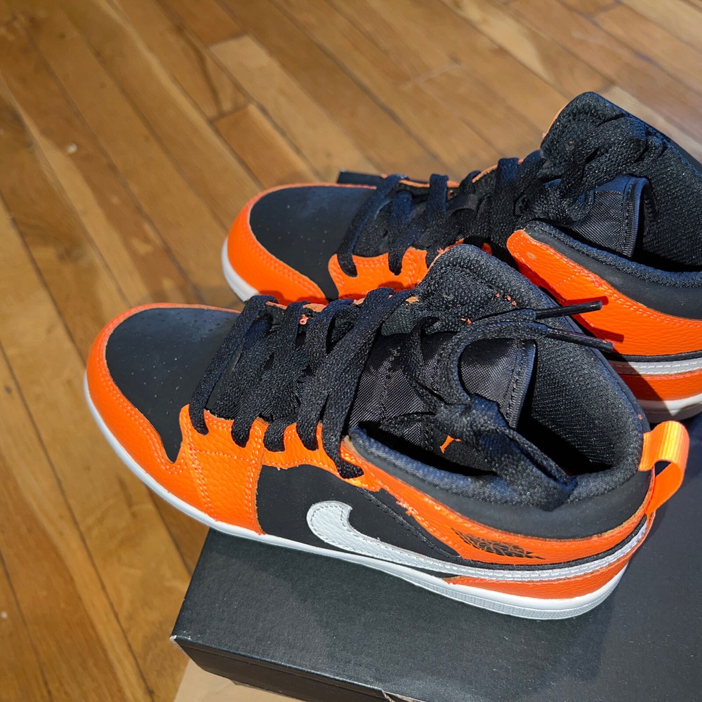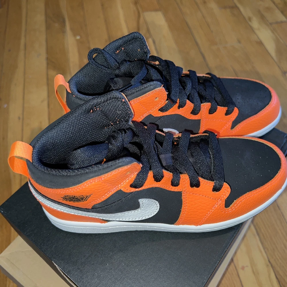 Nike Air Jordan 1 Mid 640734 062 Men PS 3Y New in original box 100% authentic PreSchool Size 3Y The Air Jordan 1 Mid, dressed in orange and black, takes on a persona very similar to the popular “Shattered Blackboard” style. Black is the base, while orange leather overlays accent the Jordan sneaker. The large Nike Swoosh comes in white, along with the midsole and Jumpman on the tongue. The Jordan Wings logo on the side is embossed in black, and the Air Jordan 1 Mid is finished with a black outsole. Highlights black/orange leather round toe flat rubber sole front lace-up fastening signature Swoosh logo detail