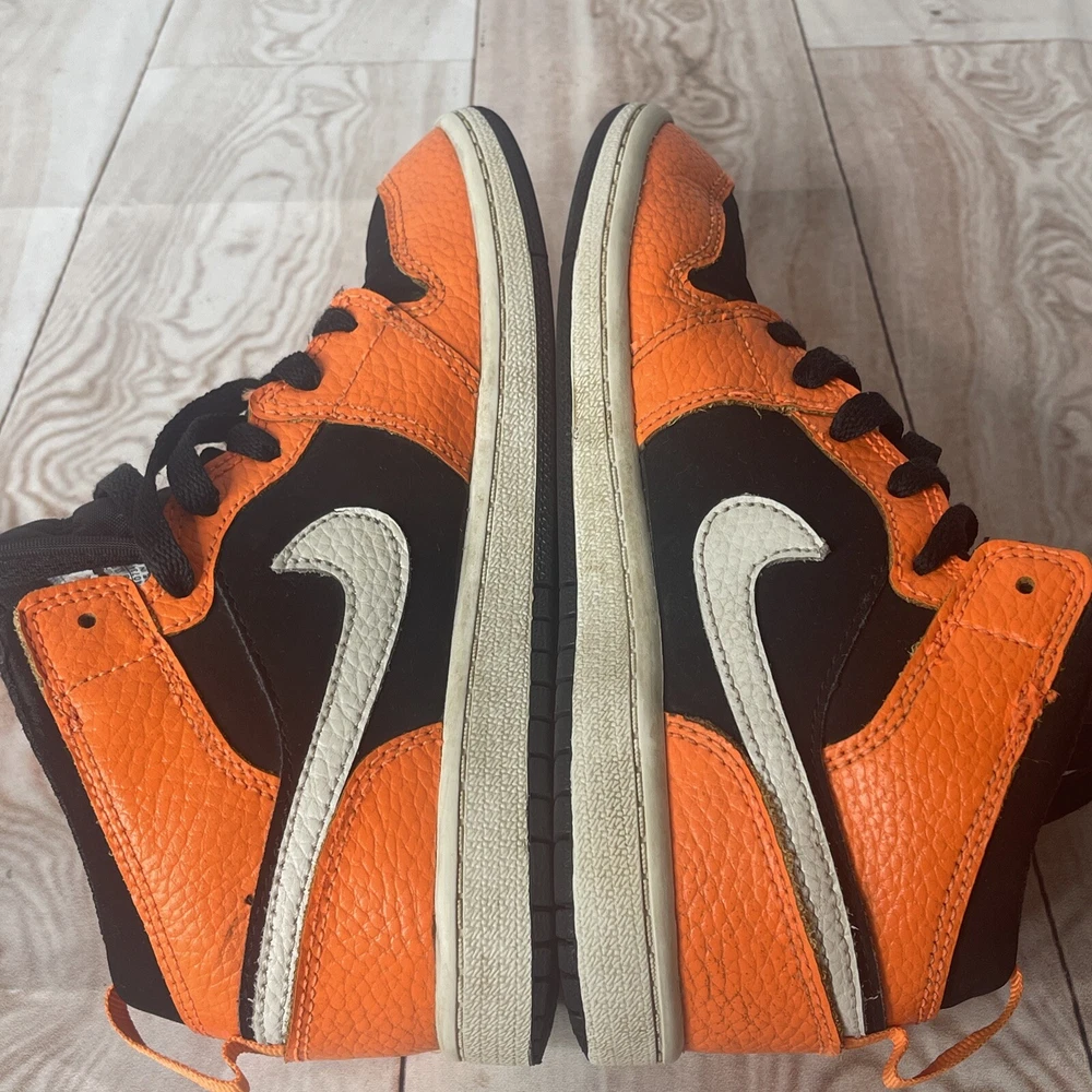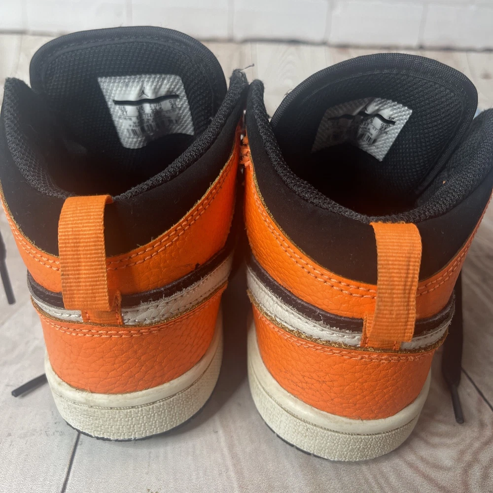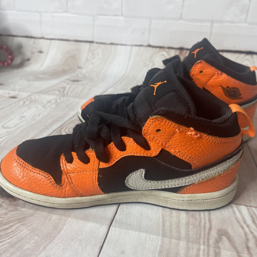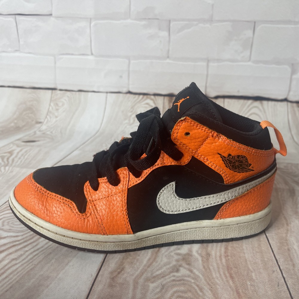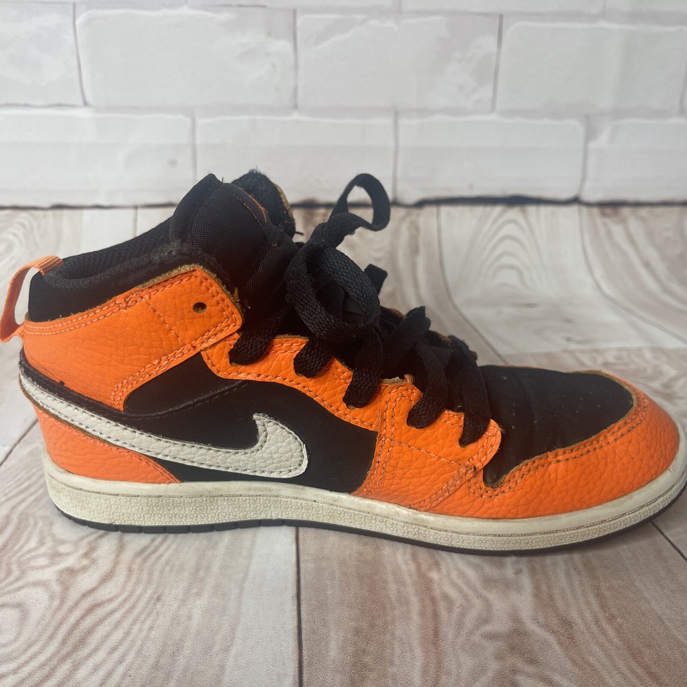 Nike Air Jordan 1 Retro Mid 640734-062 Black Orange Kids Shoes Size 2Y No Box. See photos for wear and tear. These shoes are good to very good quality. Some pulls here and there as well as medium tread left. Right foot has more wear on the heel than the left.