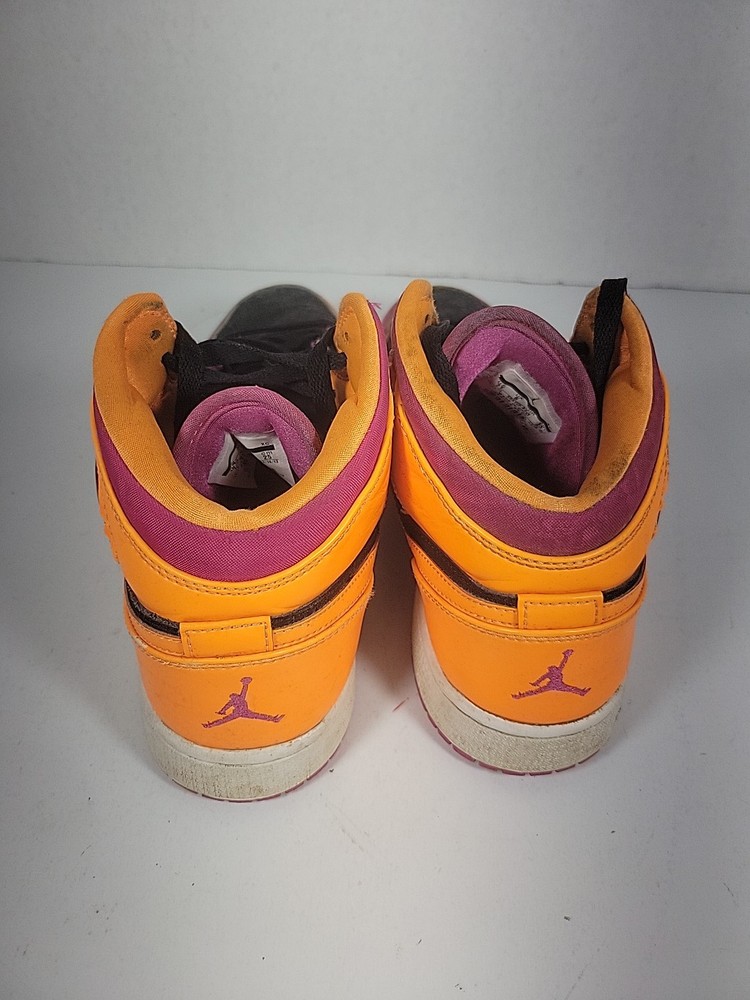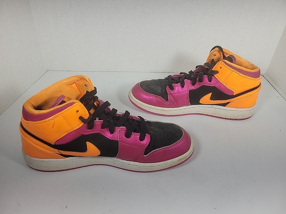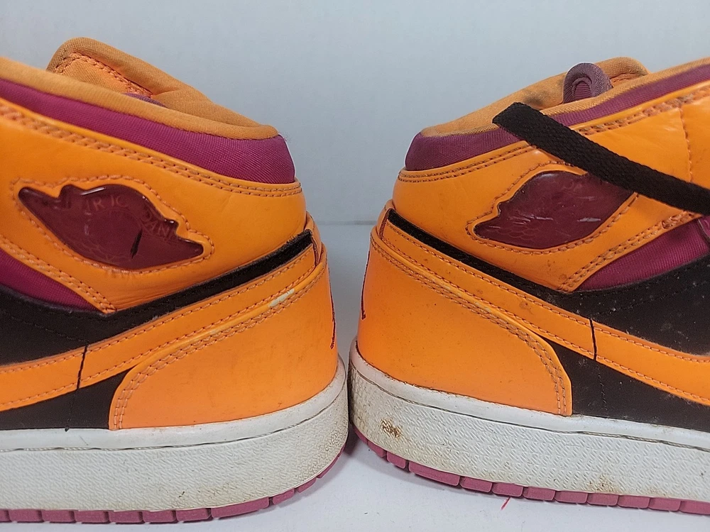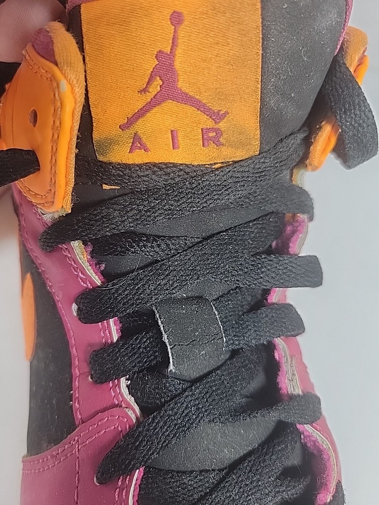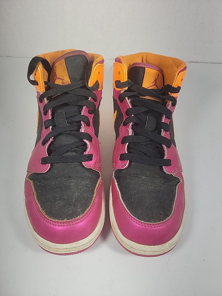 The Nike Air Jordan Retro 1 Youth sneaker in purple and orange is a stylish and comfortable choice for kids. Featuring a round toe, lace-up closure, and mid-top shaft style, these sneakers have a cushioned insole for added comfort. Made of leather with a fabric lining and rubber outsole, they are suitable for active wear, particularly basketball. The retro design and Nike Air technology make these sneakers both fashionable and functional for all seasons. These shoes have been previously loved, please see photos for defects and wear.