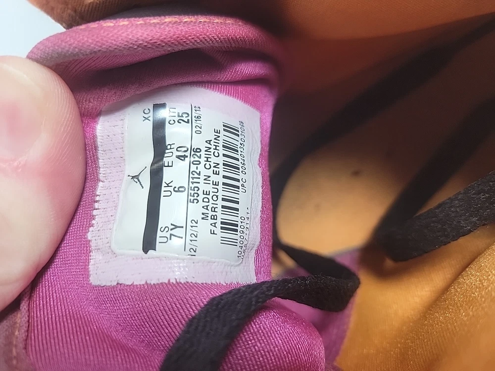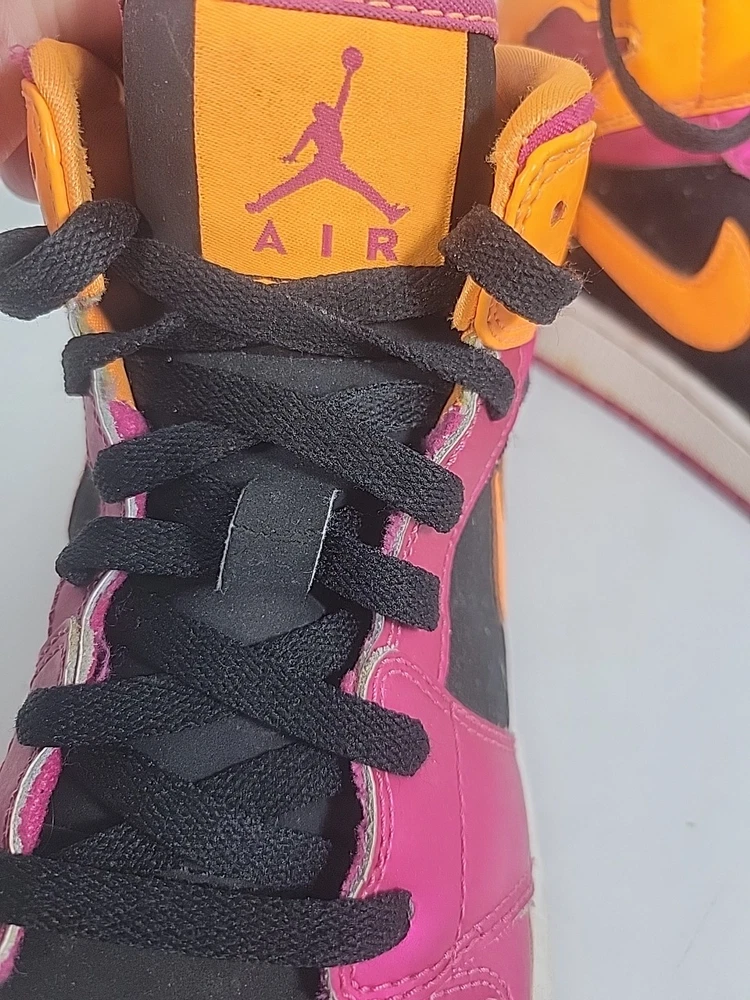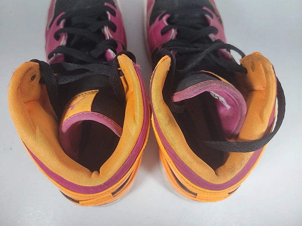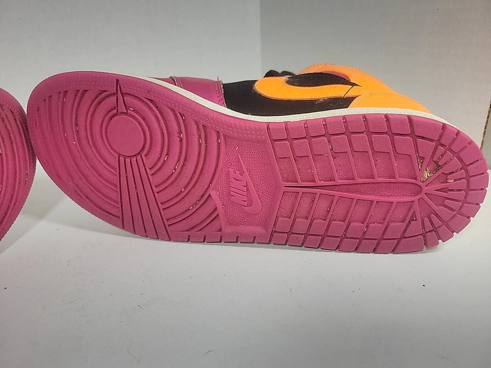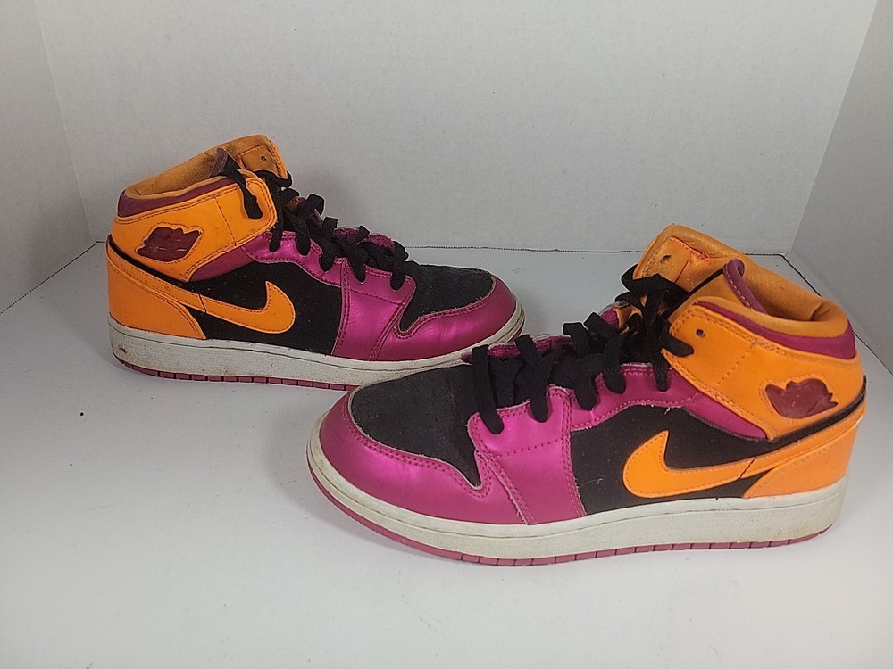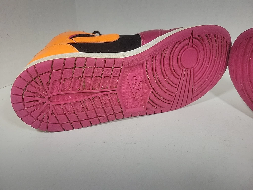 The Nike Air Jordan Retro 1 Youth sneaker in purple and orange is a stylish and comfortable choice for kids. Featuring a round toe, lace-up closure, and mid-top shaft style, these sneakers have a cushioned insole for added comfort. Made of leather with a fabric lining and rubber outsole, they are suitable for active wear, particularly basketball. The retro design and Nike Air technology make these sneakers both fashionable and functional for all seasons. These shoes have been previously loved, please see photos for defects and wear.
