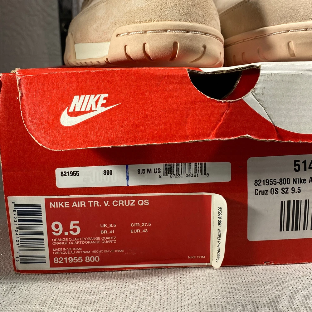 Nike Mens Air Tr V Cruz QS 821955-800 Beige Suede Lace Up Sneaker Shoes Size 9.5 Brand: Nike Department: Men Model: Air Tr V Cruz QS Style Code: 821955-800 Type: Athletic Style: Sneaker Color: Beige US Size: 9.5 UK Size: 8.5 EUR Size: 43 Pattern: Solid Toe Shape: Round Toe Closure: Lace Up Occasion: Casual Features: Comfort Breathable Season: All Seasons Condition: New With Defects. Brand new shoes in good condition. Box extremely damaged (torn, smashed and taped). Please view all photos carefully. FATTEMAMMA BOUTIQUE Please check out my other items! Be sure to add me to your favorites list! Buy with confidence! I describe all items as accurate as possible. Payment: Payments must be made immediately upon purchase. Returns are not accepted. By purchasing this item you are agreeing with all policies, descriptions and pictures for this specific item. All items come from a pet free and smoke free environment. I ship within 24 hours after payment. Buyers will be emailed a tracking number to track shipment. Please allow 24 to 48 hours for the tracking information to update on the USPS website. If payment is received late Friday, during the weekend or on a holiday I will ship the following business day. Please contact me if you have any questions. Please visit my store for more great items! Thank you for making my small business a success!! Enjoy Shopping!