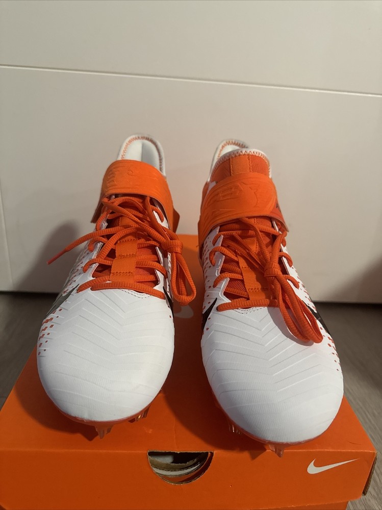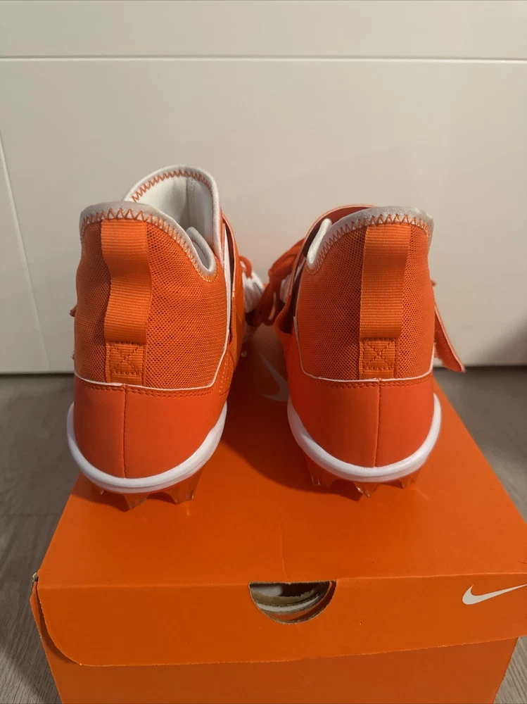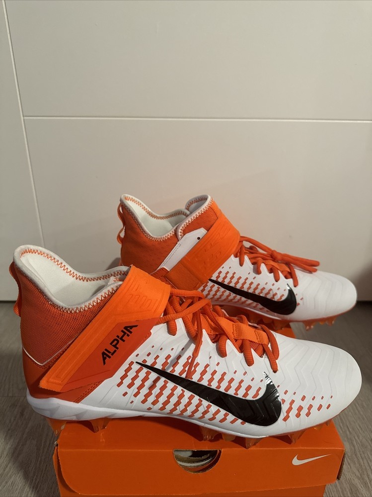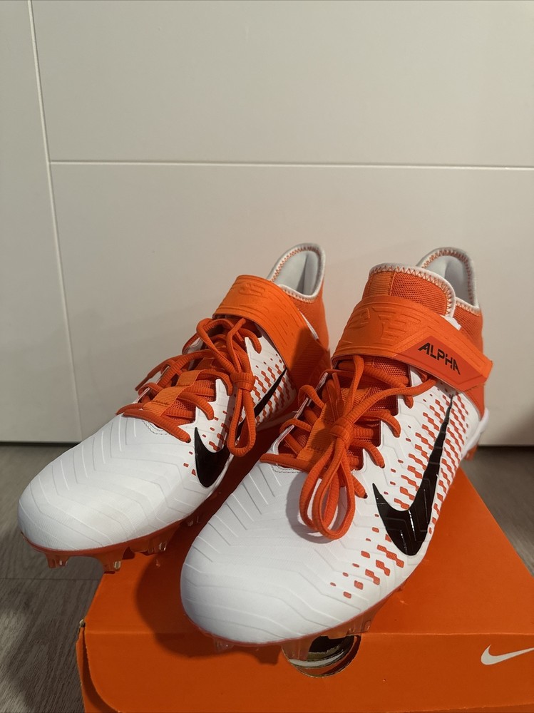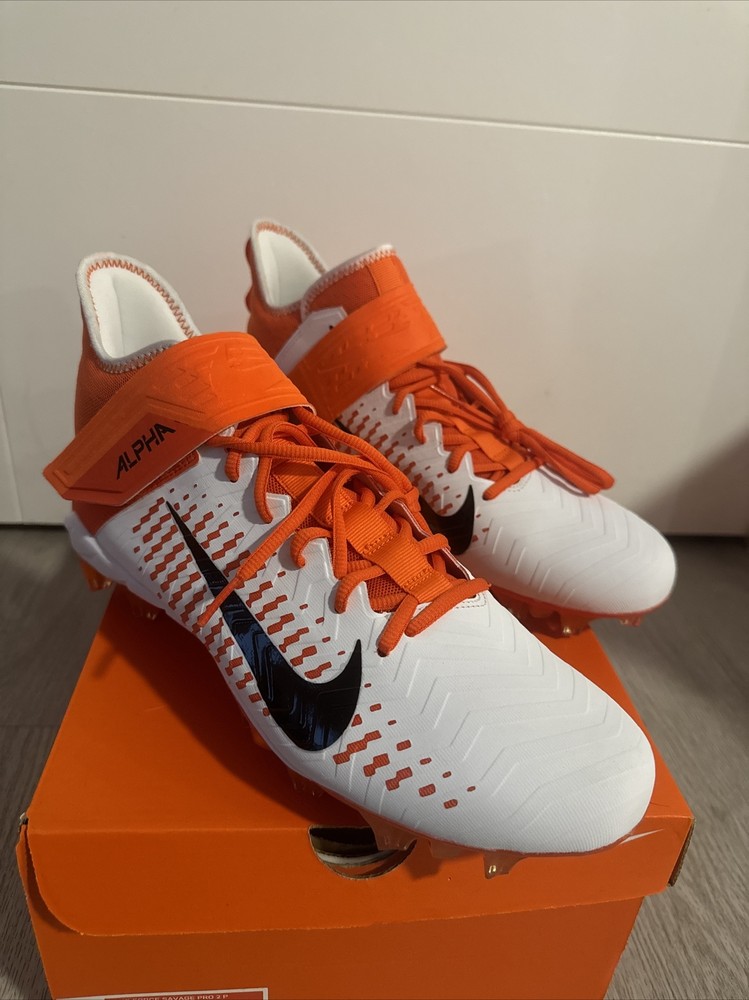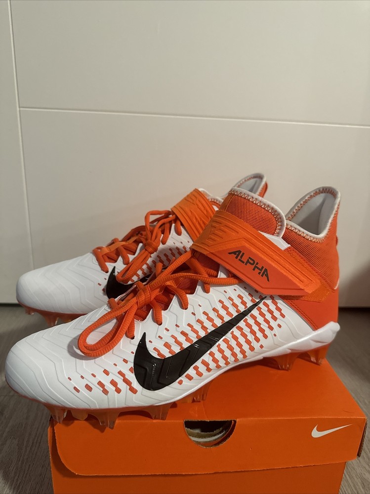 Elevate your game with these Nike Alpha Menace Pro 2 Mid Football Cleats. Designed for the ultimate performance on the field, these cleats feature a striking orange and white colorway that is sure to turn heads. The Nike Alpha Menace Pro 2 Mid Cleats are perfect for any football player looking to improve their game and make a statement. Crafted with precision and attention to detail, these cleats feature a comfortable fit and maximum traction for optimal performance. The Nike Alpha Menace Pro 2 Mid Cleats are ideal for any football player, regardless of size or skill level. Whether you're a seasoned pro or just starting out, these cleats are the perfect addition to your gear.
