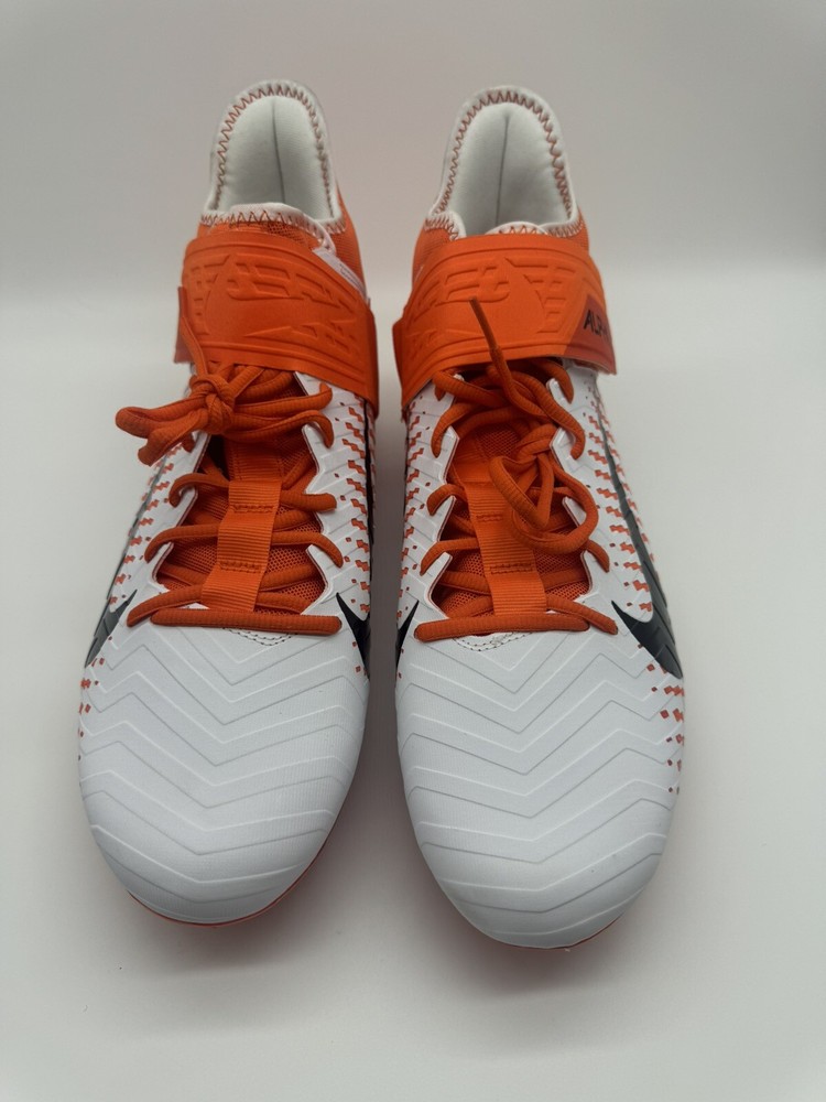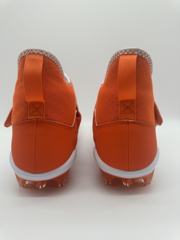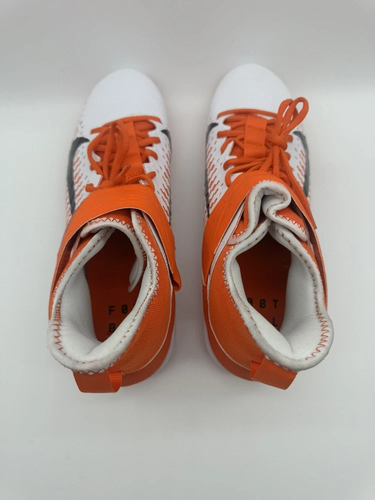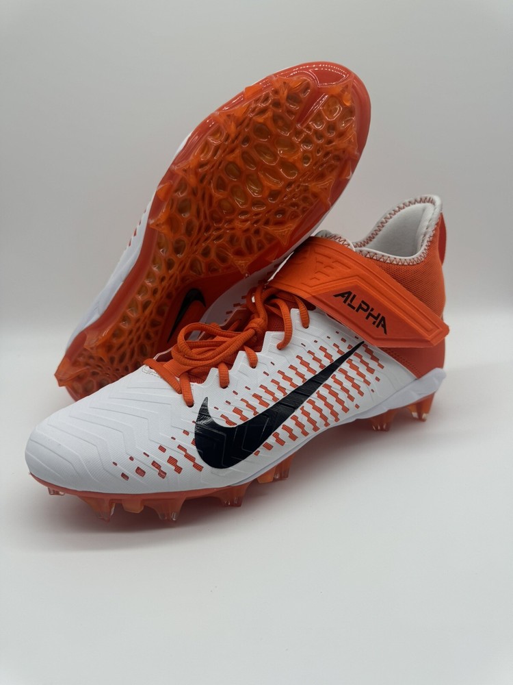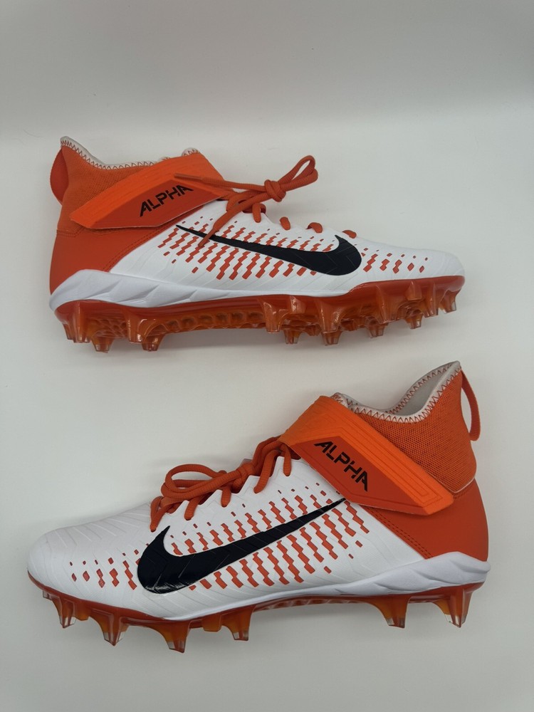 Elevate your football game with these Nike Alpha Menace Pro 2 Mid Football Cleats. The orange and white colorway is a bold statement that will turn heads on the field. Designed specifically for football players, these cleats are made to enhance your performance and comfort. The Nike Alpha Menace Pro 2 Mid Cleats are perfect for any football player who wants to elevate their game.