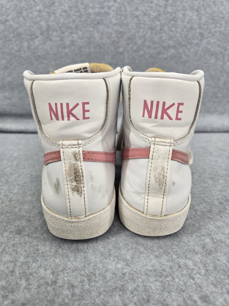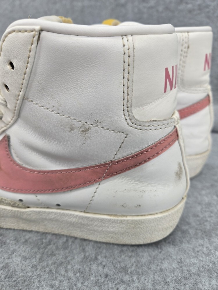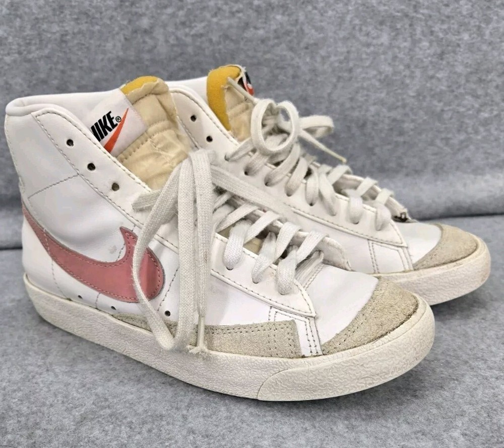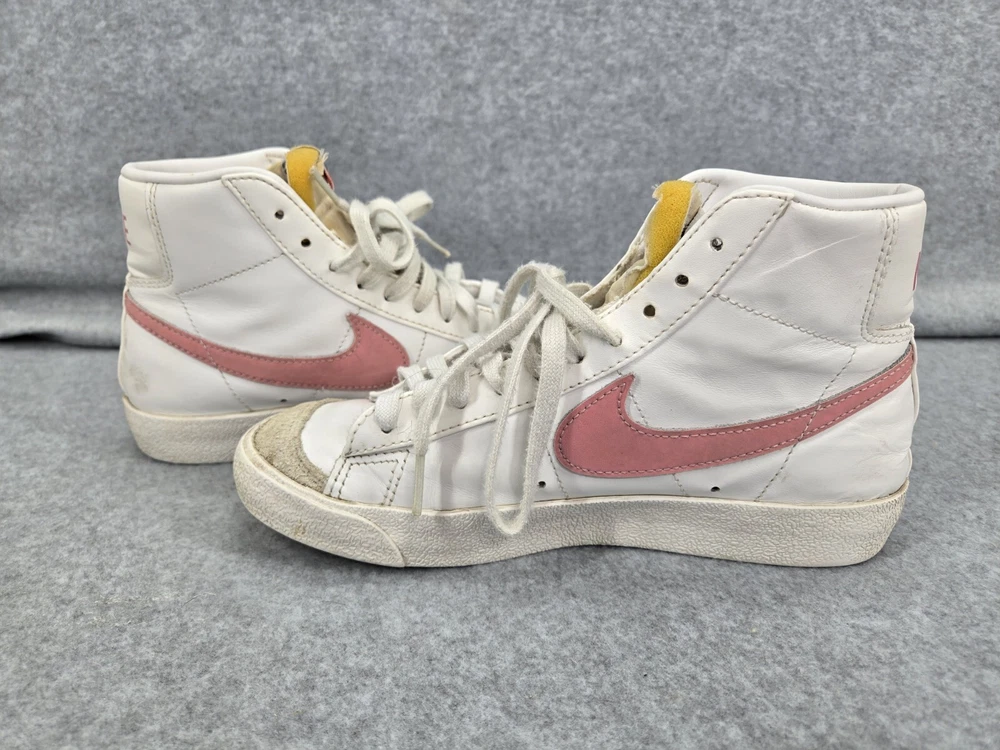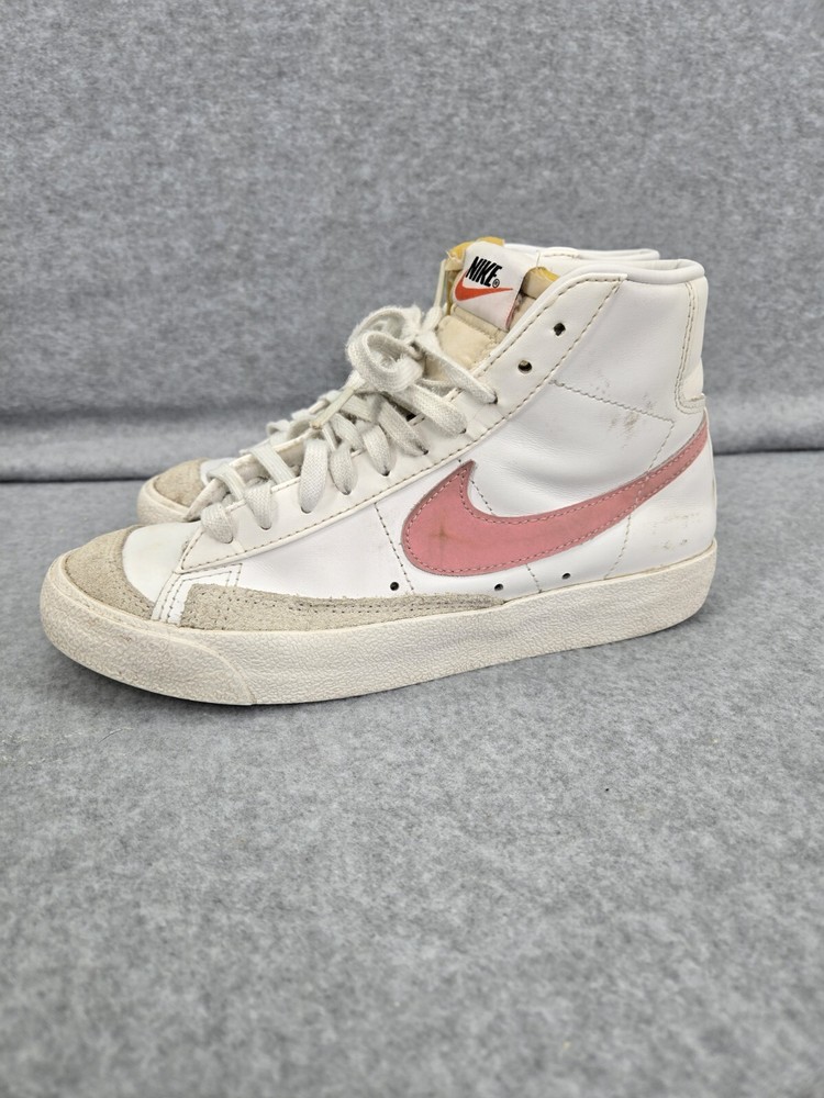 The Nike Blazer '77 Vintage Mid White Sunset Pulse with Pink Swoosh is a women's sneaker in size 7. This classic athletic shoe features a lace-up closure, cushioned comfort, and a rubber outsole for support. Ideal for activewear or casual wear in the summer, fall, or spring seasons, it boasts a solid white color with a touch of pink on the iconic Swoosh logo. Made with a leather upper and a foam insole, it offers a blend of style and performance for activities like gym training, walking, or everyday use. See all photos of condition.