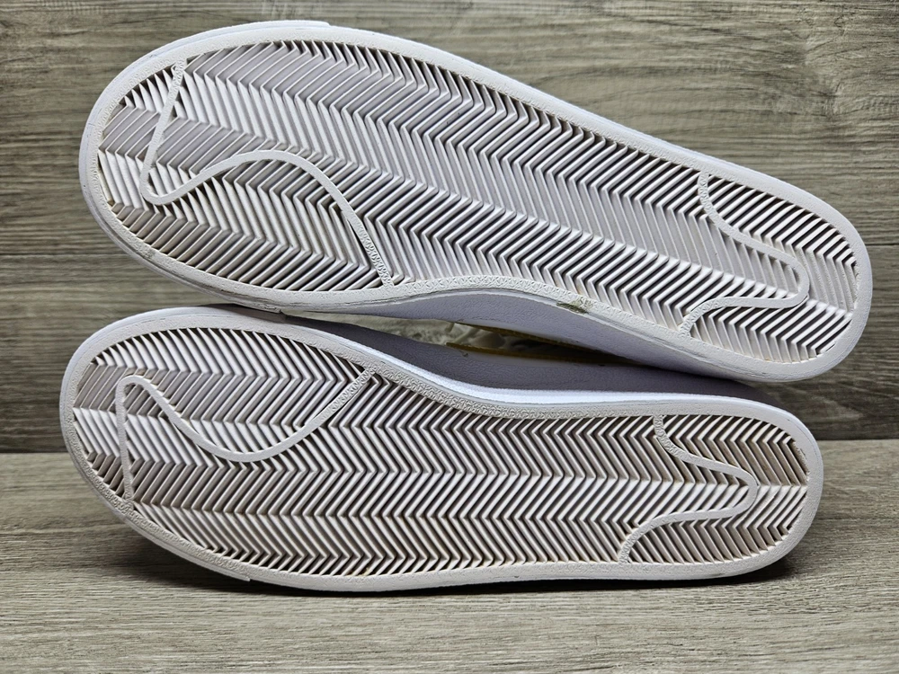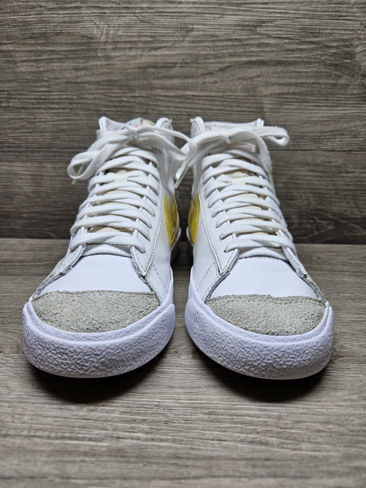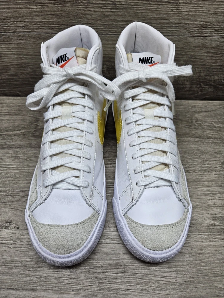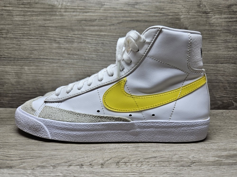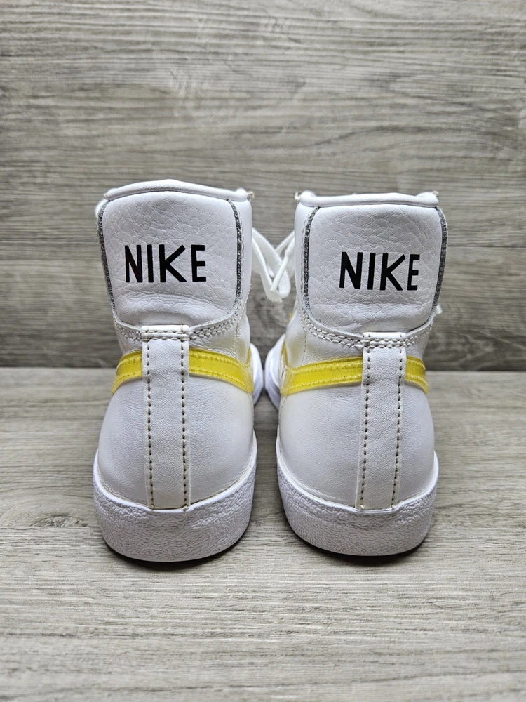 Elevate your sneaker game with these Nike Blazer Mid '77 sneakers in a classic white colorway. These sneakers feature a lace-up closure and mid-top shaft style, making them perfect for any active occasion whether it's for gym training, walking, school, skateboarding, basketball or running and jogging. The blended fabric and leather upper material provide a cushioned and comfortable fit while the rubber outsole ensures breathability and performance. One of the size label inside the shoe is missing, minor foam tearing on the tongue of the shoes shown on picture. Professionally cleaned and sanitized. No box included. These Nike Blazer sneakers also come in UK size 5.5 and EU size 39. The foam insole and leather lining material further enhance the comfort and breathable features of the shoe. The sneakers also showcase the Nike logo accents, adding a touch of style to the overall design. Get your hands on these Nike Blazer Mid '77 sneakers to add a vintage touch to your wardrobe.