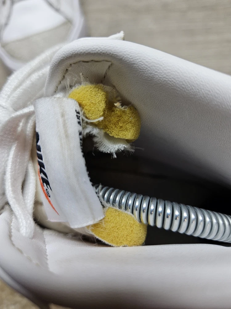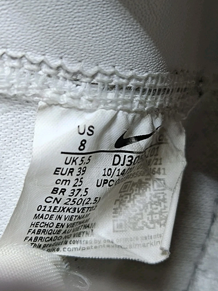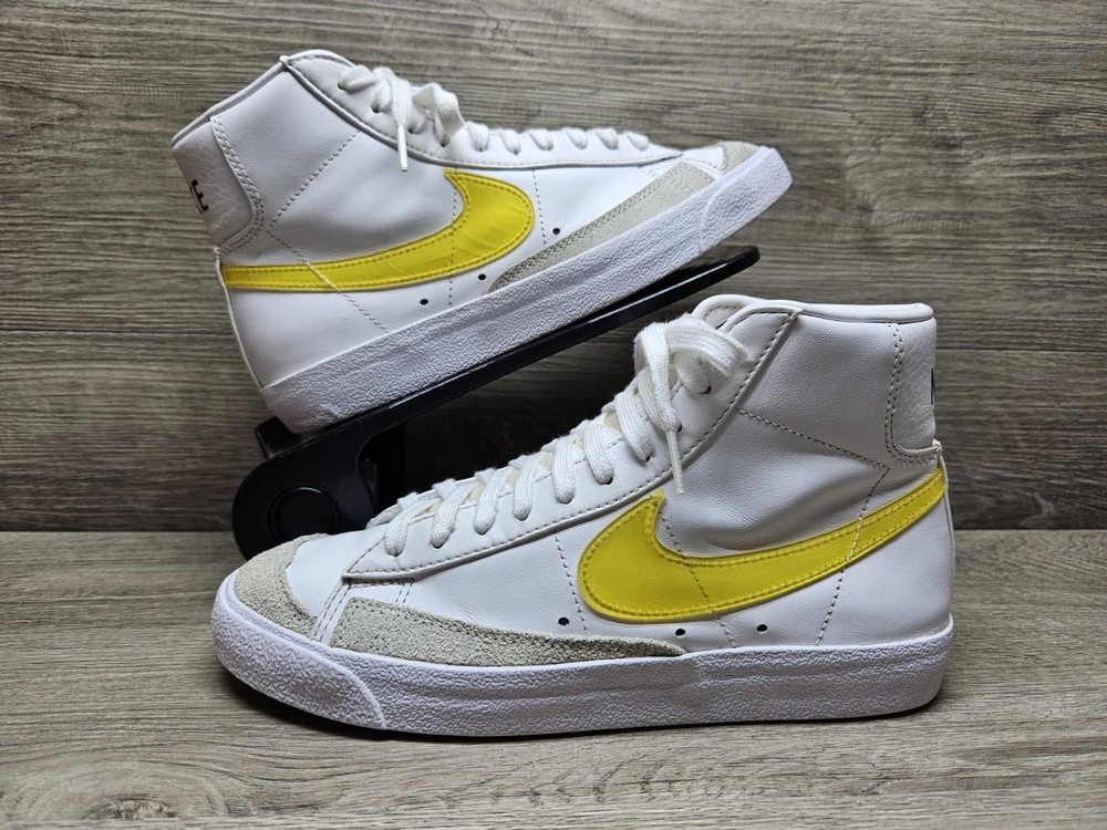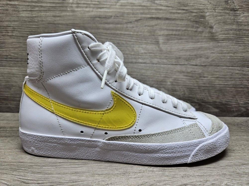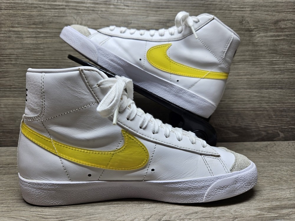 Elevate your sneaker game with these Nike Blazer Mid '77 sneakers in a classic white colorway. These sneakers feature a lace-up closure and mid-top shaft style, making them perfect for any active occasion whether it's for gym training, walking, school, skateboarding, basketball or running and jogging. The blended fabric and leather upper material provide a cushioned and comfortable fit while the rubber outsole ensures breathability and performance. One of the size label inside the shoe is missing, minor foam tearing on the tongue of the shoes shown on picture. Professionally cleaned and sanitized. No box included. These Nike Blazer sneakers also come in UK size 5.5 and EU size 39. The foam insole and leather lining material further enhance the comfort and breathable features of the shoe. The sneakers also showcase the Nike logo accents, adding a touch of style to the overall design. Get your hands on these Nike Blazer Mid '77 sneakers to add a vintage touch to your wardrobe.