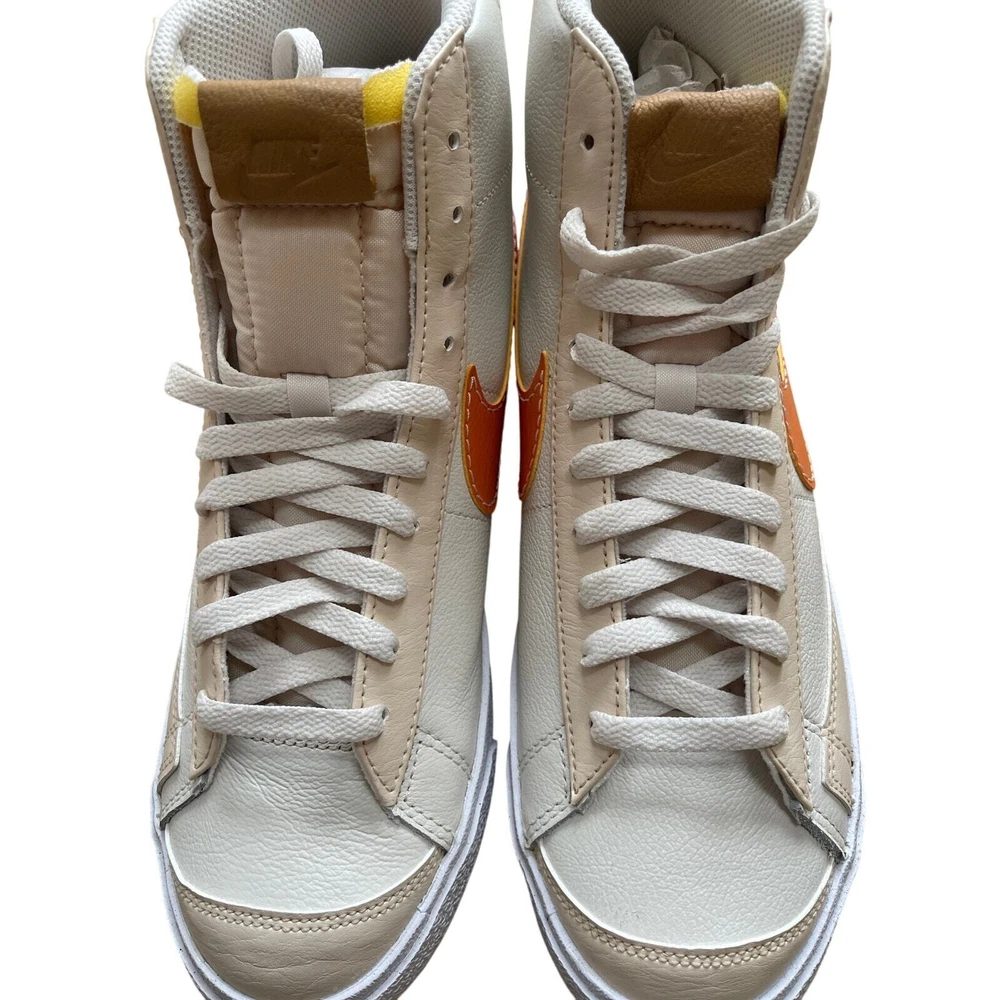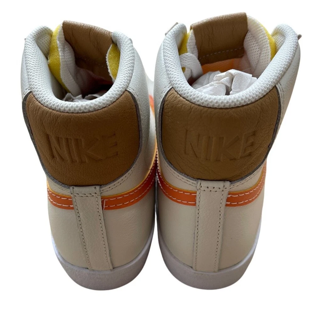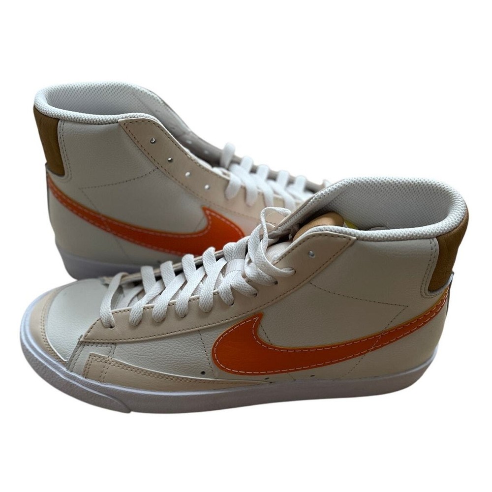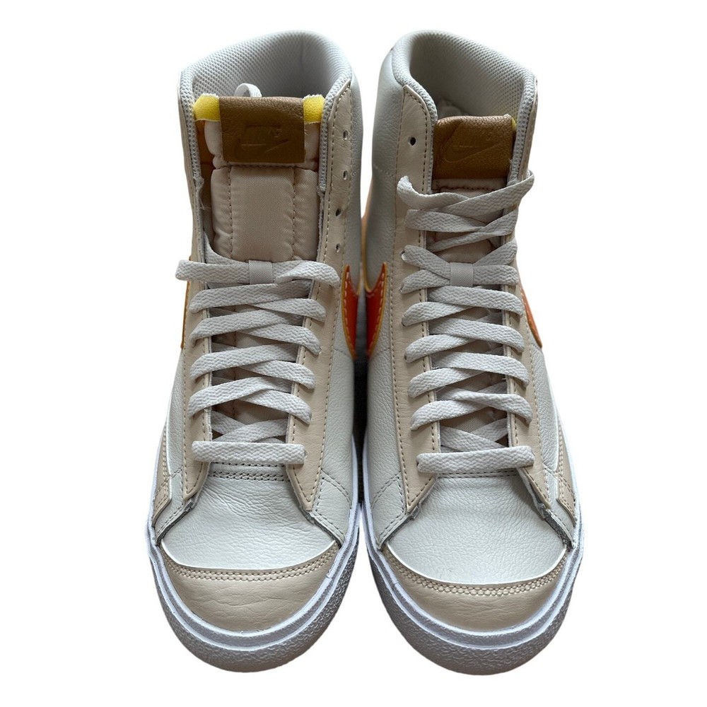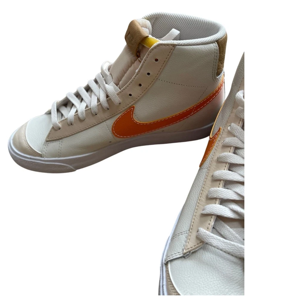 <![CDATA[<div>BRAND NEW IN BOX Nike Blazer Mid '77 Phantom/Hot Curry/Pearl White DQ7674 The Nike Blazer Mid ‘77 EMB makes an impression on any Blazer collection. The silhouette takes on a leather upper with additional leather accents that are seen at the tongue and spine. Thematic detailing arrives at the sock liners, while the foam midsole adds a comfortable component. A herringbone-traction rubber outsole wraps up the design. Authentic and inspected by Swoosh Size: Men's 9.5 (See measurement photos to ensure proper fit). Condition: Brand new in box; Tiny blemish on the sole (pictured).