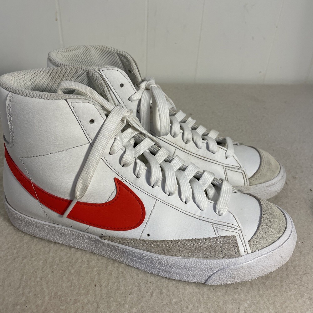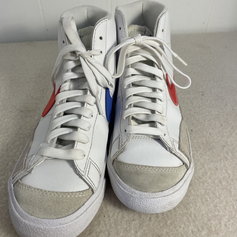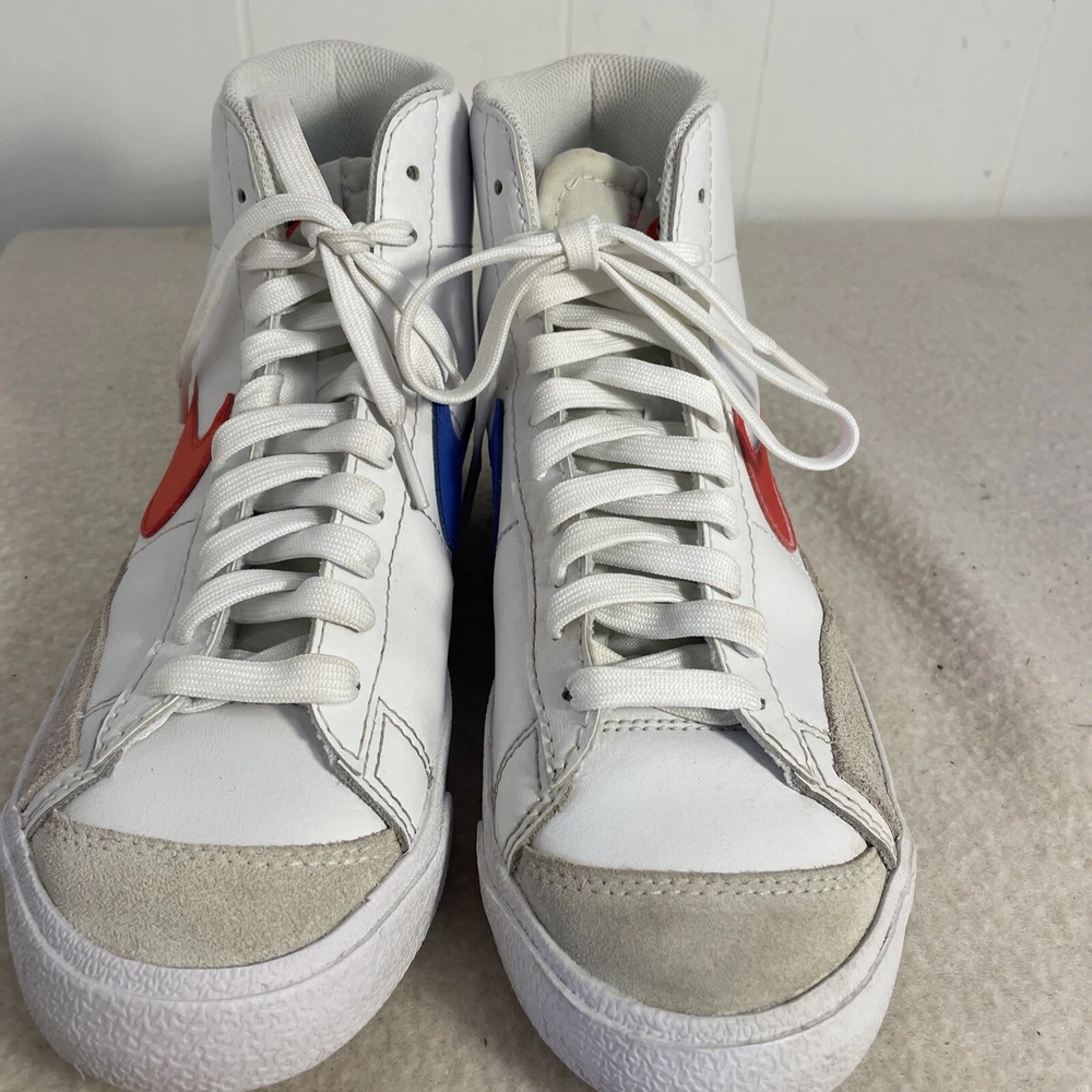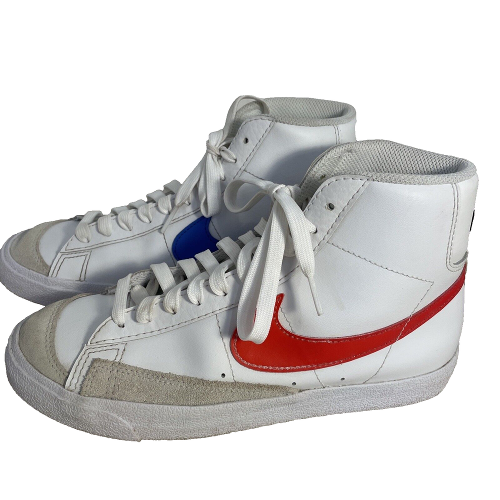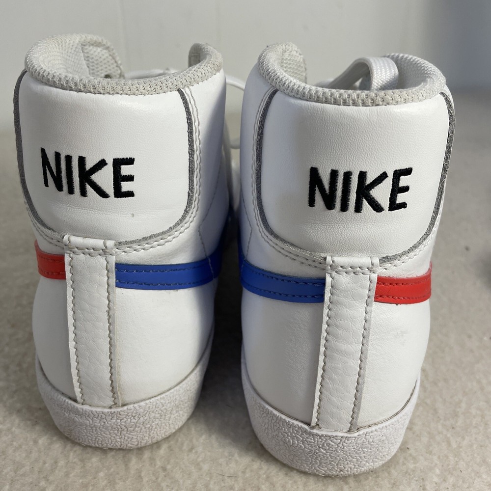Elevate your sneaker game with these Nike Blazer Mid 77 GS sneakers. The white leather upper features a round toe and lace-up closure for a secure fit. The mid-top shoe shaft style and standard shoe width provide comfort and breathability, making it perfect for walking, school, skateboarding, and basketball. These sneakers are adorned with accents such as lace and the Nike logo, giving it a retro and outdoor athleisure vibe. The shoes are perfect for any season, whether it's winter, summer, fall, or spring. Size 6.5Y Please look at all photos as they are an important part of the description.
