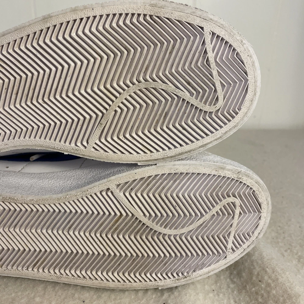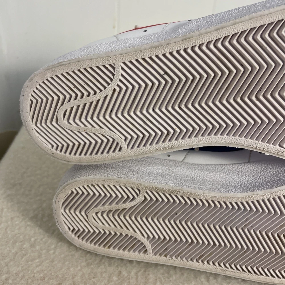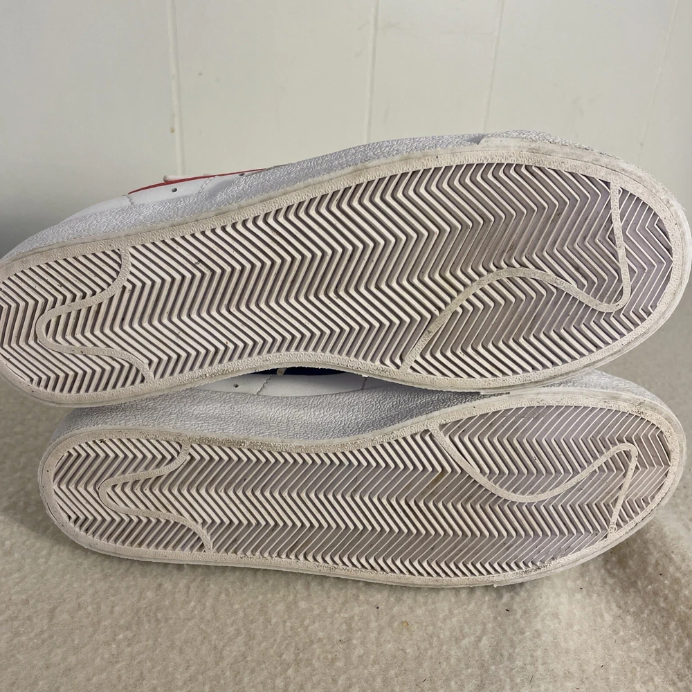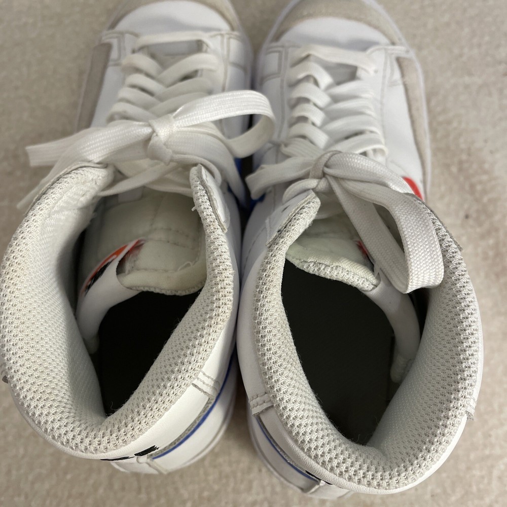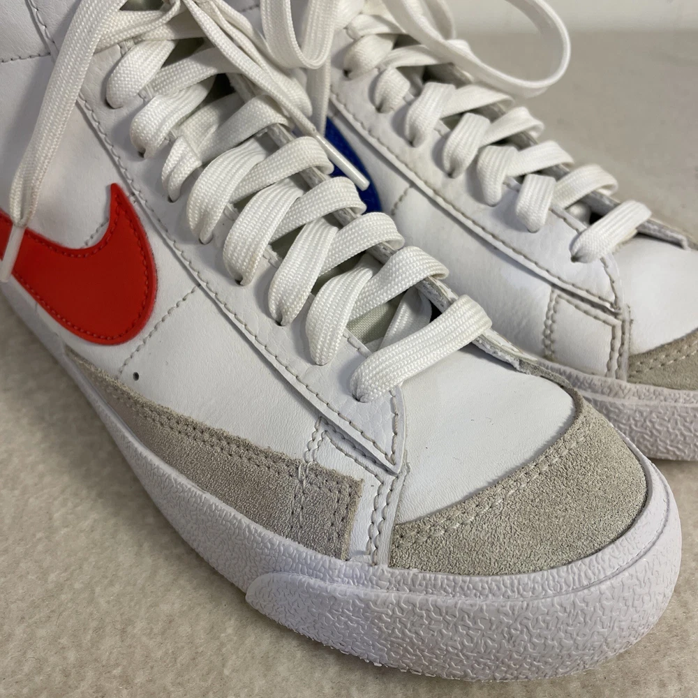 Elevate your sneaker game with these Nike Blazer Mid 77 GS sneakers. The white leather upper features a round toe and lace-up closure for a secure fit. The mid-top shoe shaft style and standard shoe width provide comfort and breathability, making it perfect for walking, school, skateboarding, and basketball. These sneakers are adorned with accents such as lace and the Nike logo, giving it a retro and outdoor athleisure vibe. The shoes are perfect for any season, whether it's winter, summer, fall, or spring. Size 6.5Y Please look at all photos as they are an important part of the description.