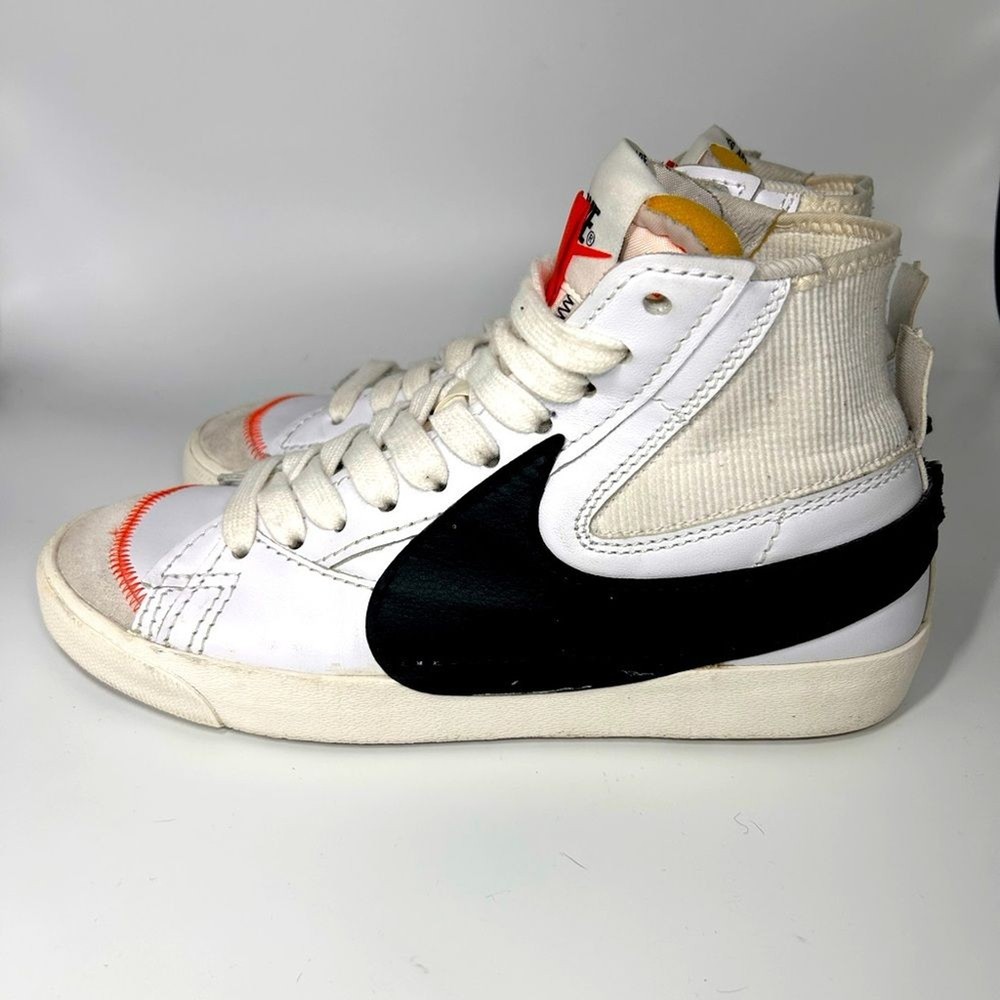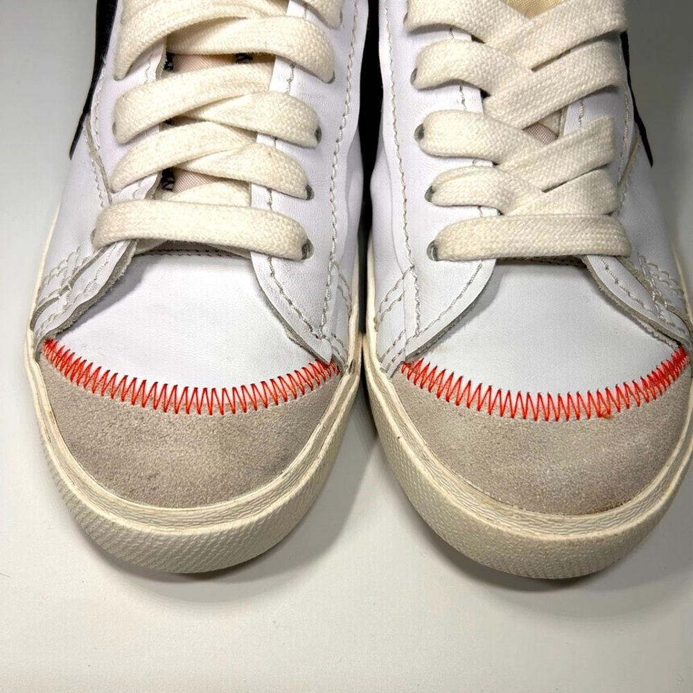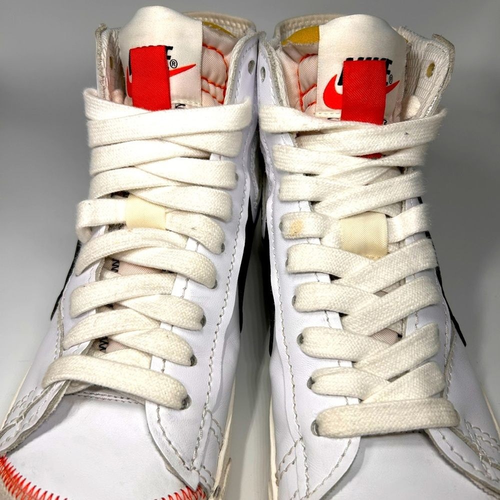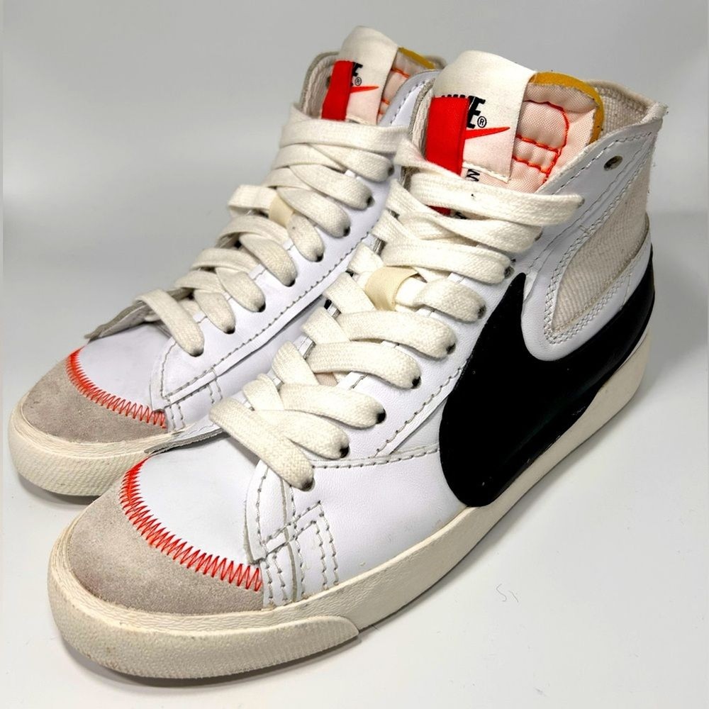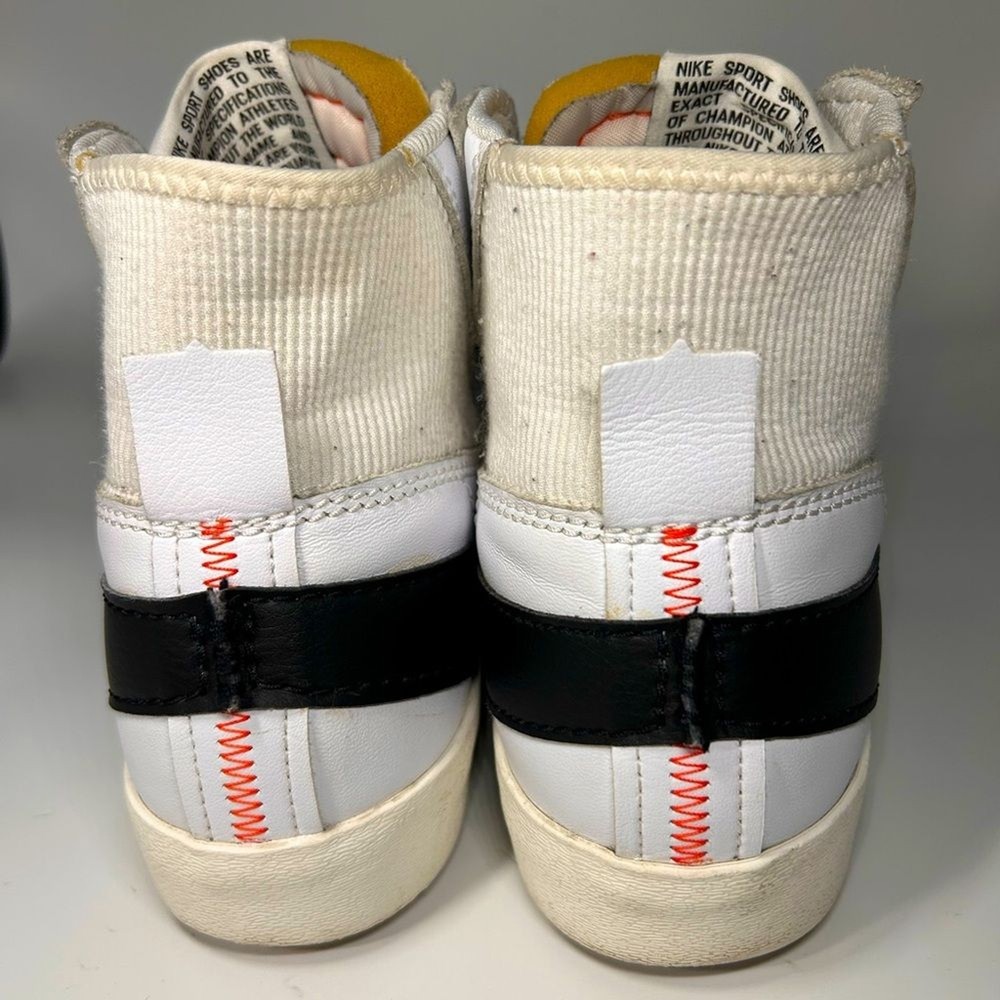 Gently used Nike Blazer, Jumbo Swoosh, white, black, and orange. Excellent condition.