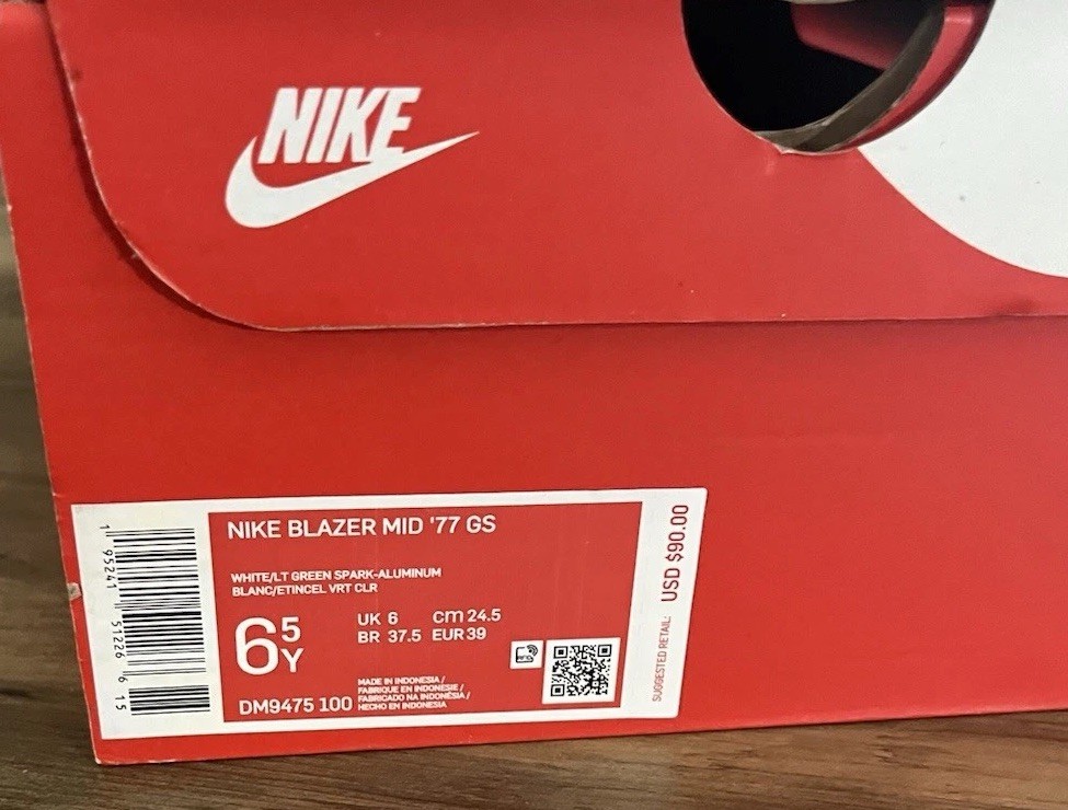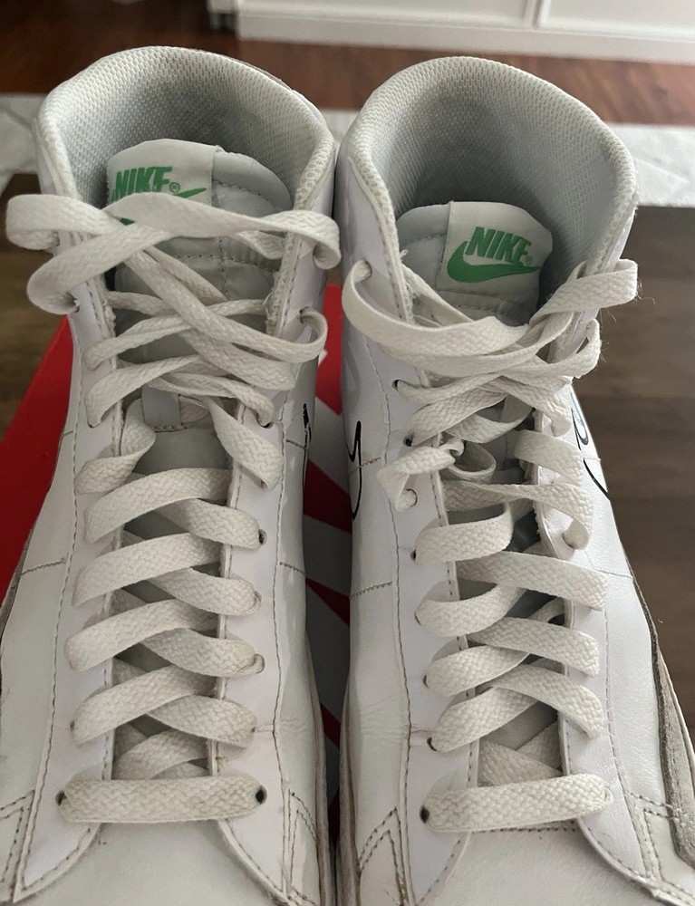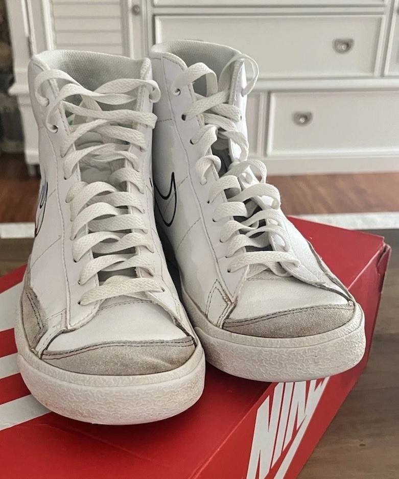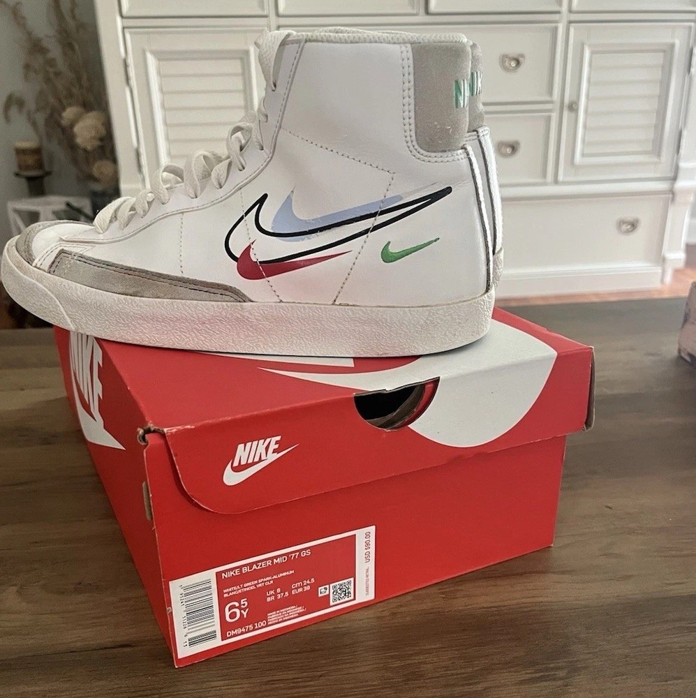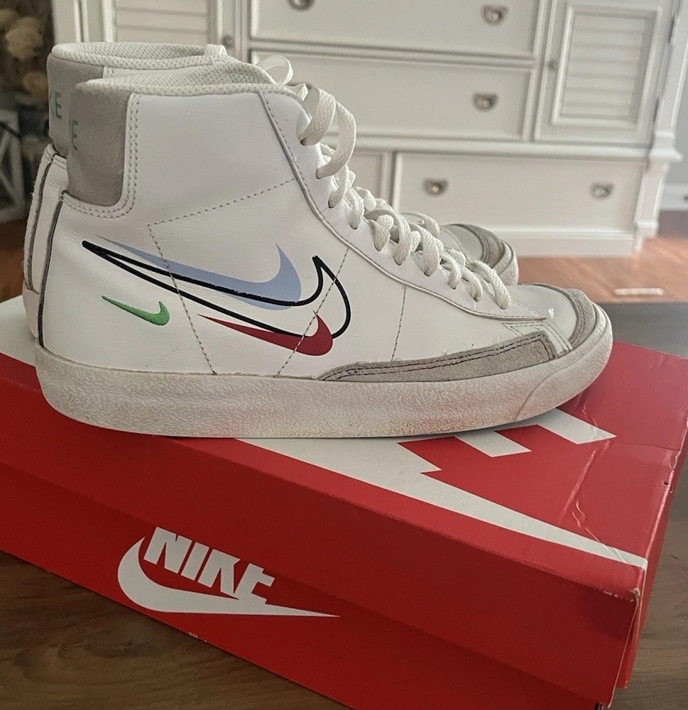 The Nike Blazer Mid '77 'Multi Swoosh in size 6.5 features a mid-top shaft style with a white upper made of leather. This sneaker from the Nike Kyrie line combines athletic style with a bold design, including Swoosh branding in different colors like Team Orange and University Gold. With a release date of 2019, this elegant and trendy shoe is perfect for men looking to make a statement with their footwear.