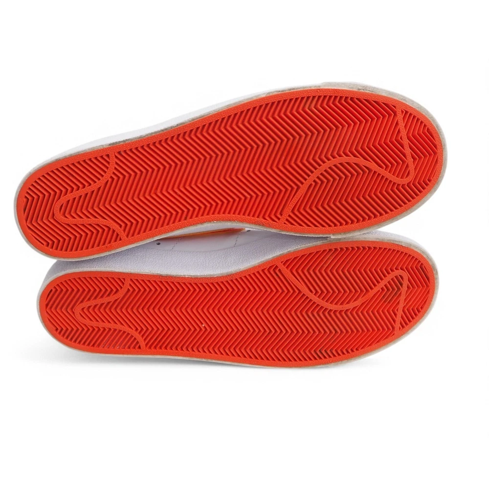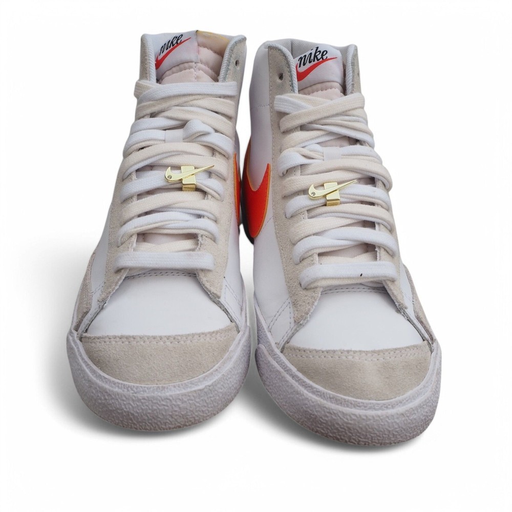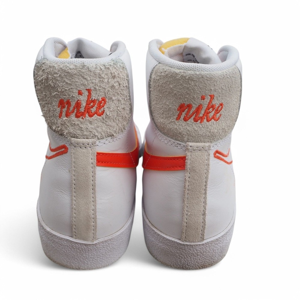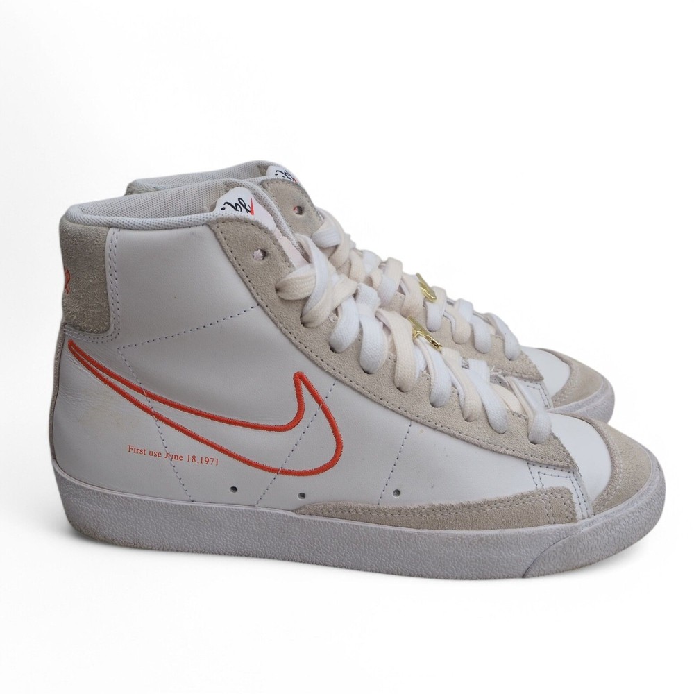 Brand: Nike Blazer Mid '77 SE 'First Use' Casual Sneakers DH6757-100 Gender: Women's Color: White/Summit White/Sail/Orange Size: US 9.5 UK 7 EU 41 Condition: These shoes are in excellent pre-owned condition. The collar, heels, and soles are in great shape. Please refer to all photos. Shipping Time: Your item ships within 1 Business day. The Nike Blazer Mid '77 SE 'First Use' Casual Sneakers celebrate the origin of the iconic Swoosh logo with a blend of heritage style and unique detailing. These sneakers feature a classic white leather upper, providing a clean and versatile backdrop. The defining detail is the "First Use" theme, highlighted by an outlined Swoosh on the lateral side with "First Use June 18, 1971" printed nearby, commemorating the date the Swoosh was first used. Additional details include a "First Use" lace dubrae, stitched detailing tracing the original Swoosh design, gold-tipped laces, and a white sole unit for a timeless look. These Blazers offer a subtle nod to Nike's history while maintaining the shoe's signature style, making them a great choice for those who appreciate a blend of classic design and meaningful details.
