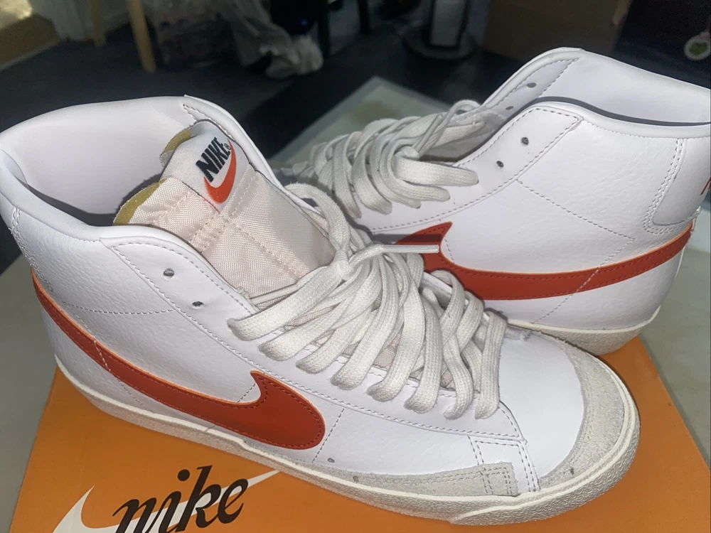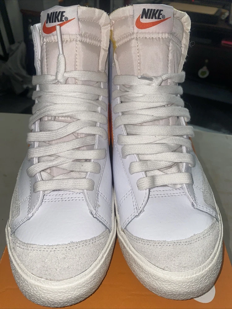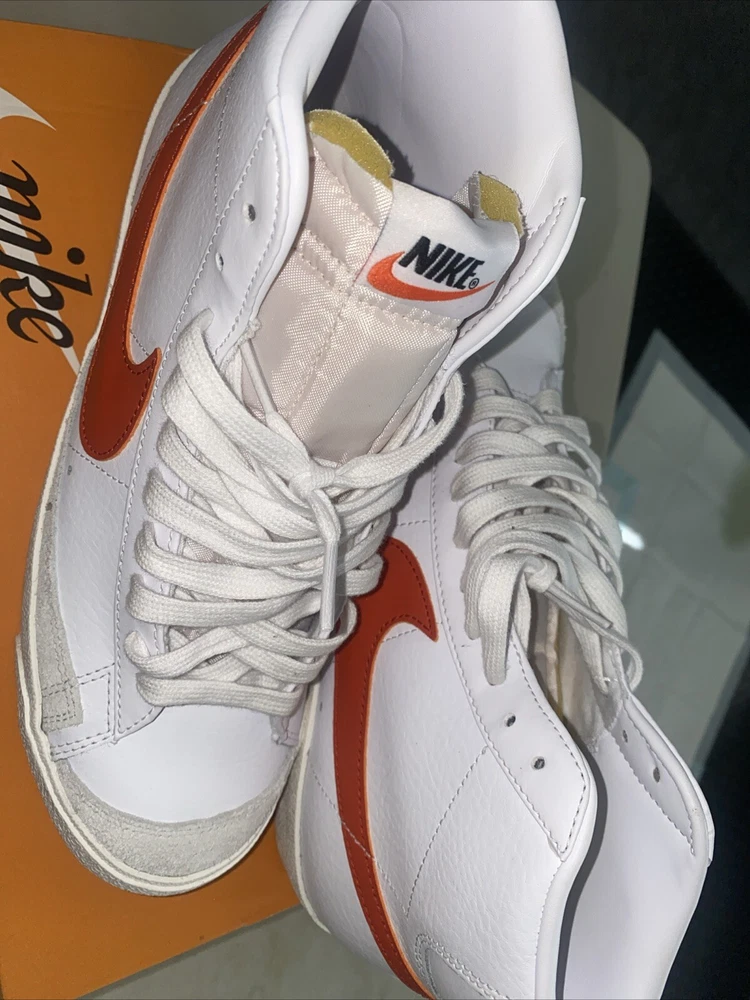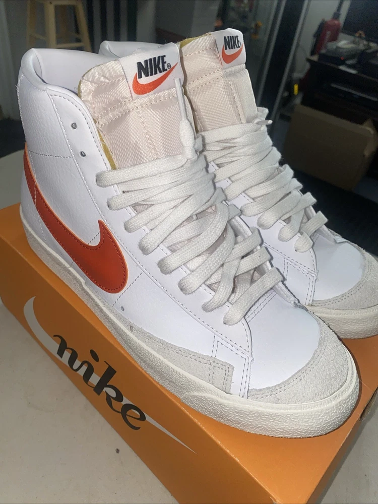 Payment must be paid within 48 hours. Sneakers were worn only one time sneakers are almost brand new Elevate your sneaker game with these Nike Blazer Mid 77 Vintage athletic shoes. With a stylish white and orange colorway, these sneakers are perfect for any athletic occasion. The mid-top shoe shaft style provides a comfortable fit, while the BQ6806-110 style code ensures you're on-trend. These shoes are designed for men and come in a US shoe size 9.5. The Nike Blazer model is a classic athletic shoe that is both stylish and functional. These sneakers are perfect for any man looking to upgrade their shoe collection.
