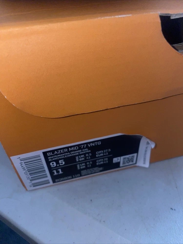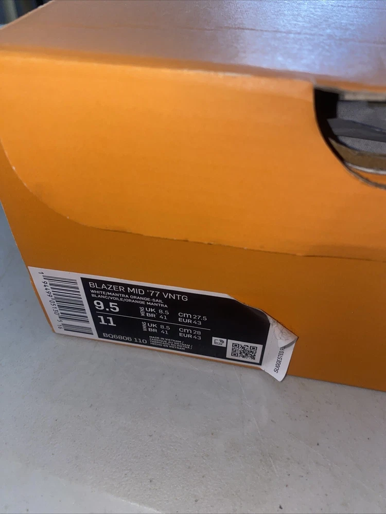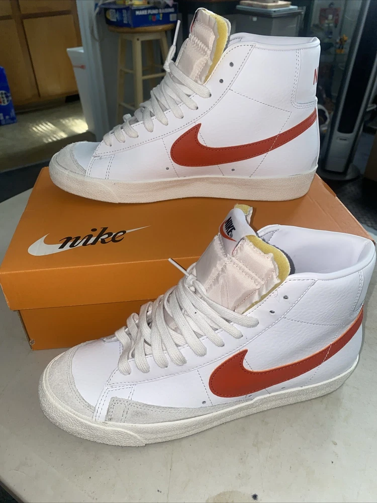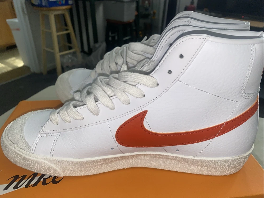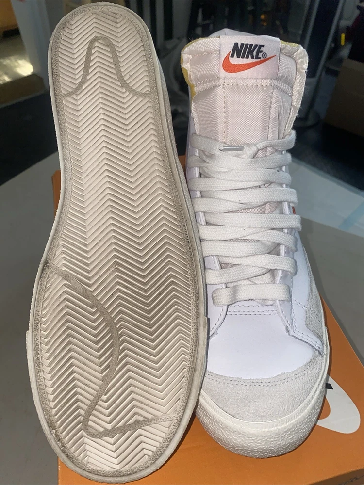 Payment must be paid within 48 hours. Sneakers were worn only one time sneakers are almost brand new Elevate your sneaker game with these Nike Blazer Mid 77 Vintage athletic shoes. With a stylish white and orange colorway, these sneakers are perfect for any athletic occasion. The mid-top shoe shaft style provides a comfortable fit, while the BQ6806-110 style code ensures you're on-trend. These shoes are designed for men and come in a US shoe size 9.5. The Nike Blazer model is a classic athletic shoe that is both stylish and functional. These sneakers are perfect for any man looking to upgrade their shoe collection.