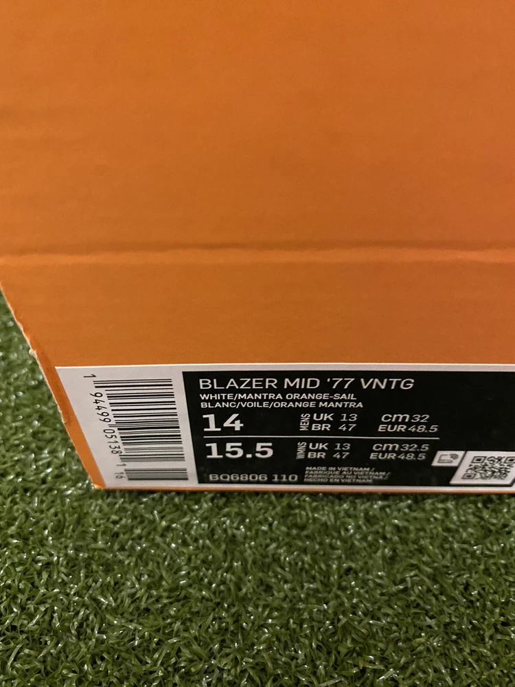 Brand new in box (box top removed by Nike Factory Store - see pics). Item will ship DOUBLE BOXED via 2 to 3 day PRIORITY MAIL. Nike Blazer Mid '77 Vintage Size Men's 14 BRAND NEW Size : Men's 14/ UK 13 Color : White Orange Sail PRODUCT ID : BQ6806 110 See our feedback and buy in confidence that you are getting a quality AUTHENTIC Nike Product from a 20 year eBay seller! Buy Now for Fast & FREE SHIPPING! All items ship the next business day (M-F). Most items purchased by 12pm Eastern time will ship the same day.