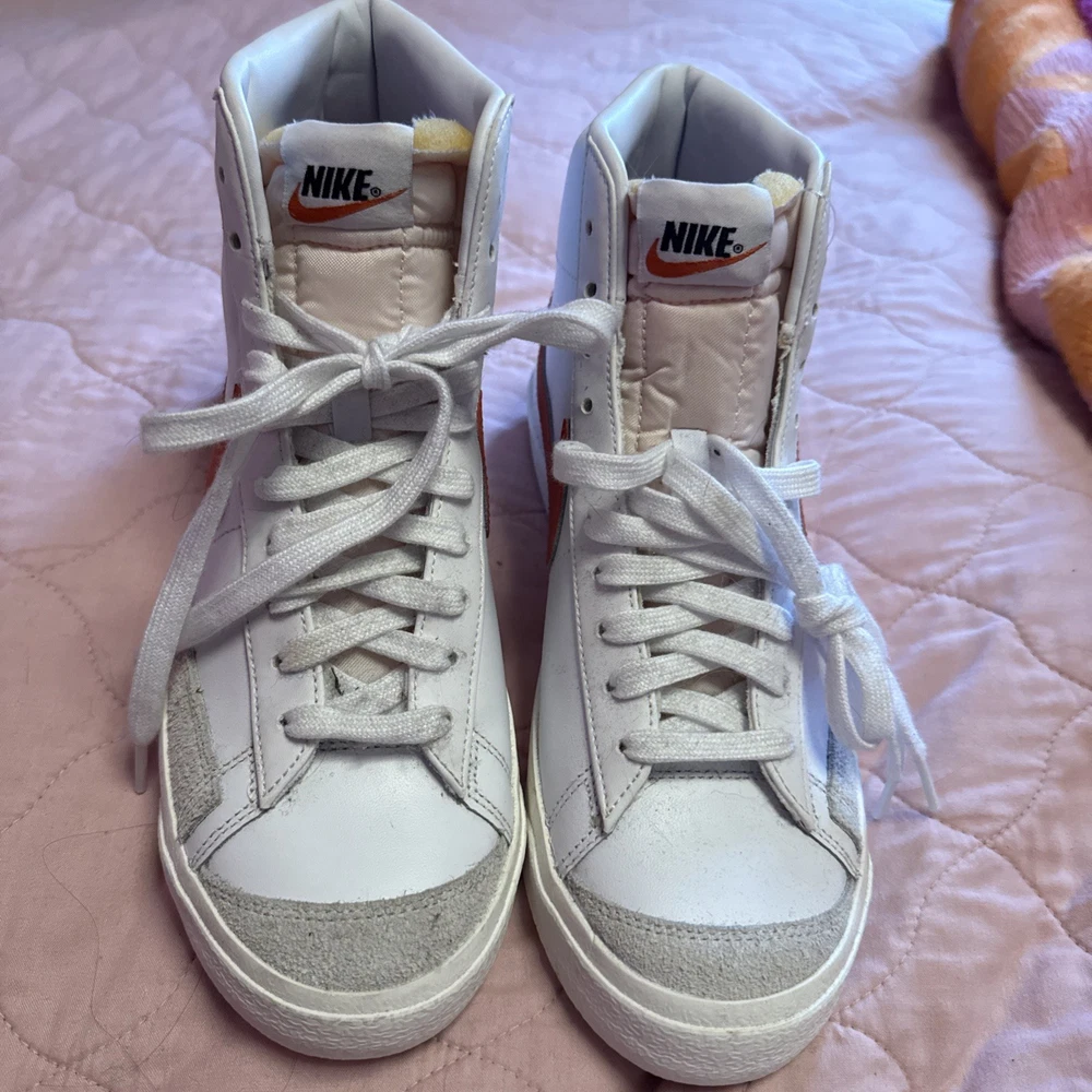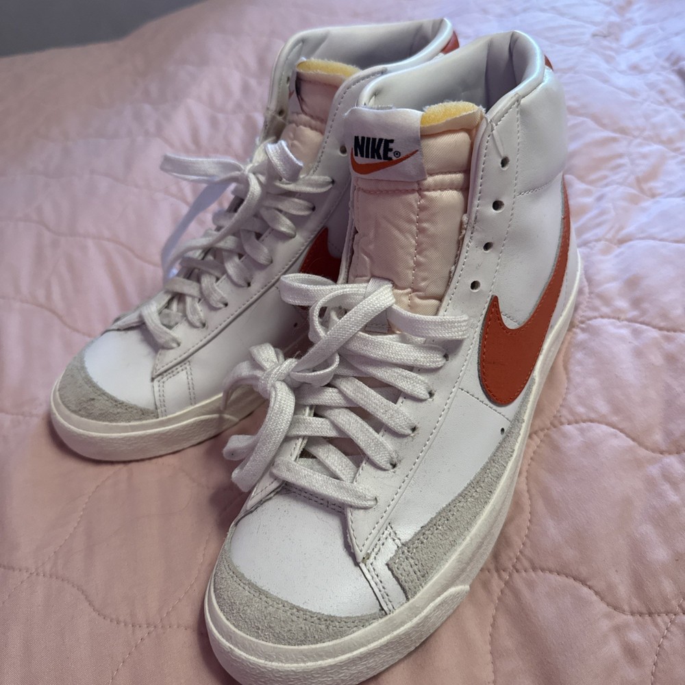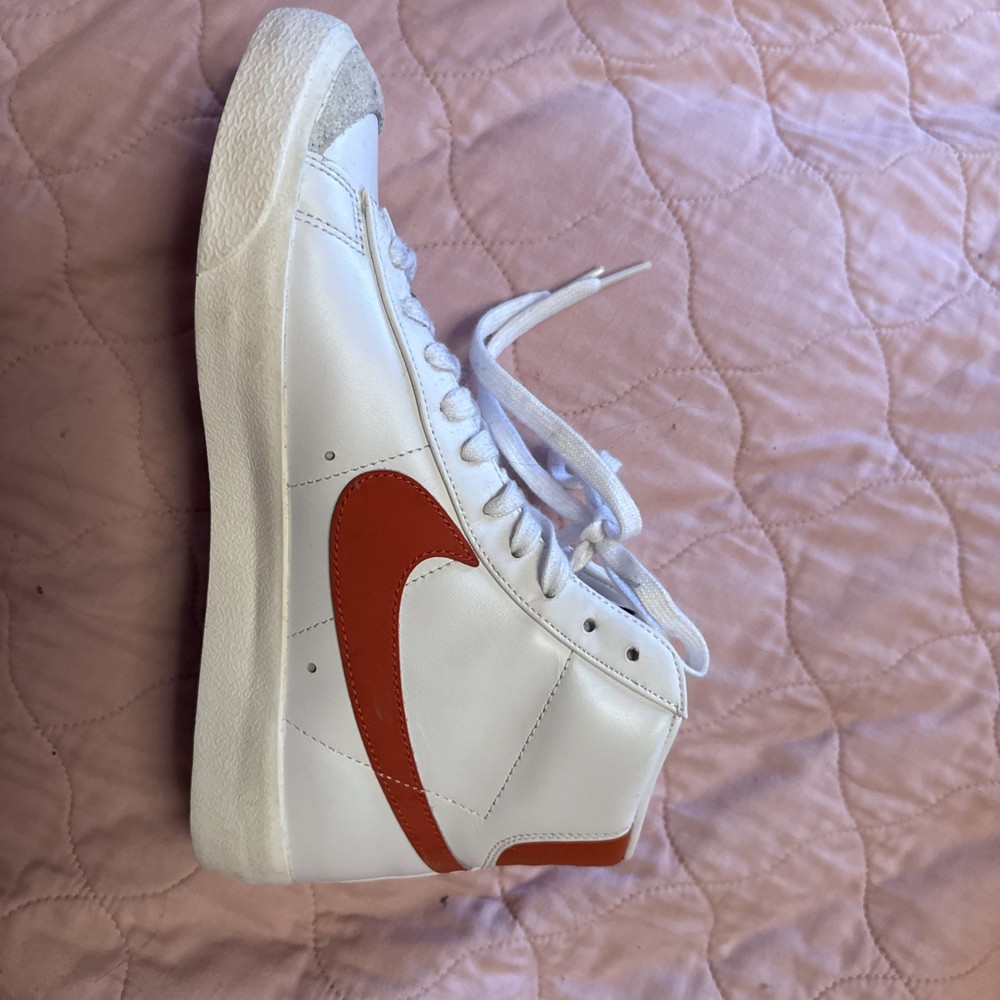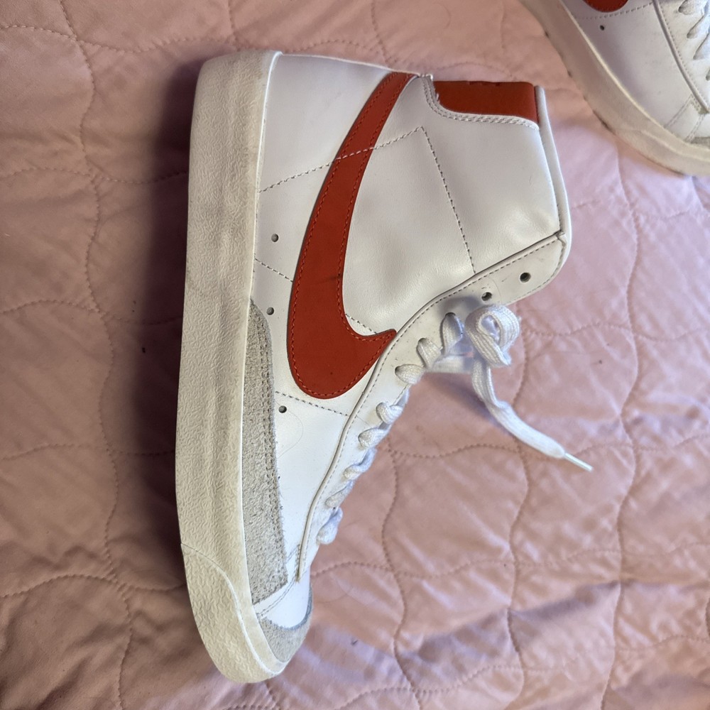Step up your sneaker game with the Nike Blazer Mid '77 in a striking White Sail with Cinnabar Orange accent color. This timeless mid-top sneaker, in a women's size 9.5, seamlessly blends classic style with modern comfort. The vivid red leather upper, complemented by the iconic Nike logo accents, makes for an eye-catching addition to any outfit. Crafted with quality, the shoe features a sleek lace-up closure ensuring a snug fit, while the durable construction promises longevity. Whether you're cruising the city streets or attending a casual event, these sneakers will have you standing out in style. Shoes are new, never worn, but no box.