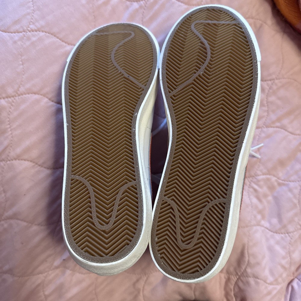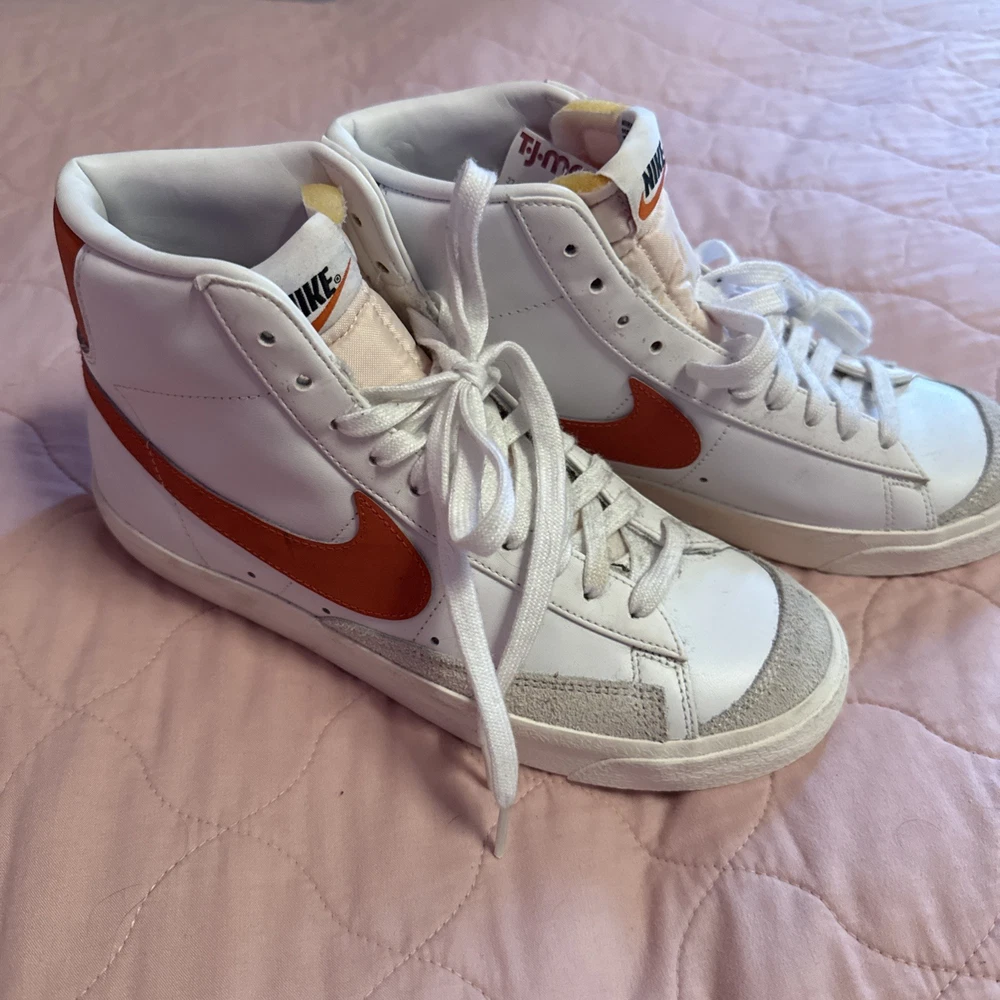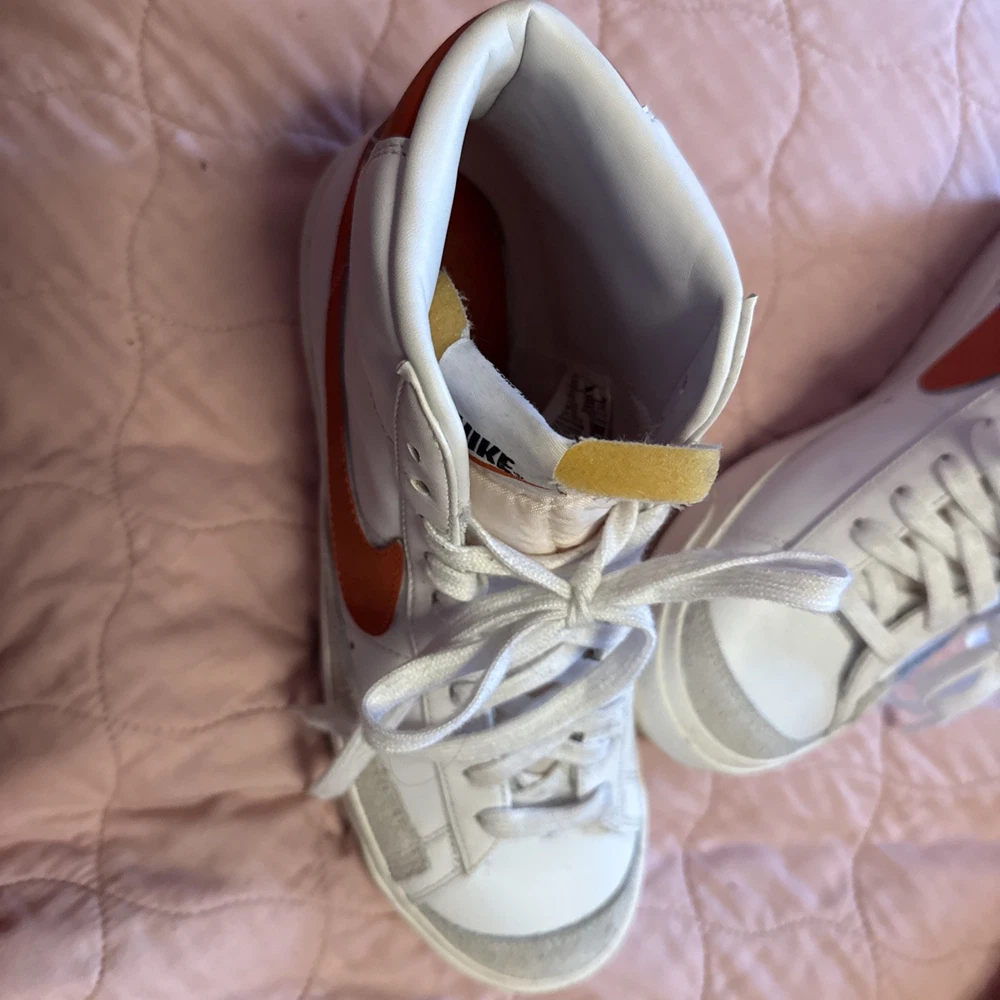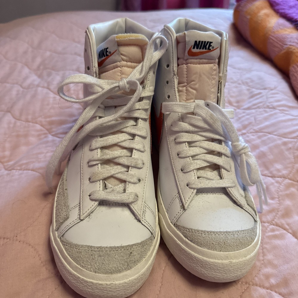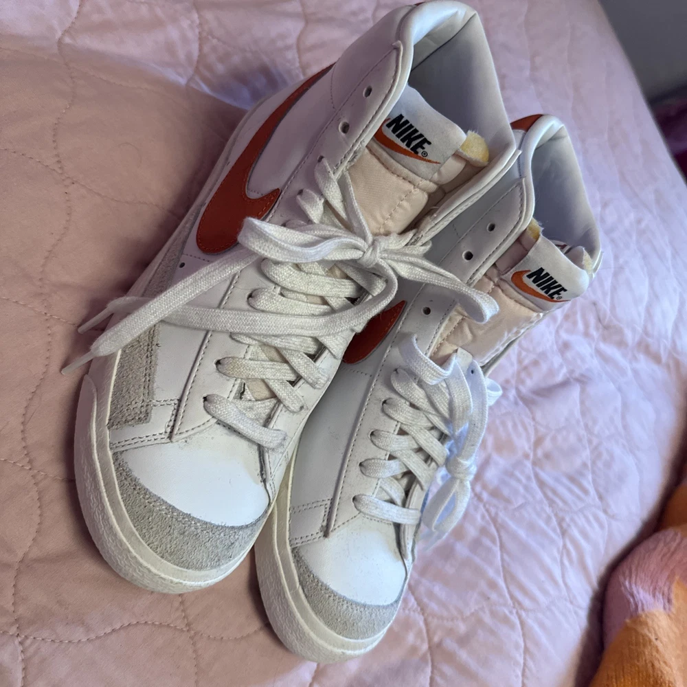 Step up your sneaker game with the Nike Blazer Mid '77 in a striking White Sail with Cinnabar Orange accent color. This timeless mid-top sneaker, in a women's size 9.5, seamlessly blends classic style with modern comfort. The vivid red leather upper, complemented by the iconic Nike logo accents, makes for an eye-catching addition to any outfit. Crafted with quality, the shoe features a sleek lace-up closure ensuring a snug fit, while the durable construction promises longevity. Whether you're cruising the city streets or attending a casual event, these sneakers will have you standing out in style. Shoes are new, never worn, but no box.