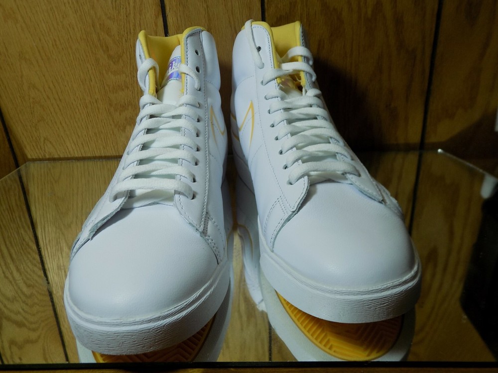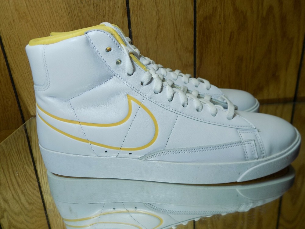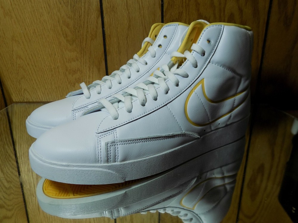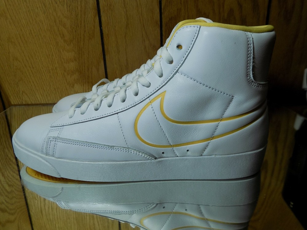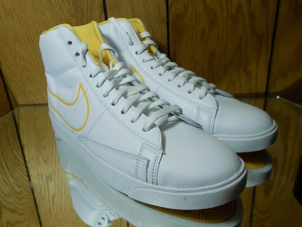 Here are a brand new pair of Nike Blazer Mid White Leather, Orange Swoosh Men Size 10 CJ3643-100. The lid on the box is missing. Box is slightly damaged