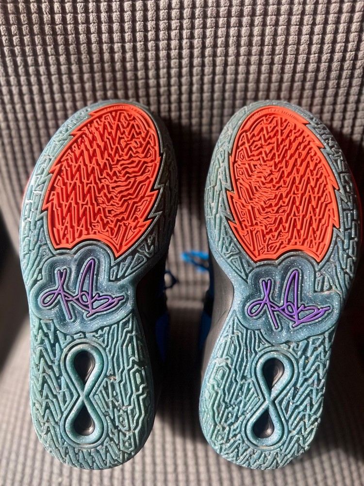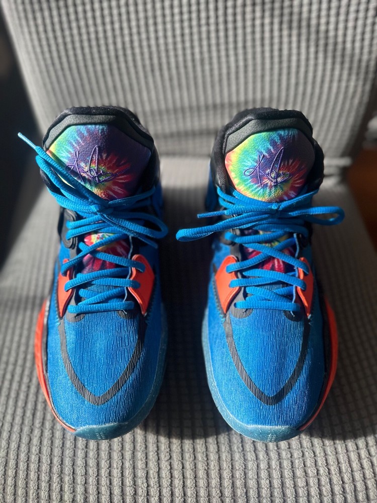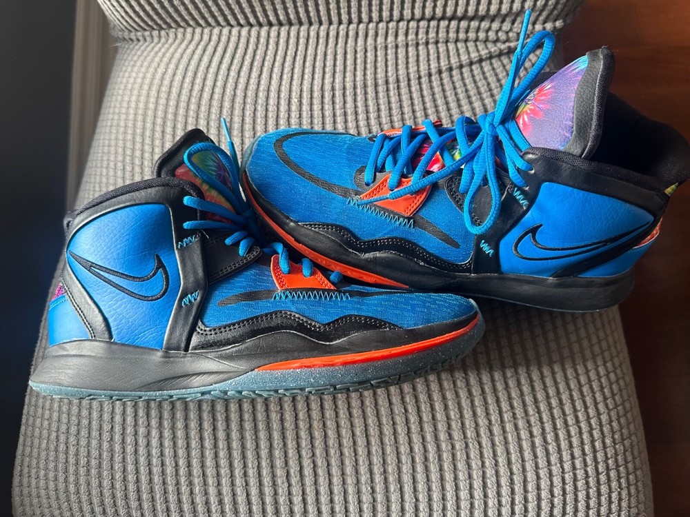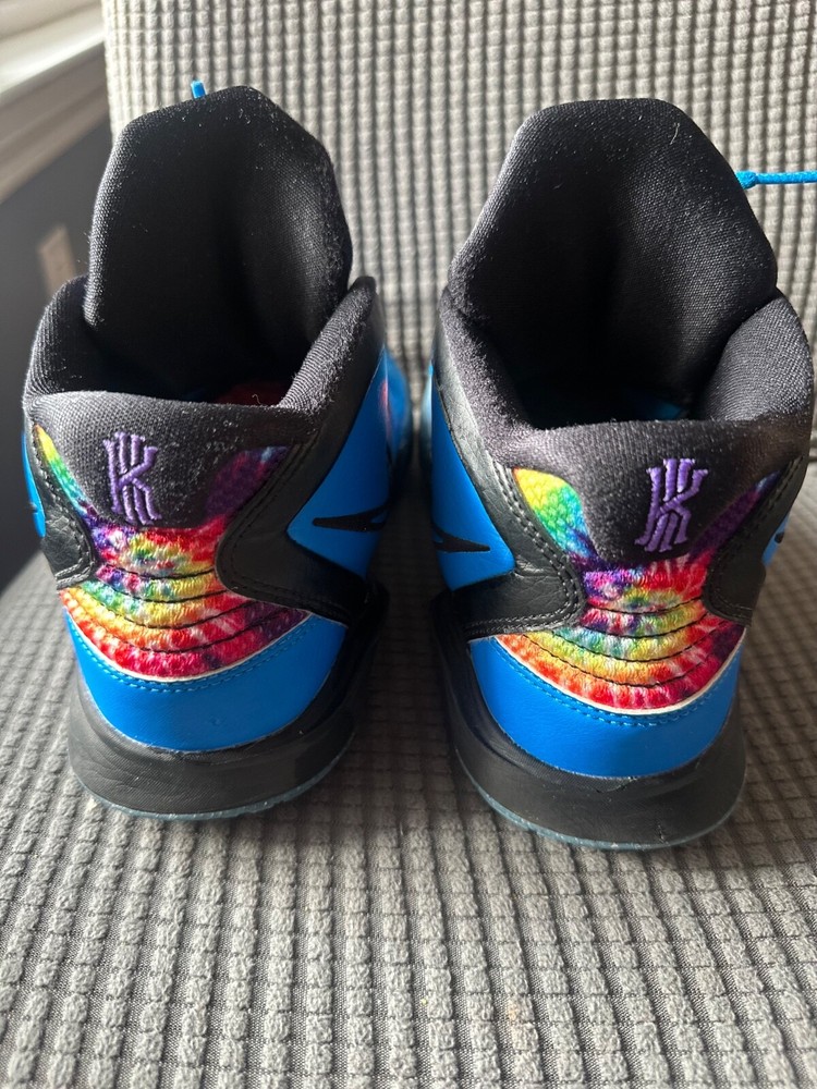 Gently used. Great condition. Big kids 7Y. The Nike Kyrie Infinity SE Grade School 'Tie-Dye' sneakers feature a vibrant tie-dye pattern in colors of Photo Blue, Psychic Purple, Rush Orange, and Black. These athletic shoes have a mid-top style with a standard shoe width, suitable for grade school sizes. The Nike Kyrie Infinity model offers comfort and style with a mesh upper material and a Nike product line design, perfect for young athletes or sneaker enthusiasts looking for a unique and colorful addition to their shoe collection.