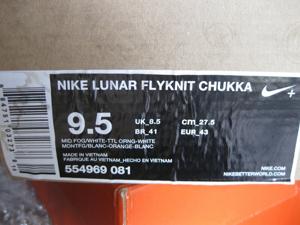 Product Info Nike Lunar Flyknit Chukka Mid night fog ORANGE Sz 9.5 New with box (the condition of box isn't good) Sz us 9.5 uk 8.5 Asia 275 I sell only authentic items (10000000% authentic) I hate fake items I am an honest seller Shipping All items will be shipped to worldwide doubled box via EMS(Express Mail Service) All items will be shipped within 2days I will send items to buyers as a gift and i am not responsible for customs tax