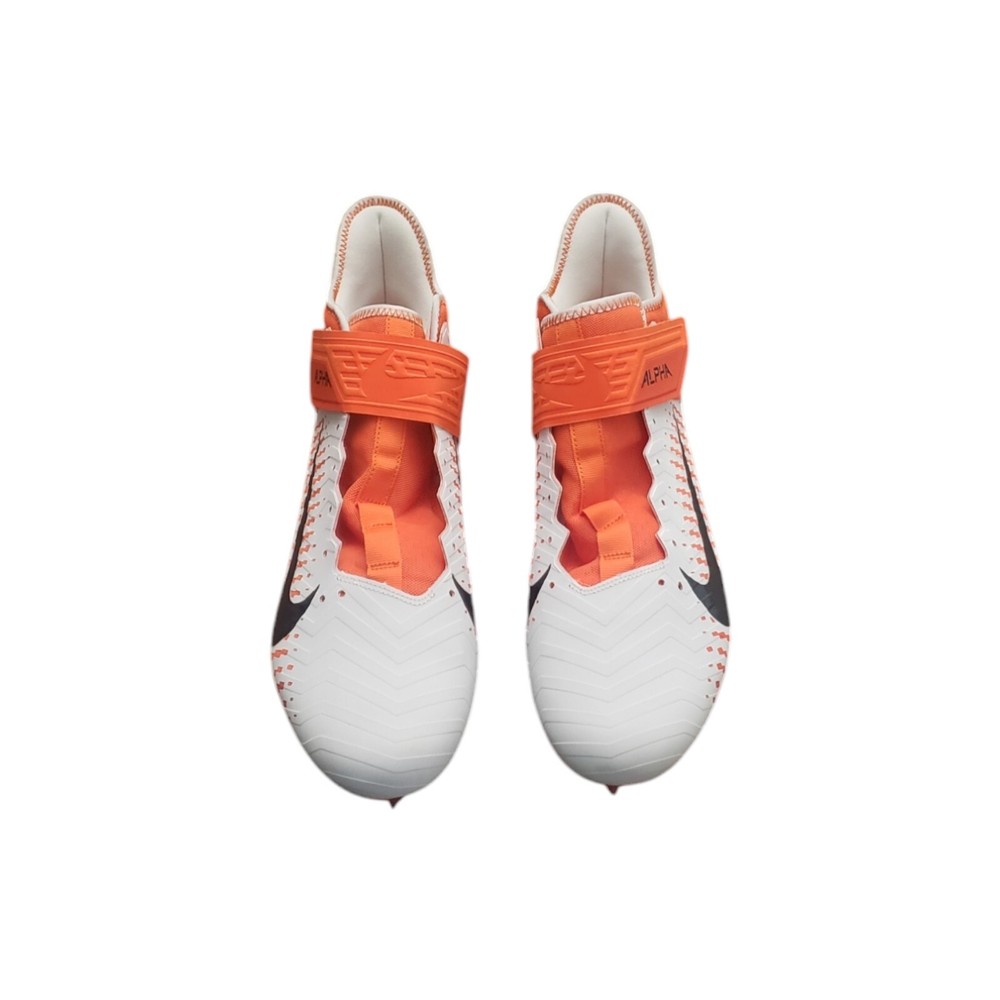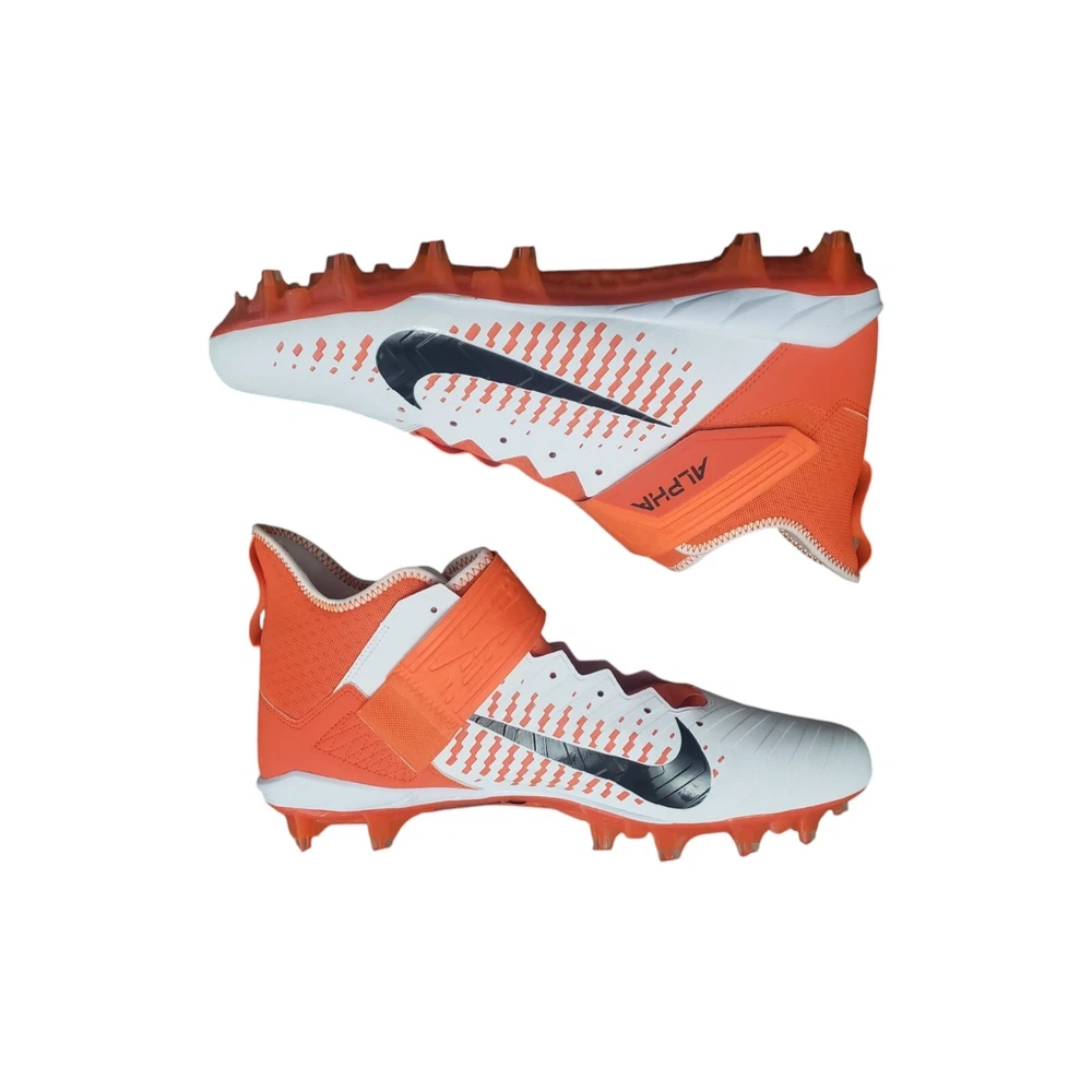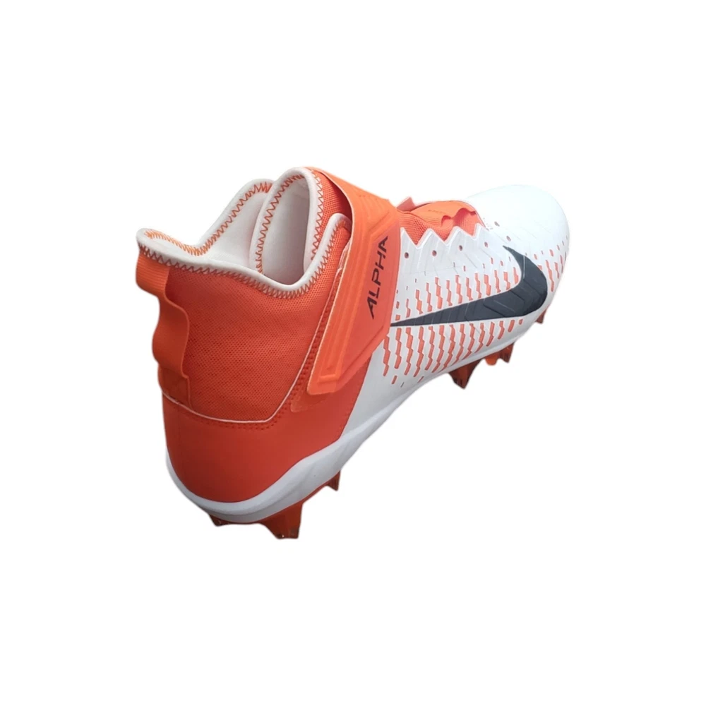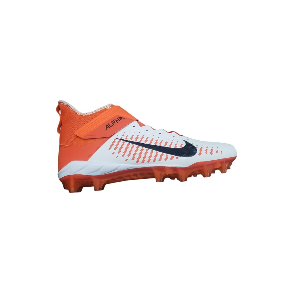 Nike Men's Alpha Menace Pro 2 Mid Football Cleat Shoes White / Orange Size 15 The Nike Alpha Menace Pro 2 Mid takes the traditional cleat to the next level. Fabric and synthetic materials create a durable design that holds your foot securely for quick cuts. The TPU propulsion plate provides support and a responsive feel. Nike Alpha Menace Pro Mid 2 Football Cleat Shoes: No Shoelaces, need close to a 70-inch lace Synthetic combines with a textile layer for secure comfort Phylon foam provides lightweight cushioning Molding at the toe helps resist abrasion Strap with a hook-and-loop closure secures the fit Tongue wraps from the lateral side of the shoe to the arch, eliminating seams at the top of the foot TPU propulsion plate provides support and a responsive feel Color: White / Brilliant Orange / Black Size: 15, UK 14, EUR 49.5