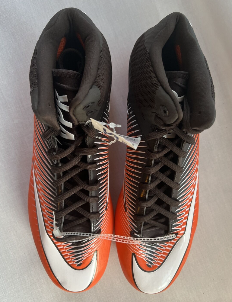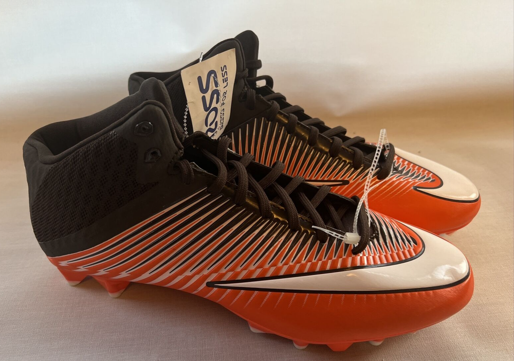 Step up your game with these Nike Vapor Speed 2 football cleats in a striking orange and black color block pattern. With lace-up closure and mid-top shoe shaft style, these cleats provide the perfect fit for any football activity. The cleats come in US size 13 and EU size 47.5, ensuring comfort for men on the field. Made by Nike and featuring the brand's signature swoosh, these athletic shoes are part of the Nike Vapor product line and boast the style number MPN 846443-807. These football shoes offer cleats for superior grip and are perfect for any football enthusiast. The upper material of the shoes is unknown, but they are manufactured in Vietnam and are sure to provide peak performance during any football game.