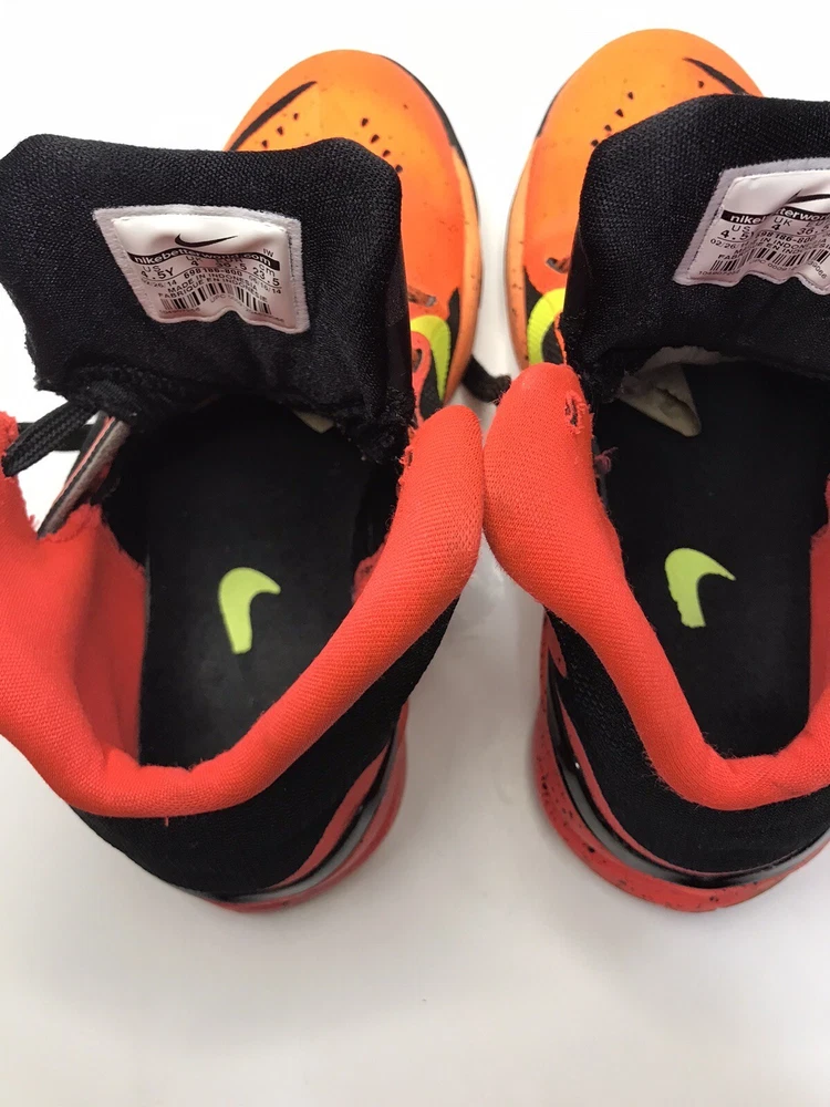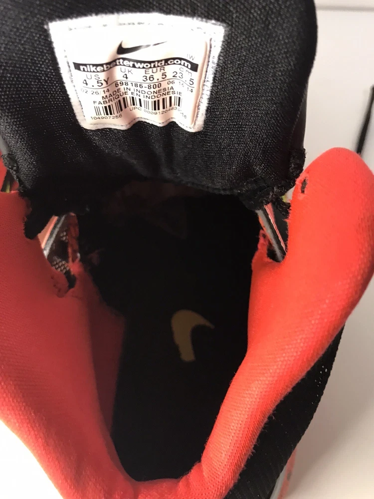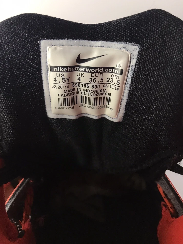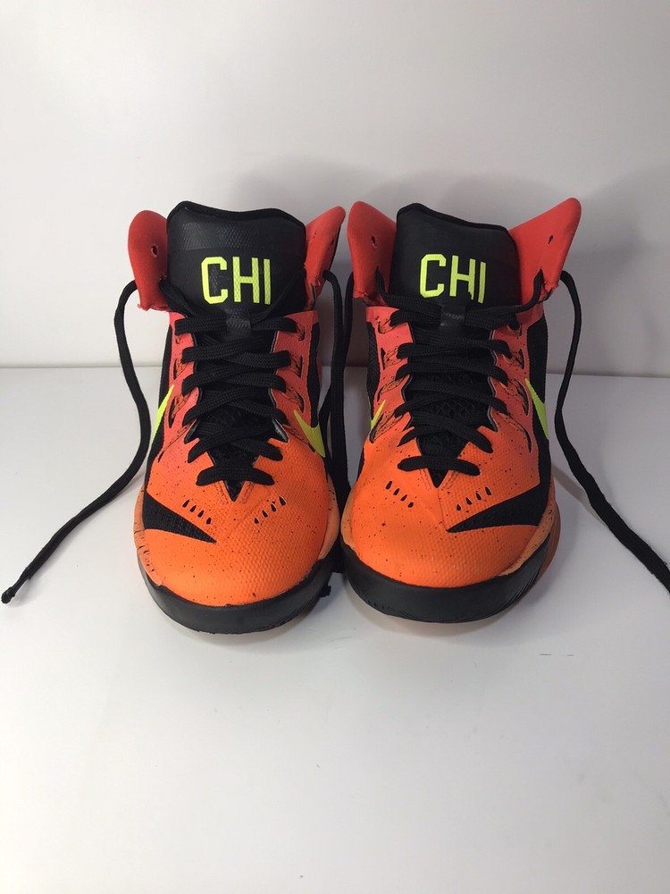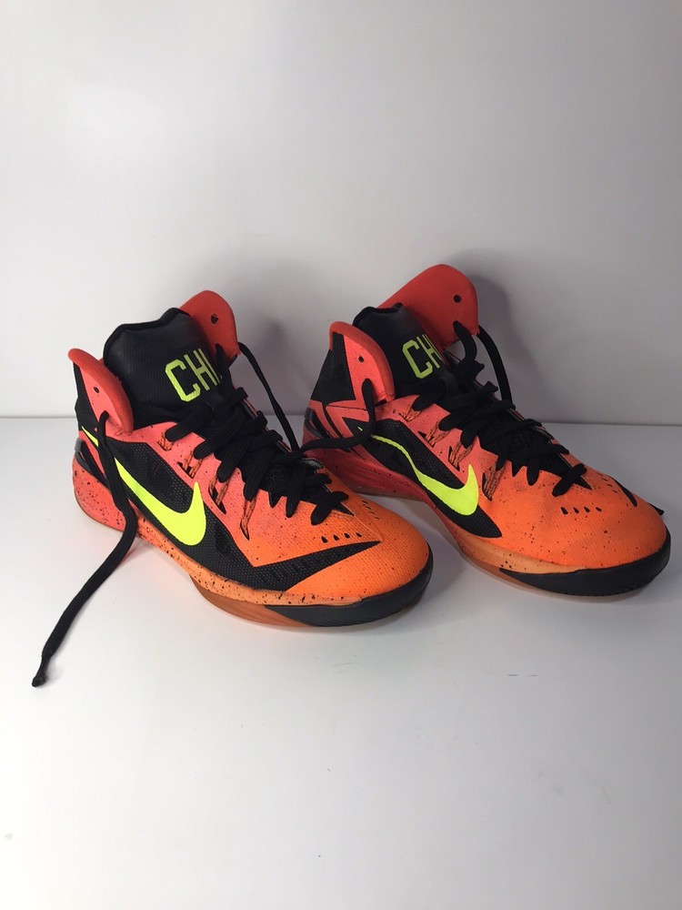 For sale is a pair of Nike Hyperdunk 2014 Chi sneakers in orange color, with style code 698186-800. These sneakers are designed for boys who engage in basketball and have a mid-top shoe shaft style. The shoes were released in 2014 and belong to the Nike Hyperdunk product line, with model number 698186-800. The US shoe size for this pair is 4.5, The sneakers are pre-owned but still in good condition, ready to be used by their new owner. The soles are transparent orange that let the black speckles show through,